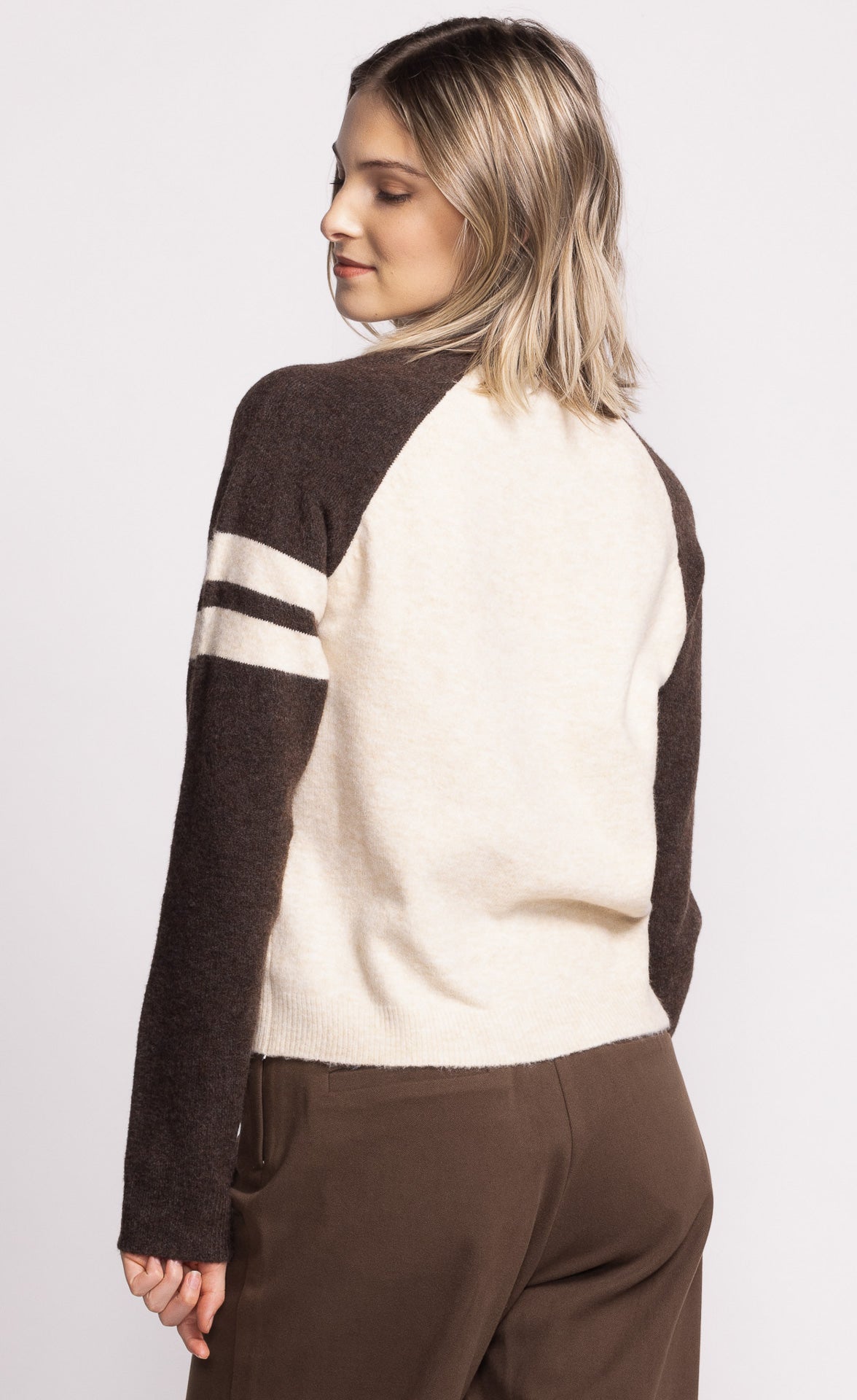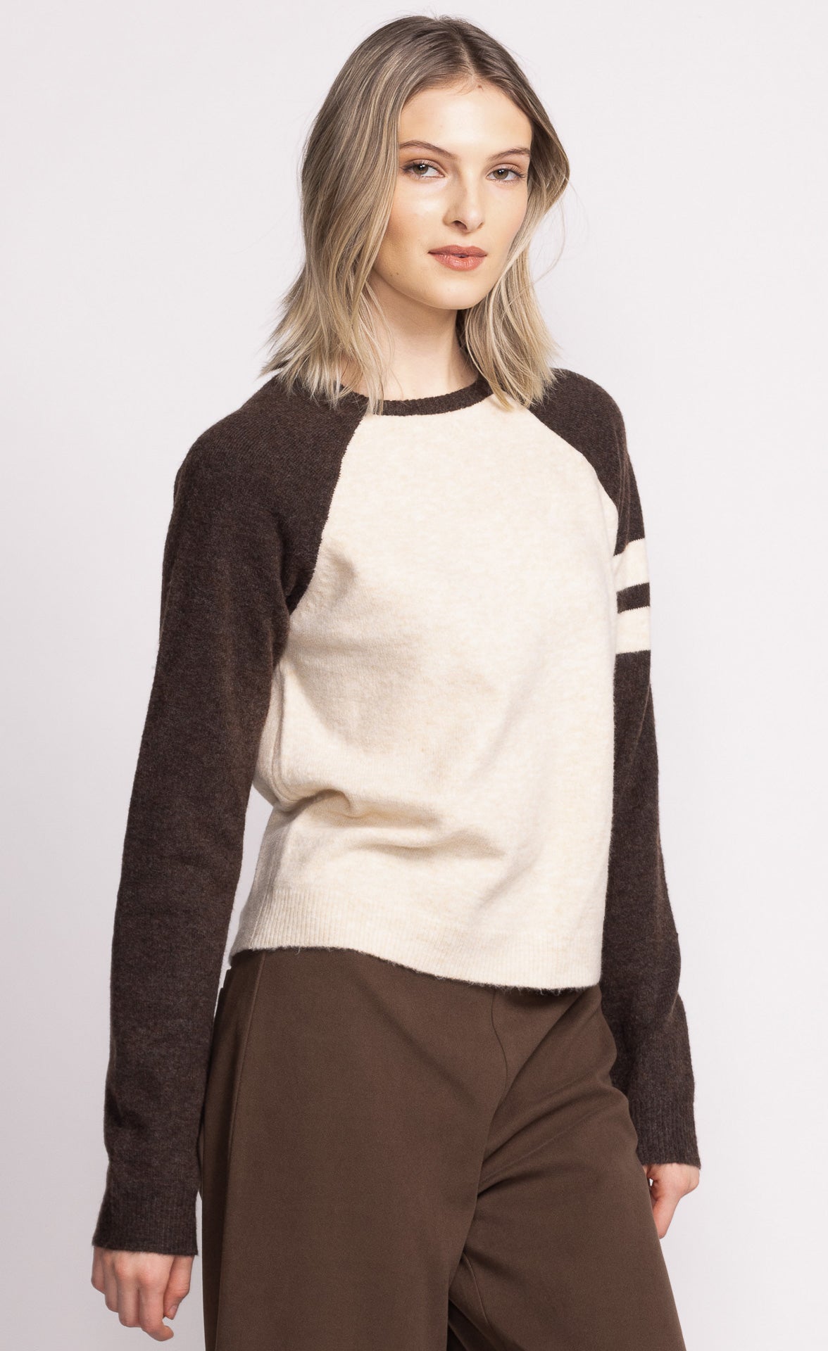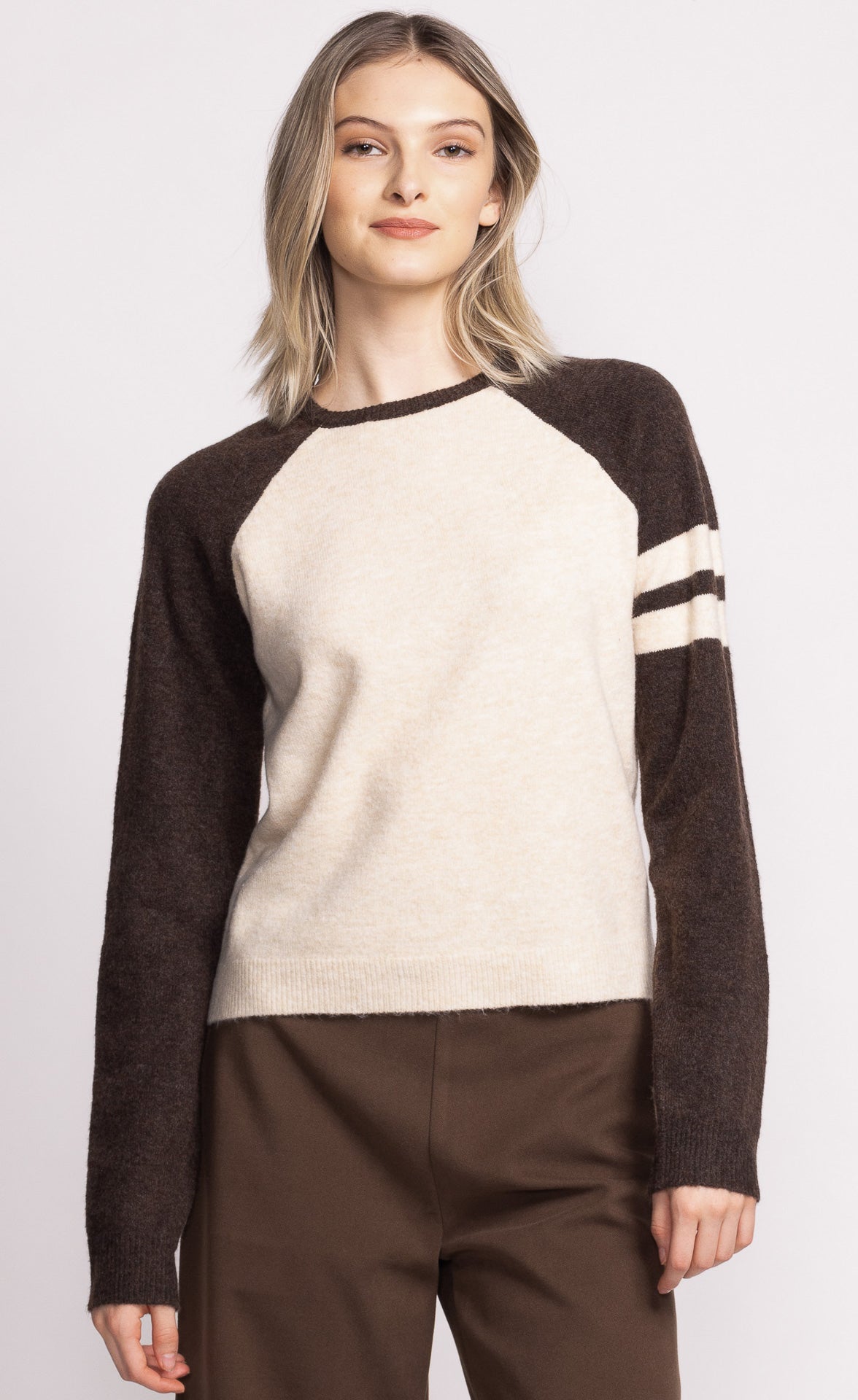 The Callista Sweater features raglan sleeves with contrast detailing, blending sporty and chic. Style it with joggers and sneakers for a fun, casual look!