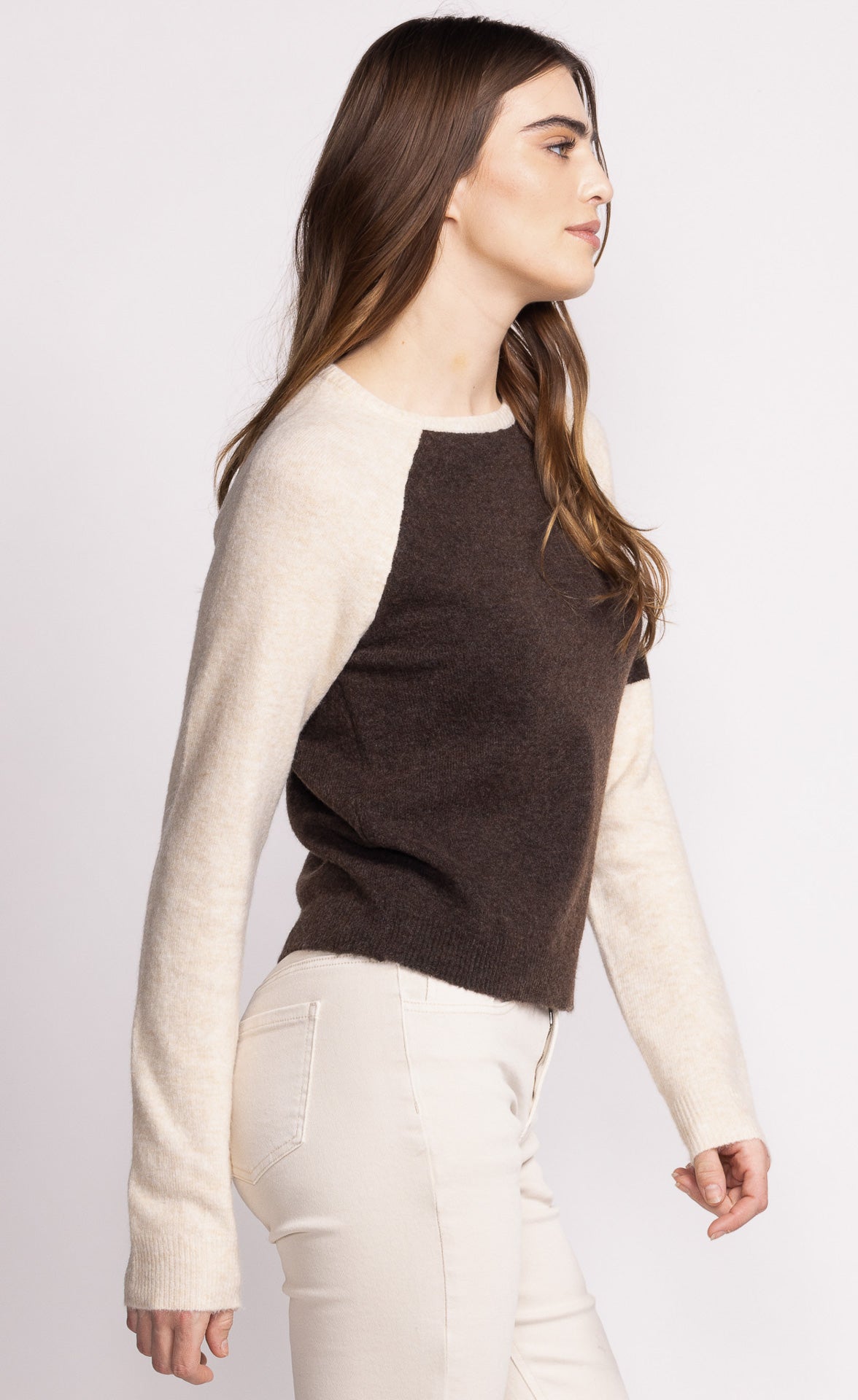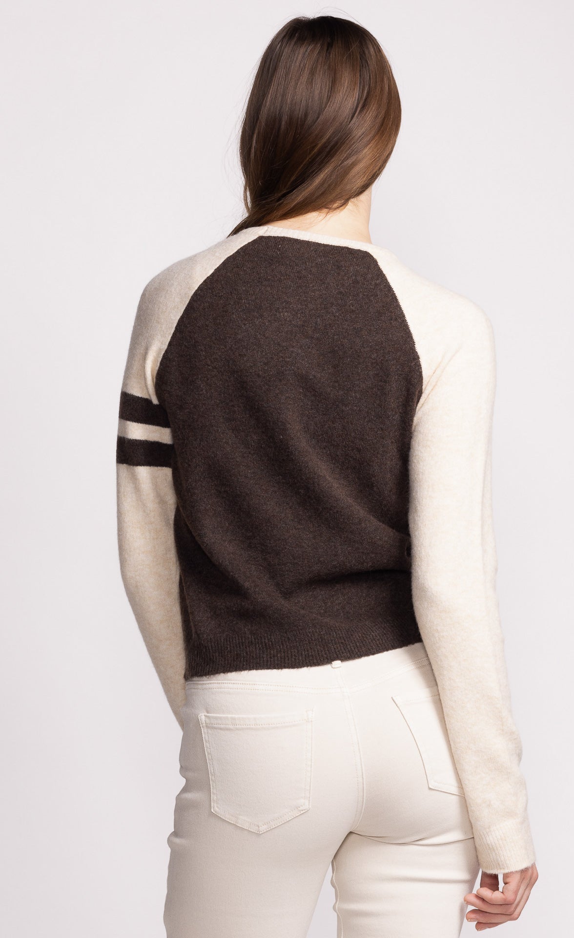 The Callista Sweater features raglan sleeves with contrast detailing, blending sporty and chic. Style it with joggers and sneakers for a fun, casual look!