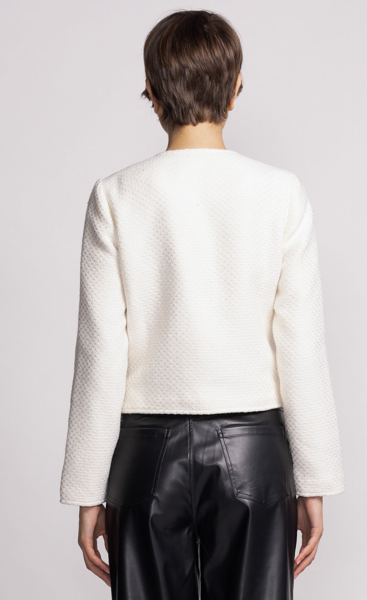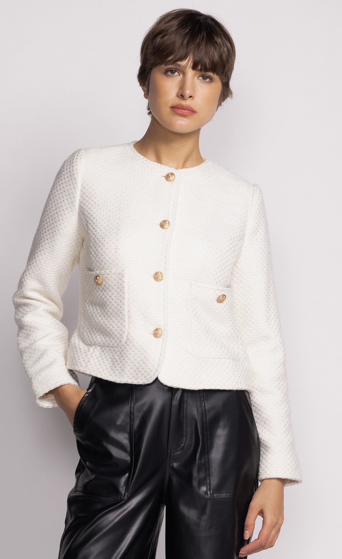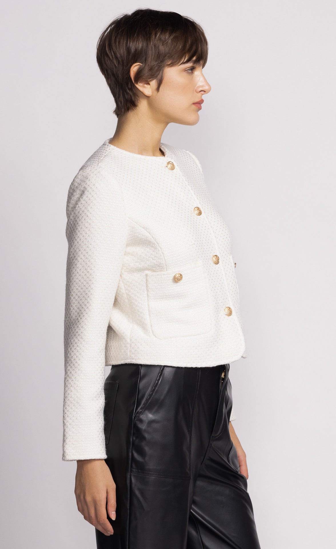 The Vera Jacket is super chic, featuring a textured fabric and elegant gold button closure. Perfect for adding a touch of sophistication to any outfit.