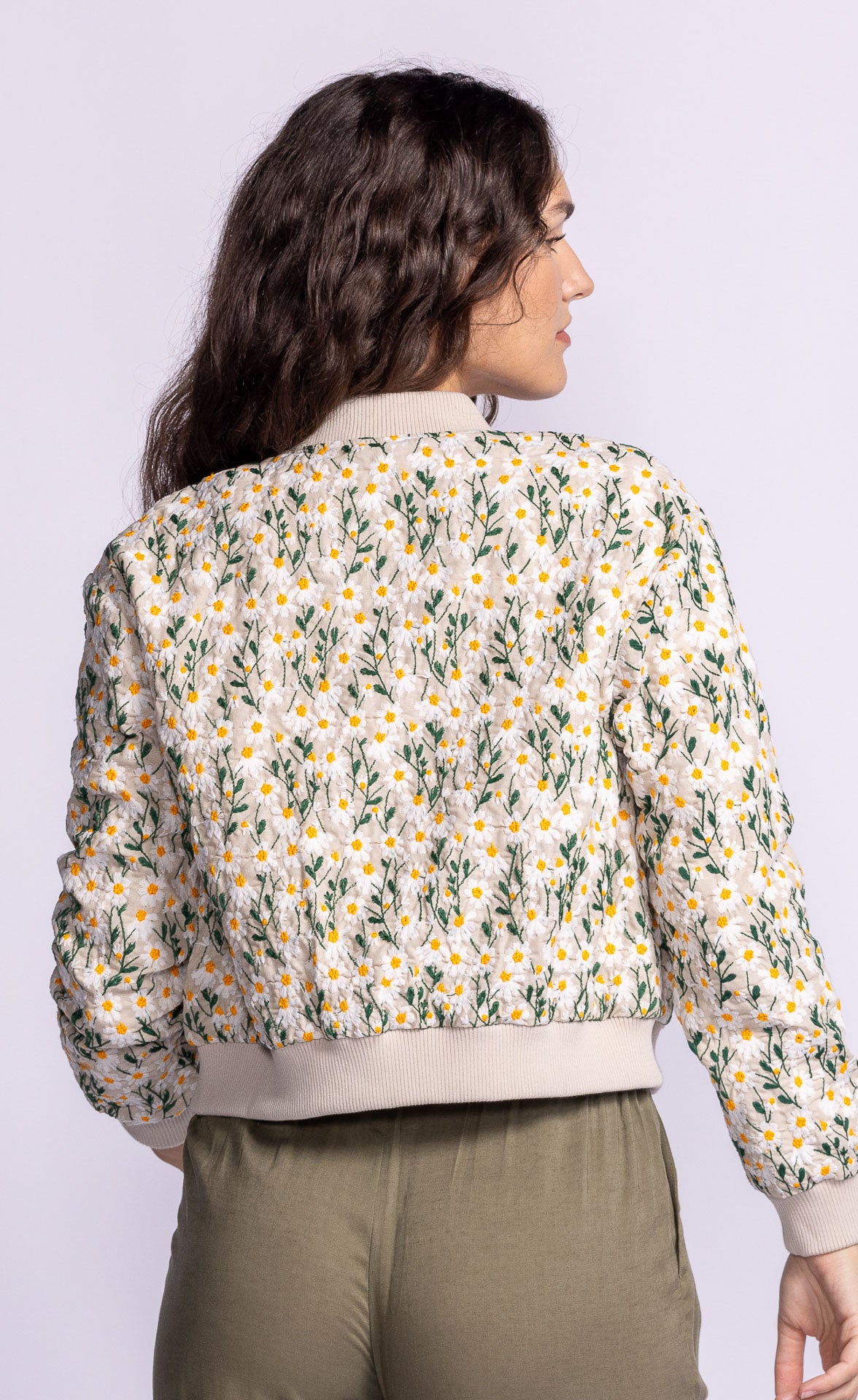 The Savannah jacket is a bomber-style silhouette featuring textured floral fabric with ribbed hem and cuffs for a chic, casual vibe. Layer over a fitted top and jeans for an effortlessly stylish outfit.