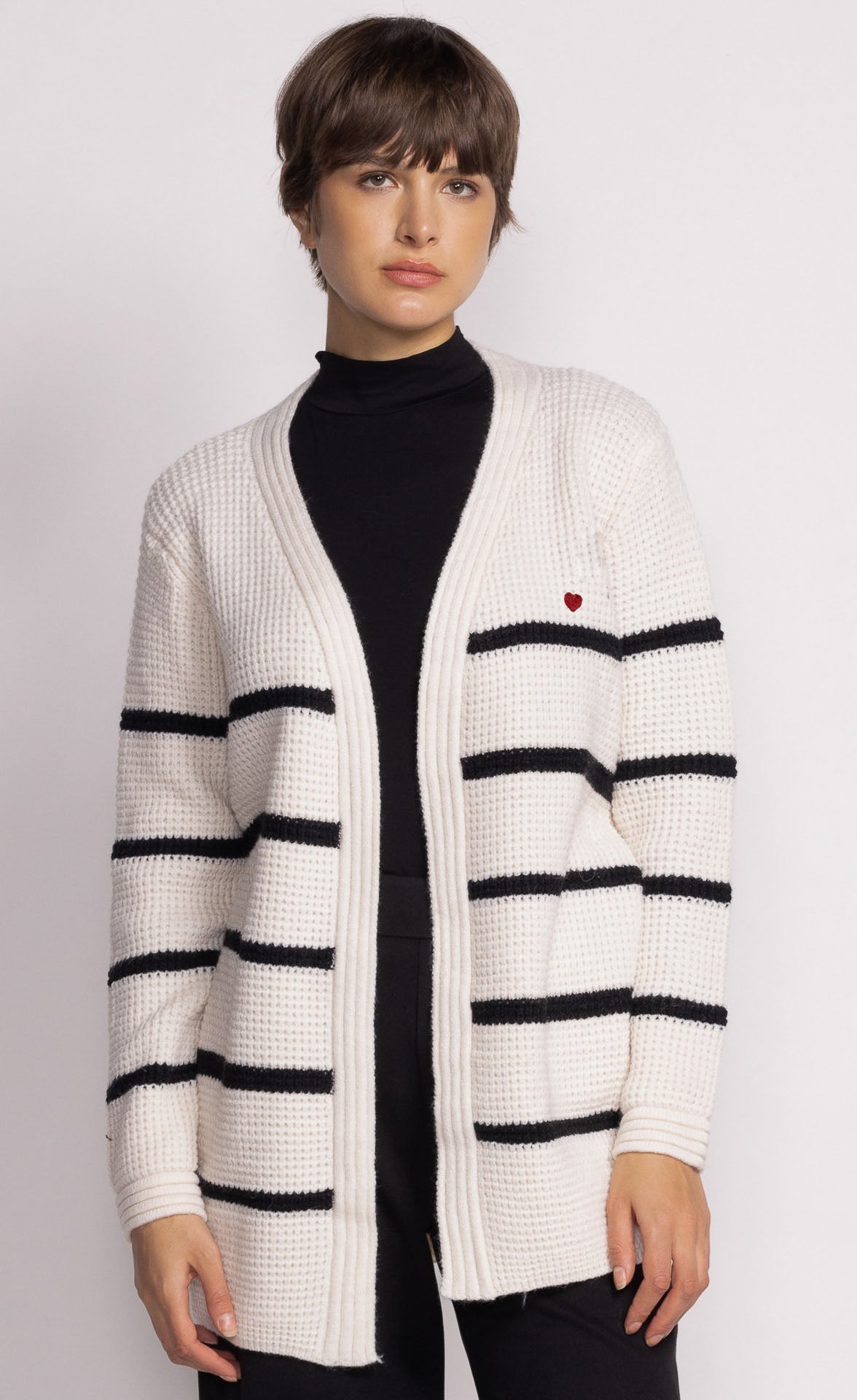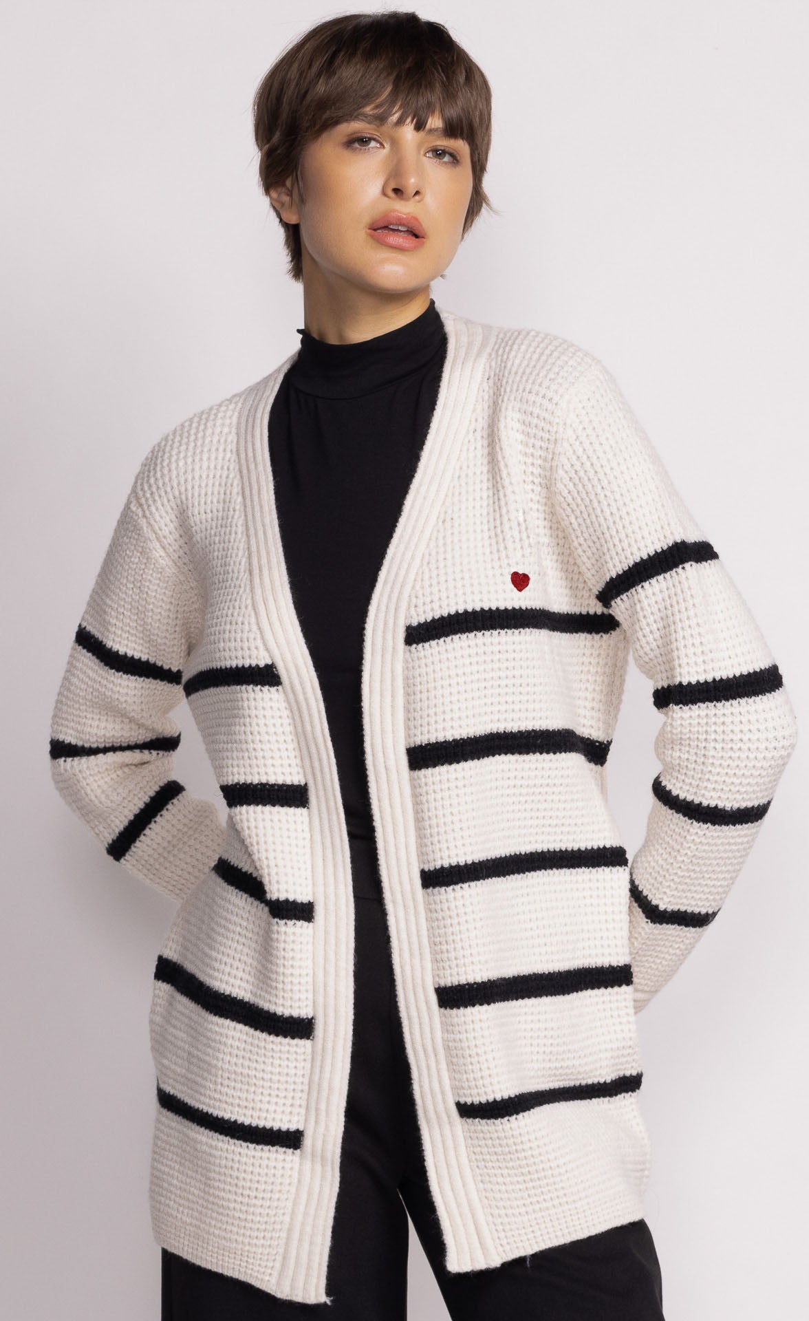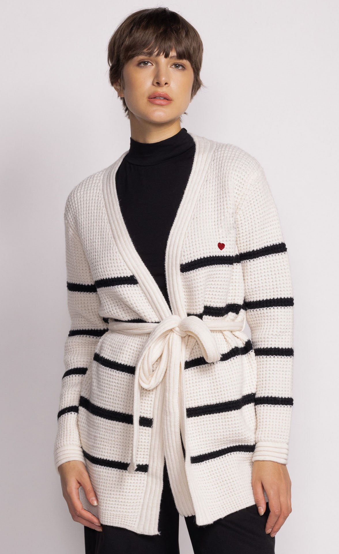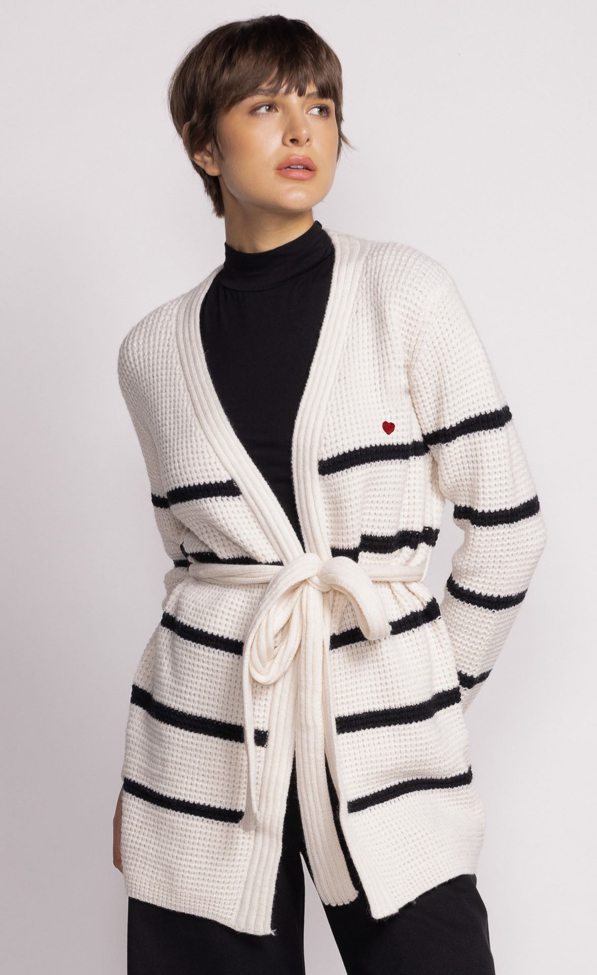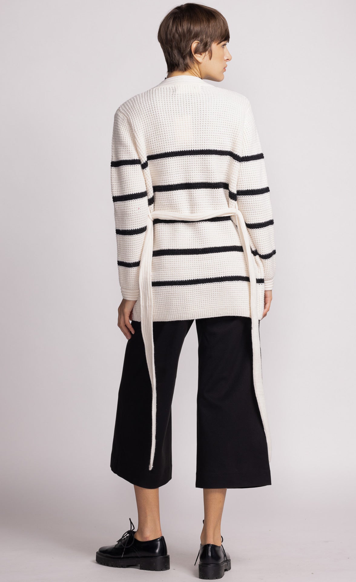 The Aspen Sweater features an adjustable belt strap and stripe detail, offering versatility to wear it open or belted. Style it with high-waisted jeans and boots for a cozy, refined look!