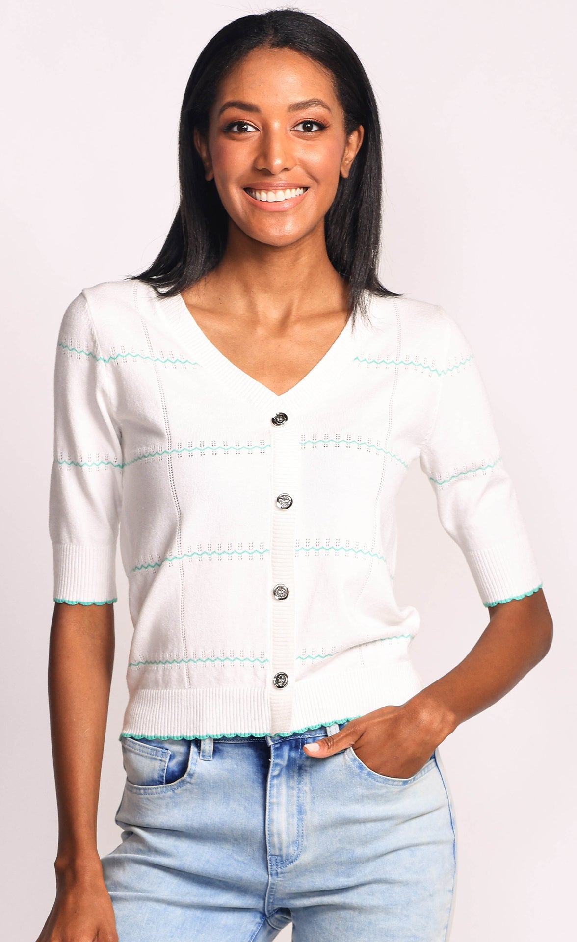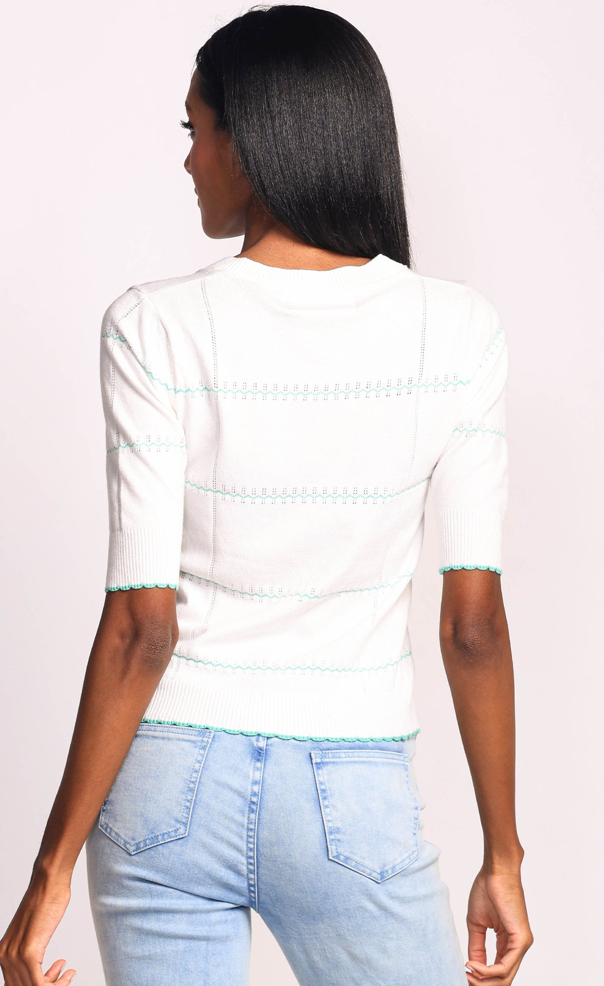 Add a touch of sweetness to your wardrobe with the Charlie sweater. Featuring delicate scallop trim details, this sweater exudes a playful and feminine vibe.