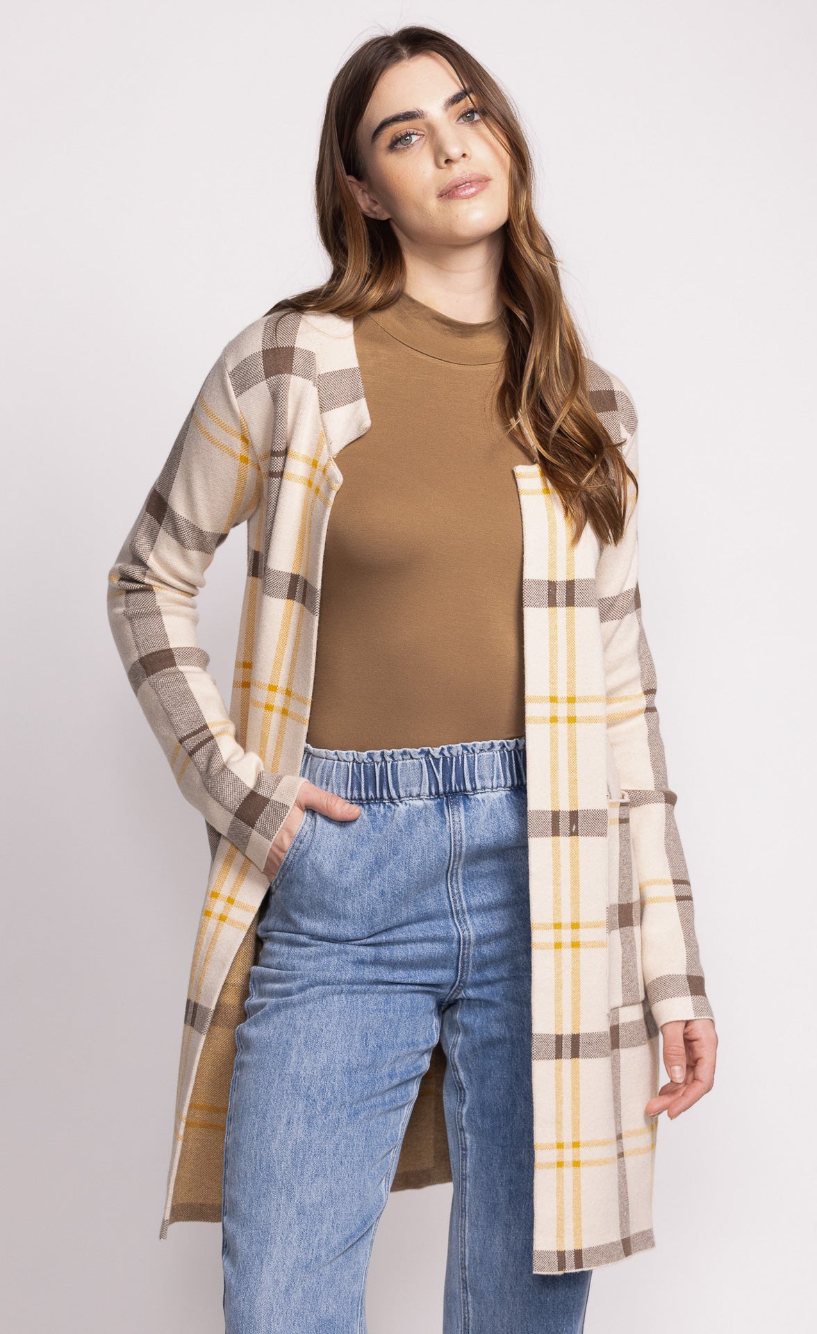 The Harmon Cardi is a long, comfortable cardigan featuring plaid details. Perfect for layering, it pairs effortlessly with jeans and boots for a casual, stylish look.
