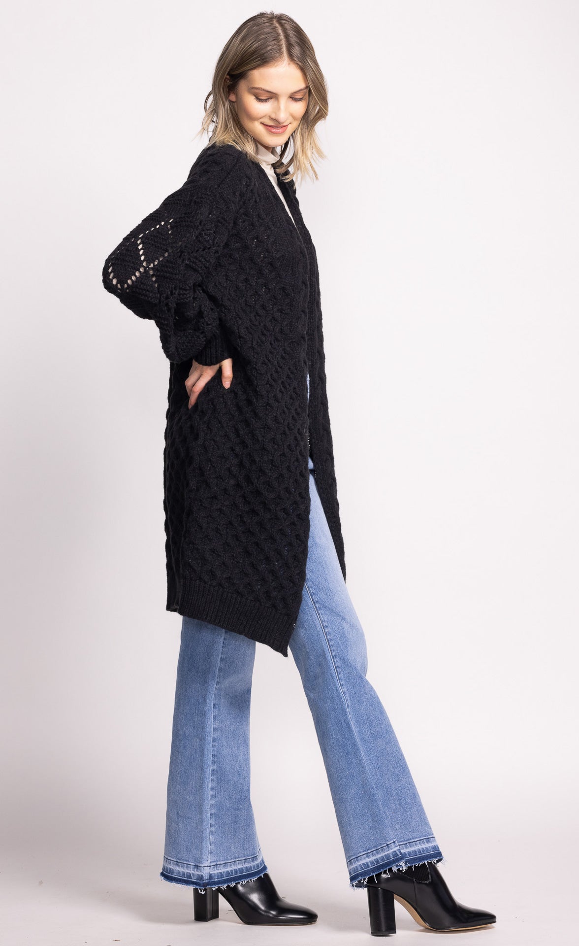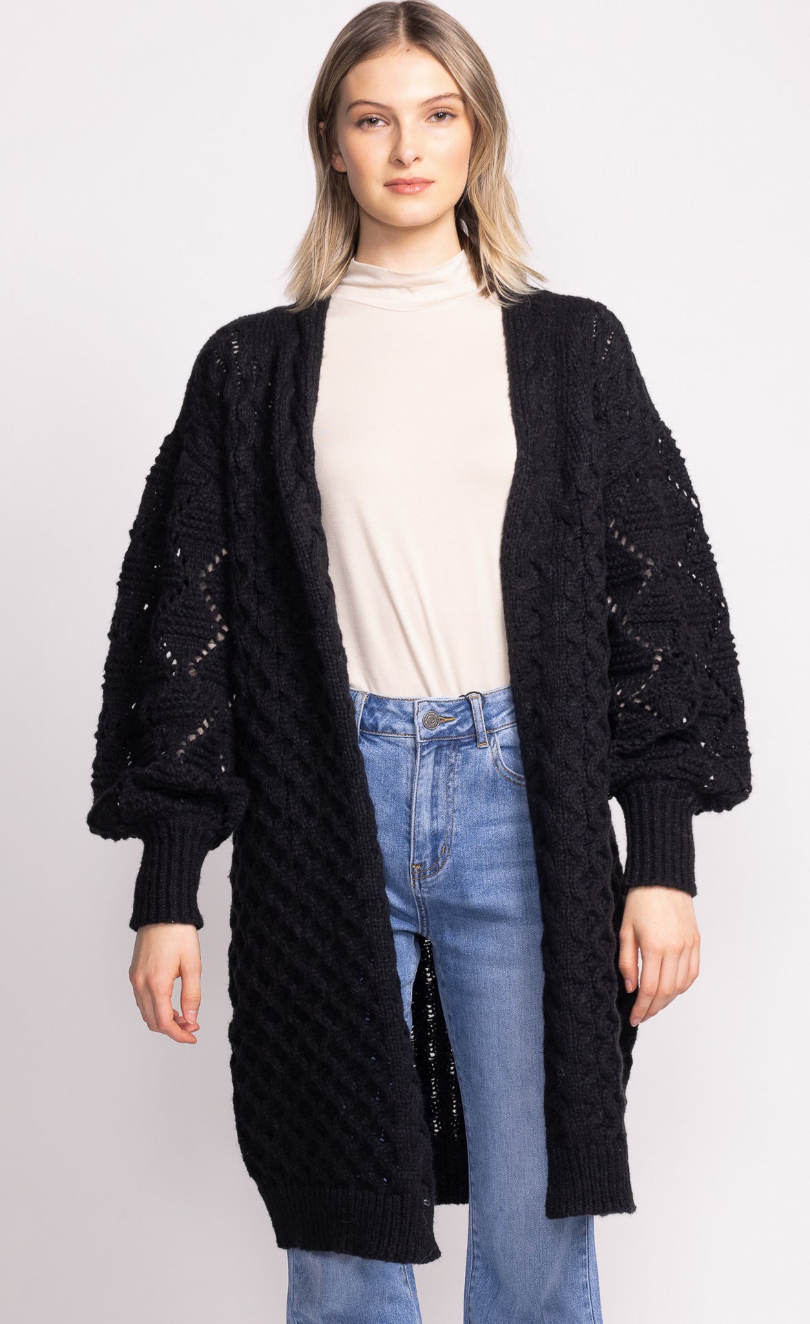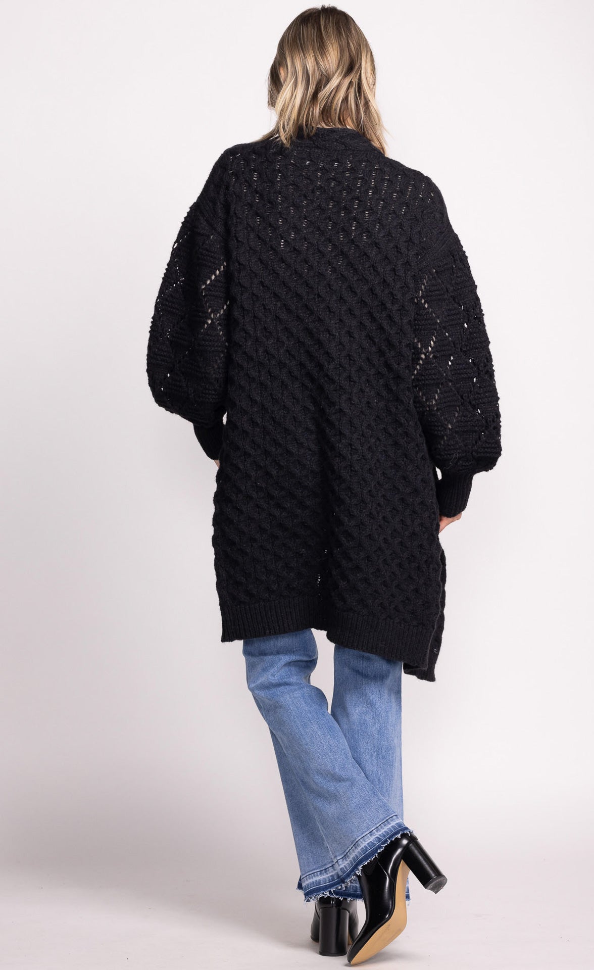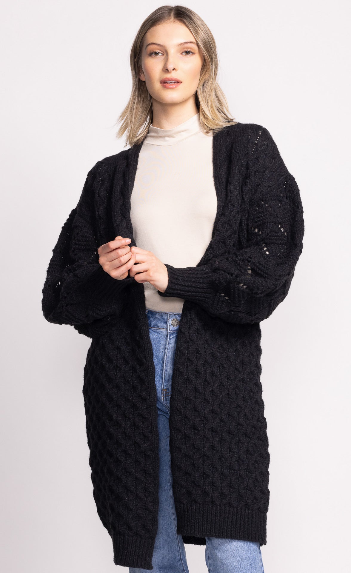 The Irie Sweater is a cozy, long open front sweater featuring ribbed hem and cuffs. Its relaxed design makes it perfect for layering, adding warmth and style to any outfit.
