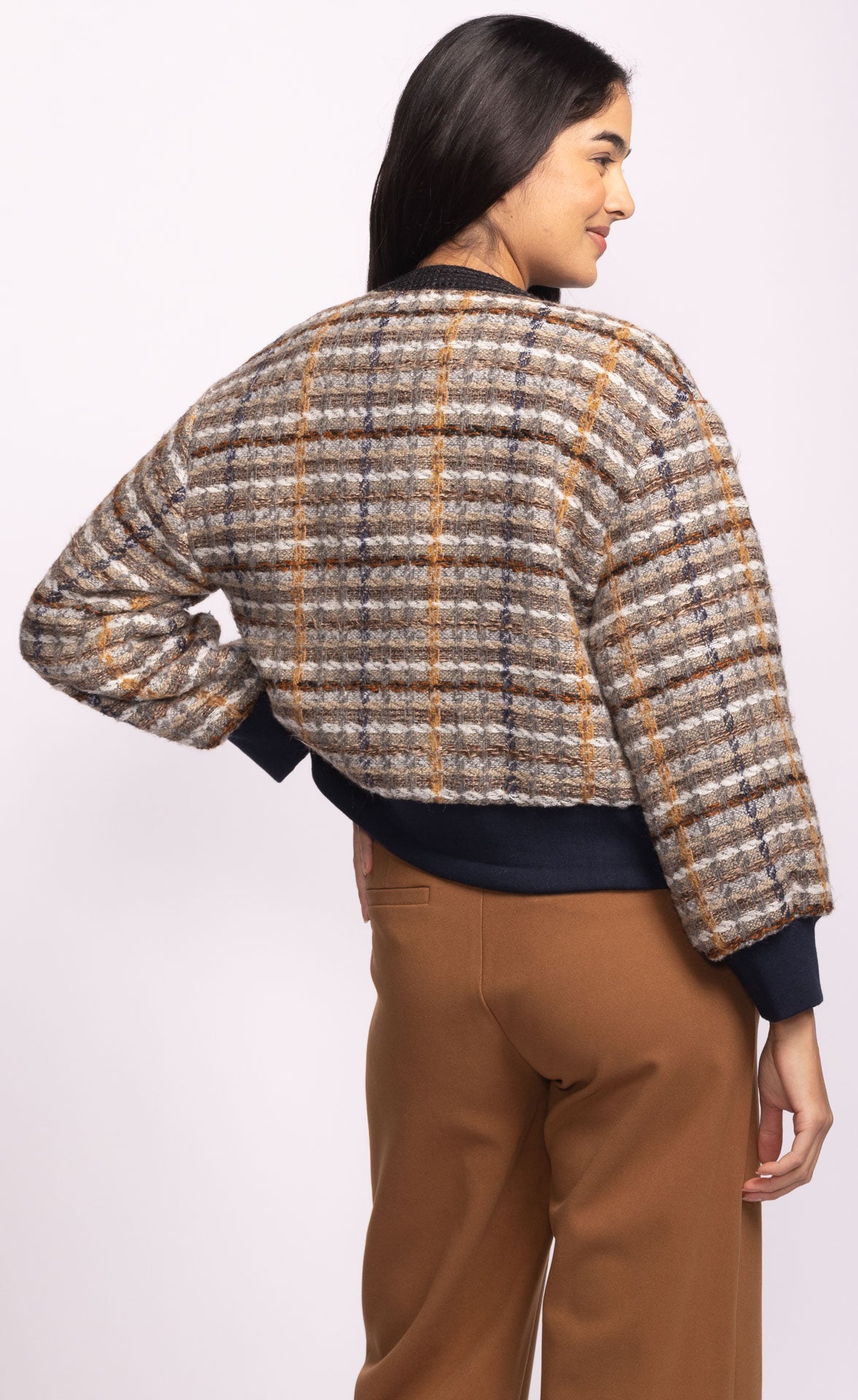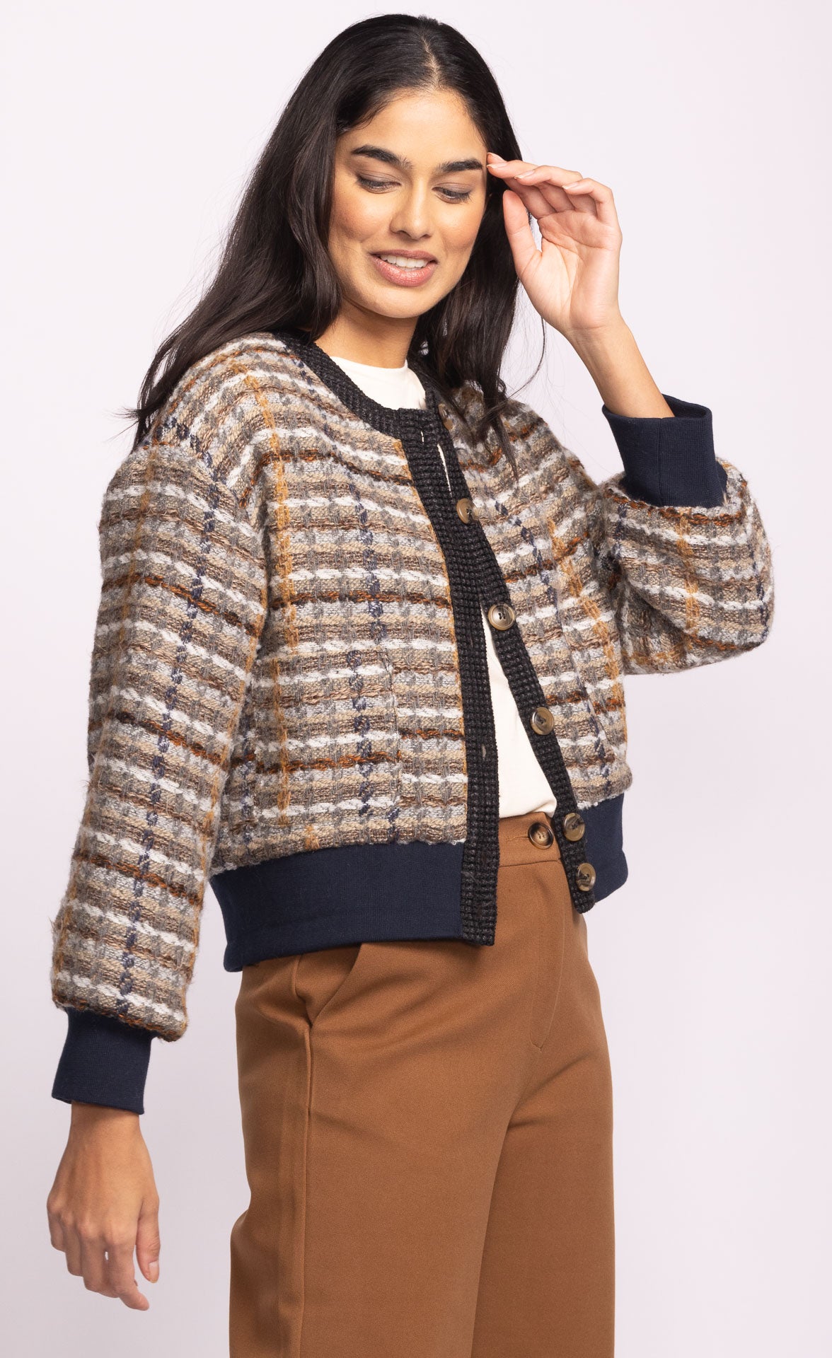 The Jackie Jacket is a chic button-up cardigan crafted from classic tweed fabric, giving it a timeless and polished look. Finished with ribbed cuffs and hem for a modern twist, this tweed jacket transitions seamlessly from work to weekends. Layer it over a blouse and pants for your office outfit, or style it with a dress for your date night look.
