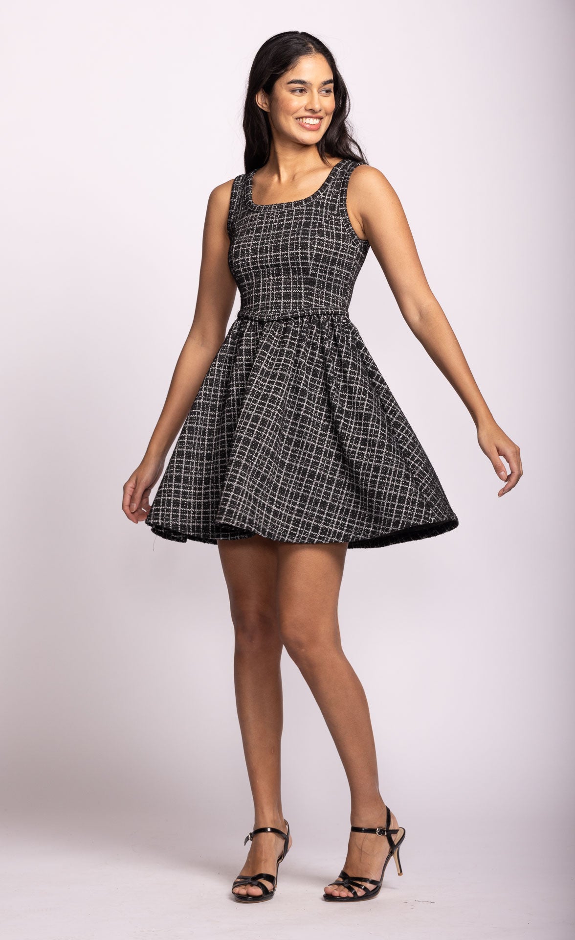 The Pixie Dress is a fit and flare mini dress made of tweed fabric for a timeless look. Finished with a back zip closure, it pairs perfectly with heels for dinner parties or special occasions.