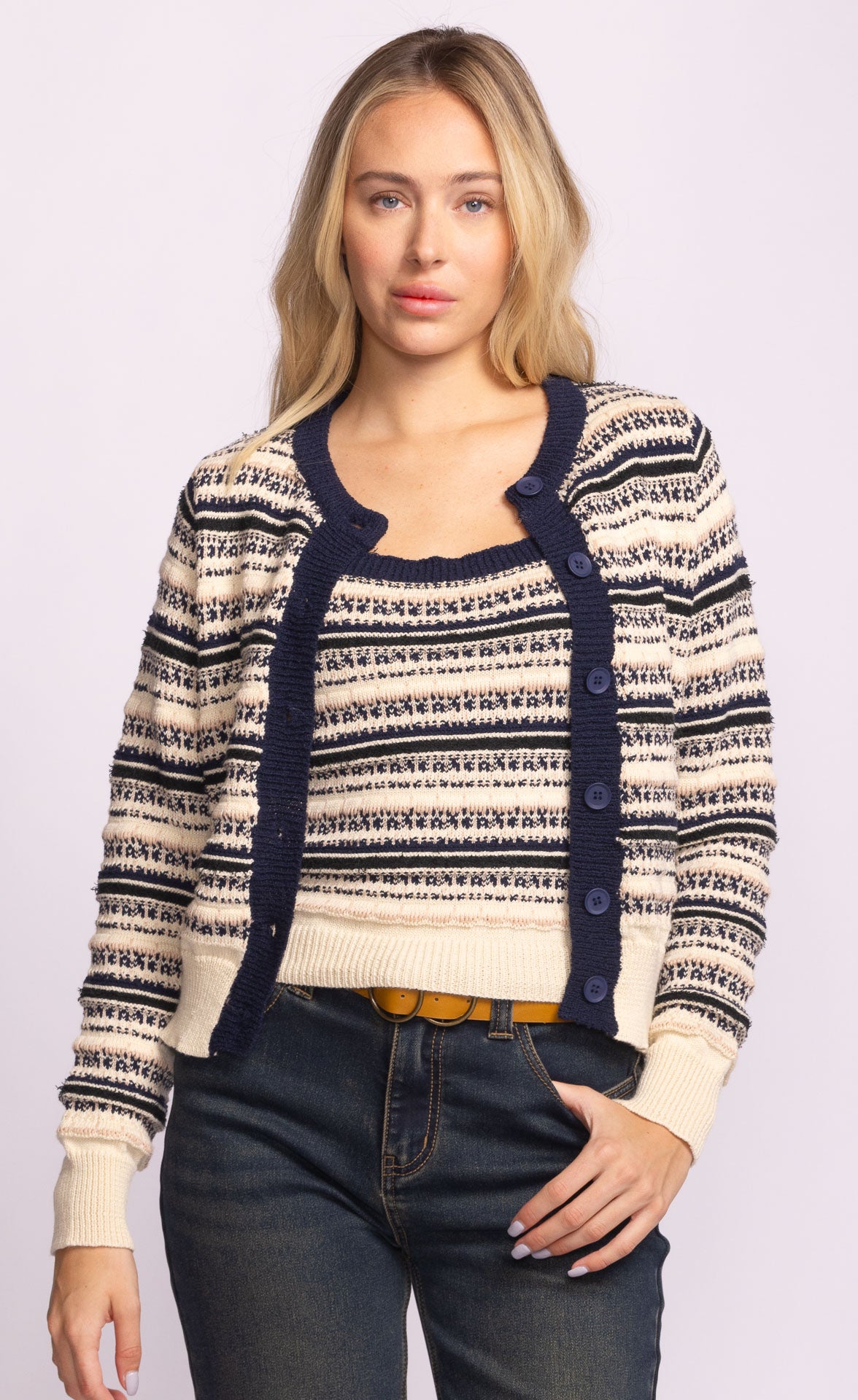 The Shawna Jacket is a cozy knitted cardigan made from a soft cotton blend for comfort and style. Designed with a front button closure and a relaxed fit, it's perfect for layering over your favorite tops or wearing on its own. Pair it with the matching Miramar Sweater for a coordinated, effortlessly chic look.
