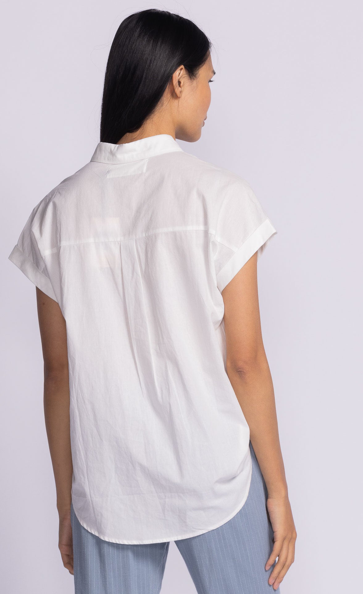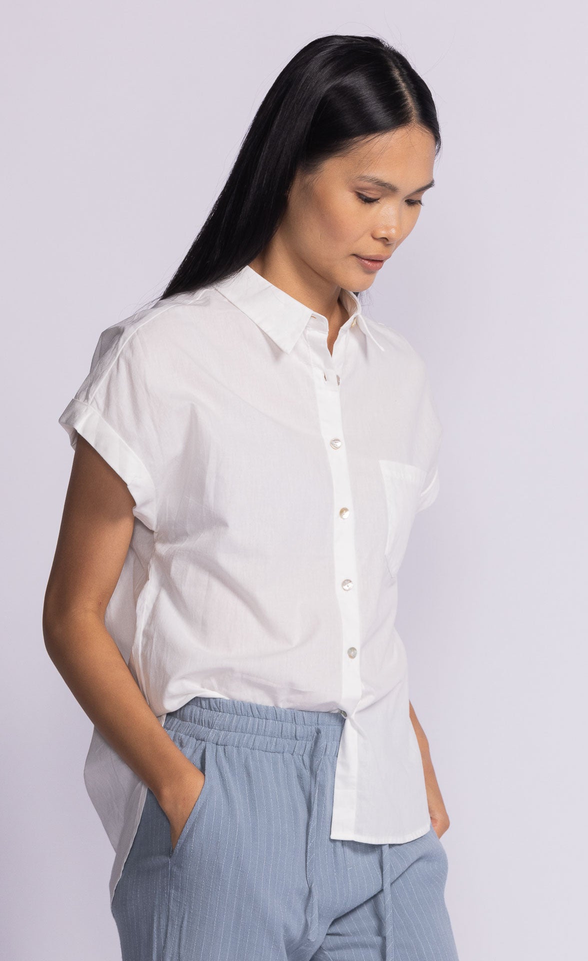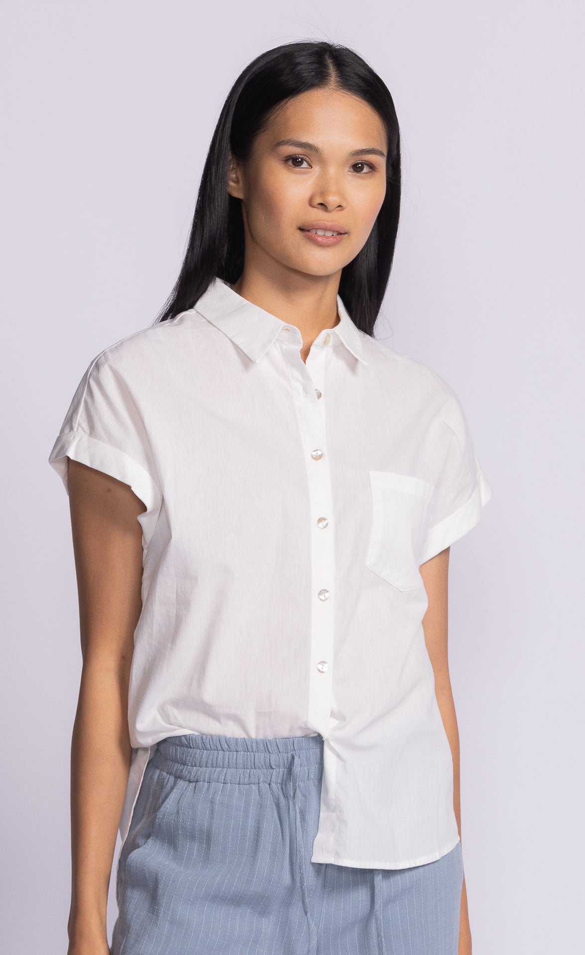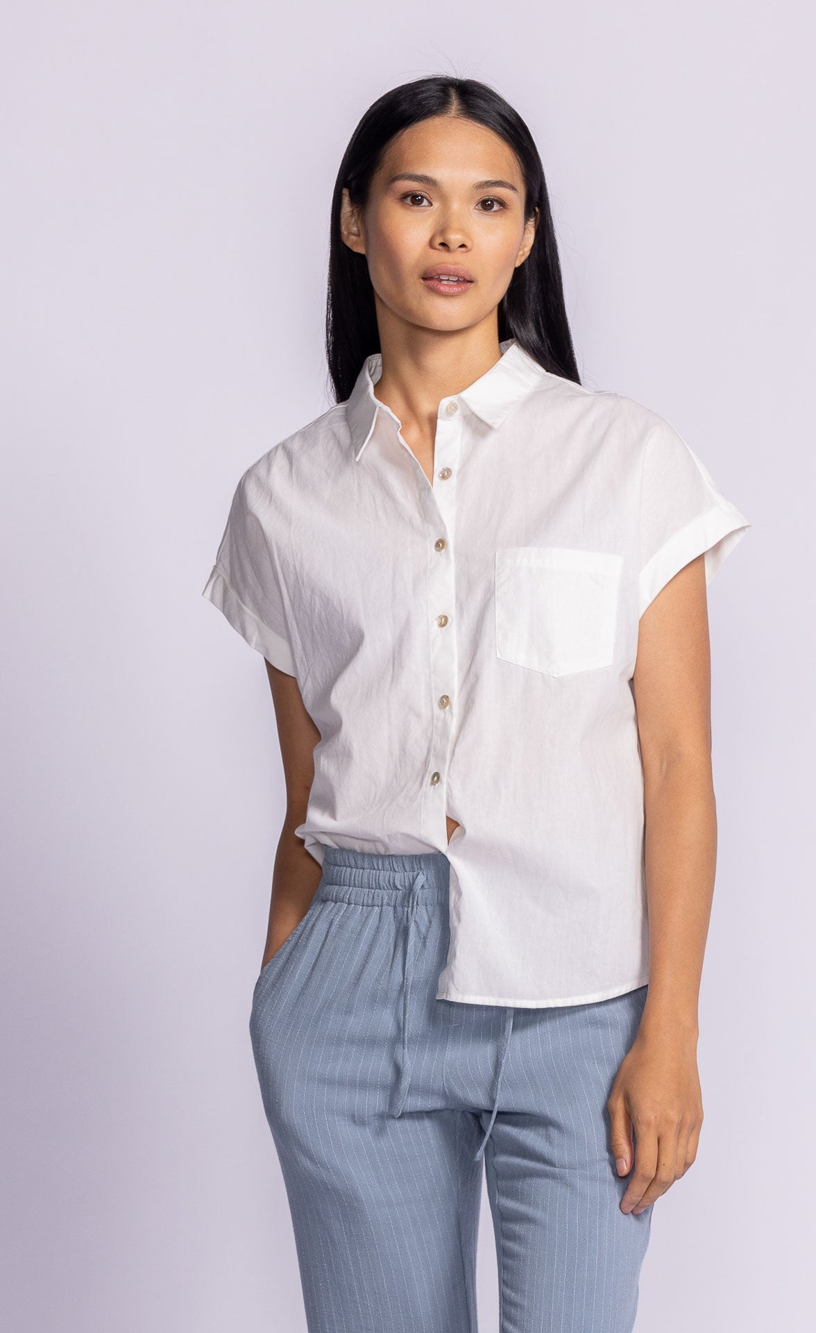 The Carrie Top is a button-down with short cuffed sleeves and a front pocket, offering a relaxed fit. Pair it with jeans or tucked into a skirt for a versatile, casual look.