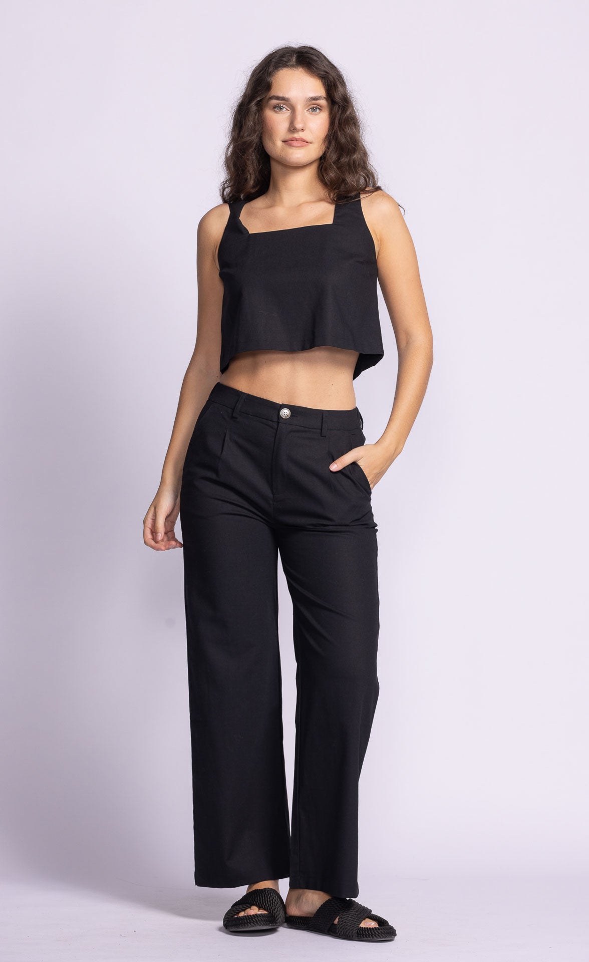 The Delaney Pants feature a button and zip front, side pockets, and a relaxed fit—perfectly paired with the Eliza Top for a chic, coordinated look!