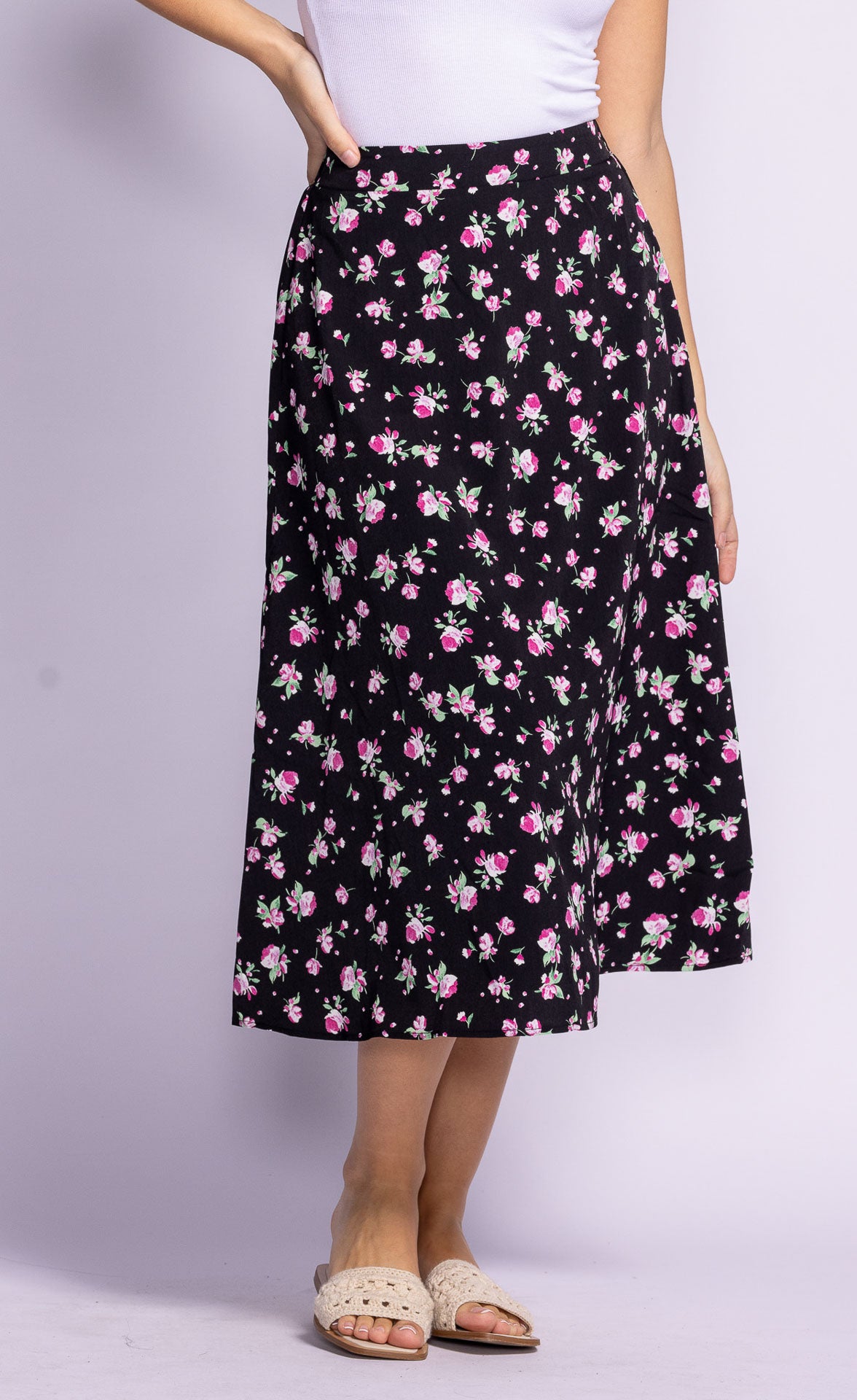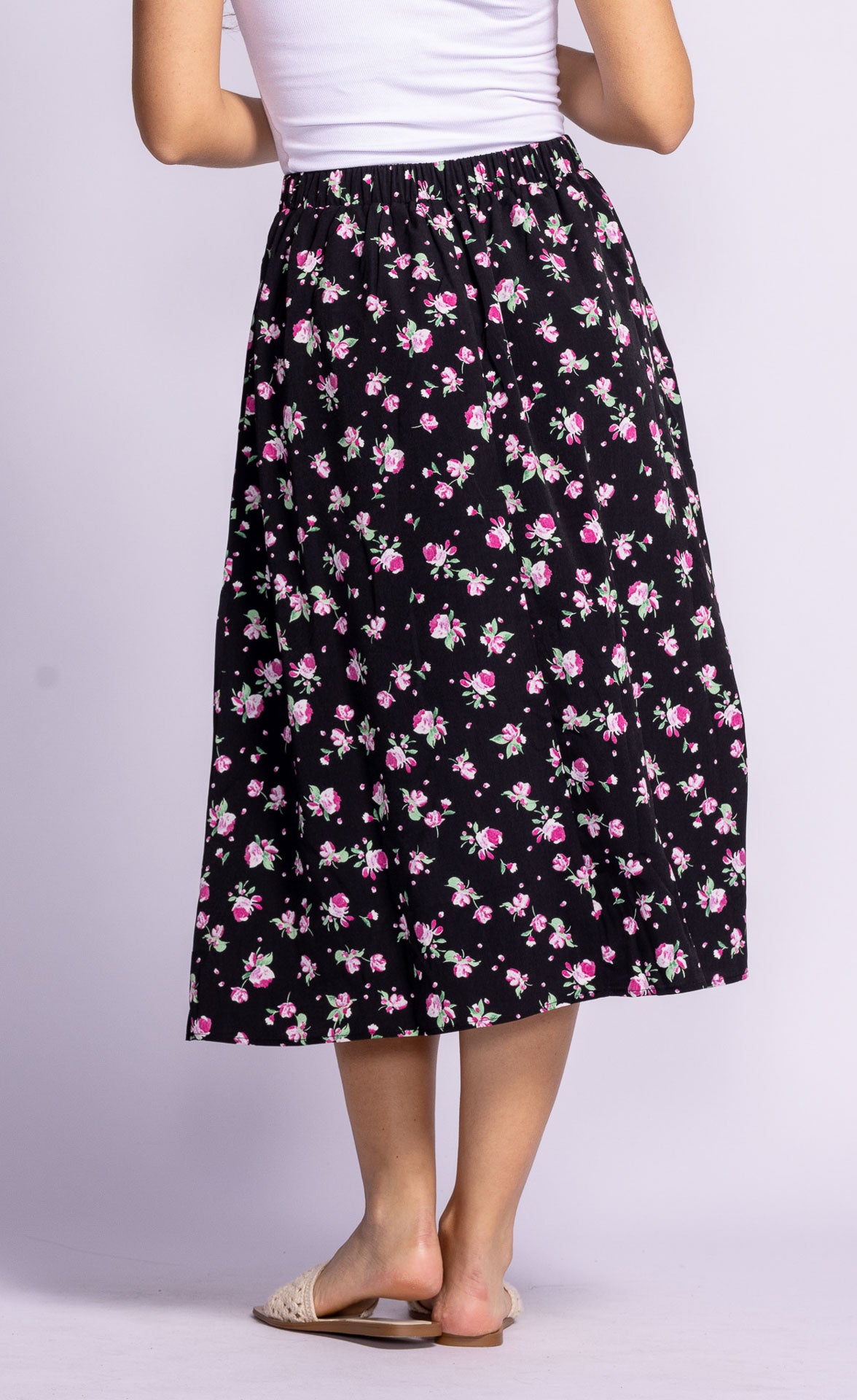 The Dolores Skirt is a flowy A-line silhouette with a dainty print and a flattering mid-length cut. Pair it with a tucked-in blouse or a simple tee for a feminine, effortless look.
