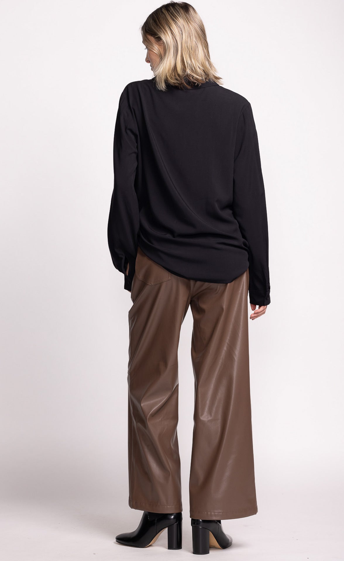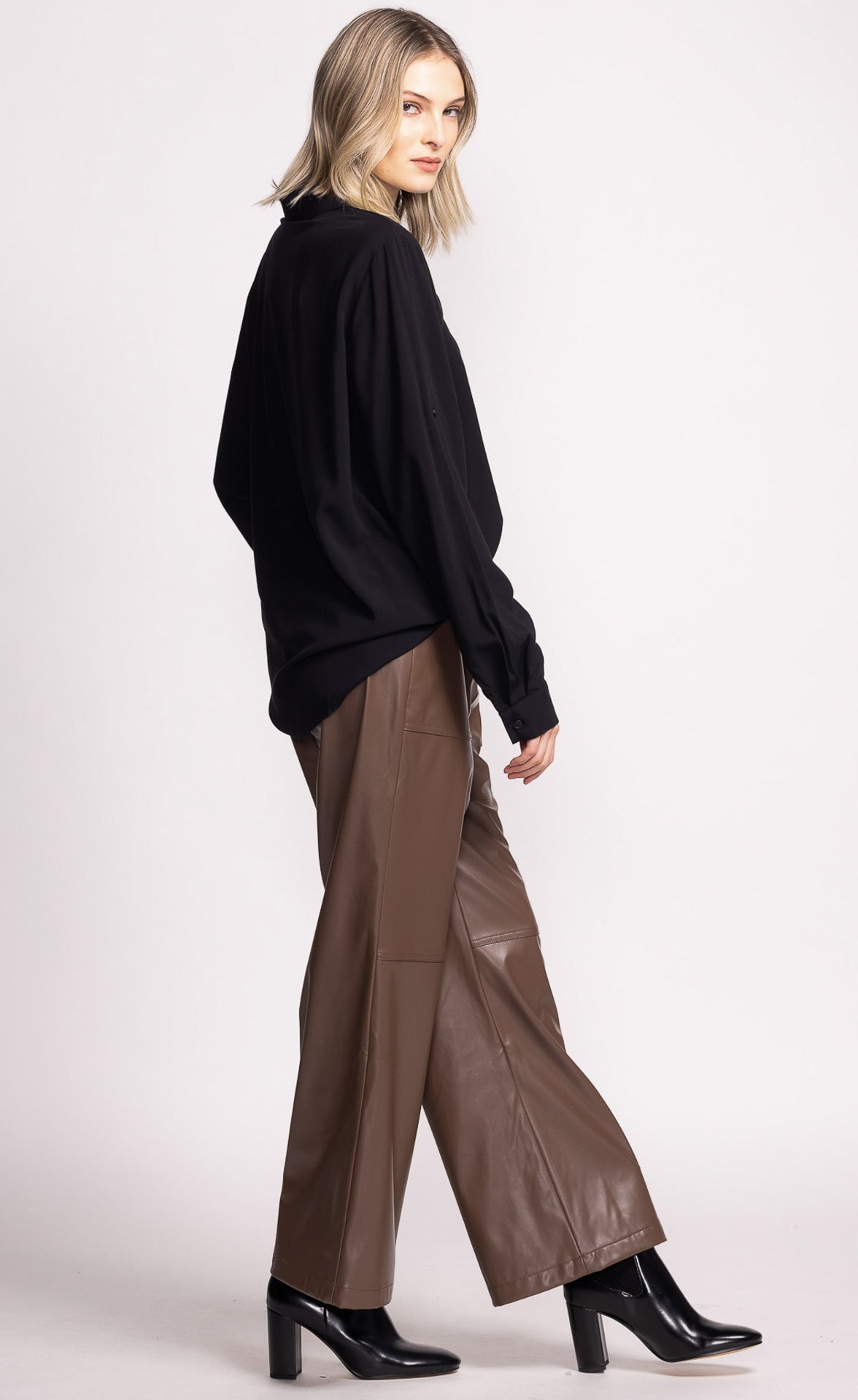 The Emory Pants are chic straight-leg pants crafted from sleek PU leather. Designed with wide side pockets for style and practicality, these pants are perfect for pairing with your favorite boots, adding an edgy yet polished touch to any outfit.