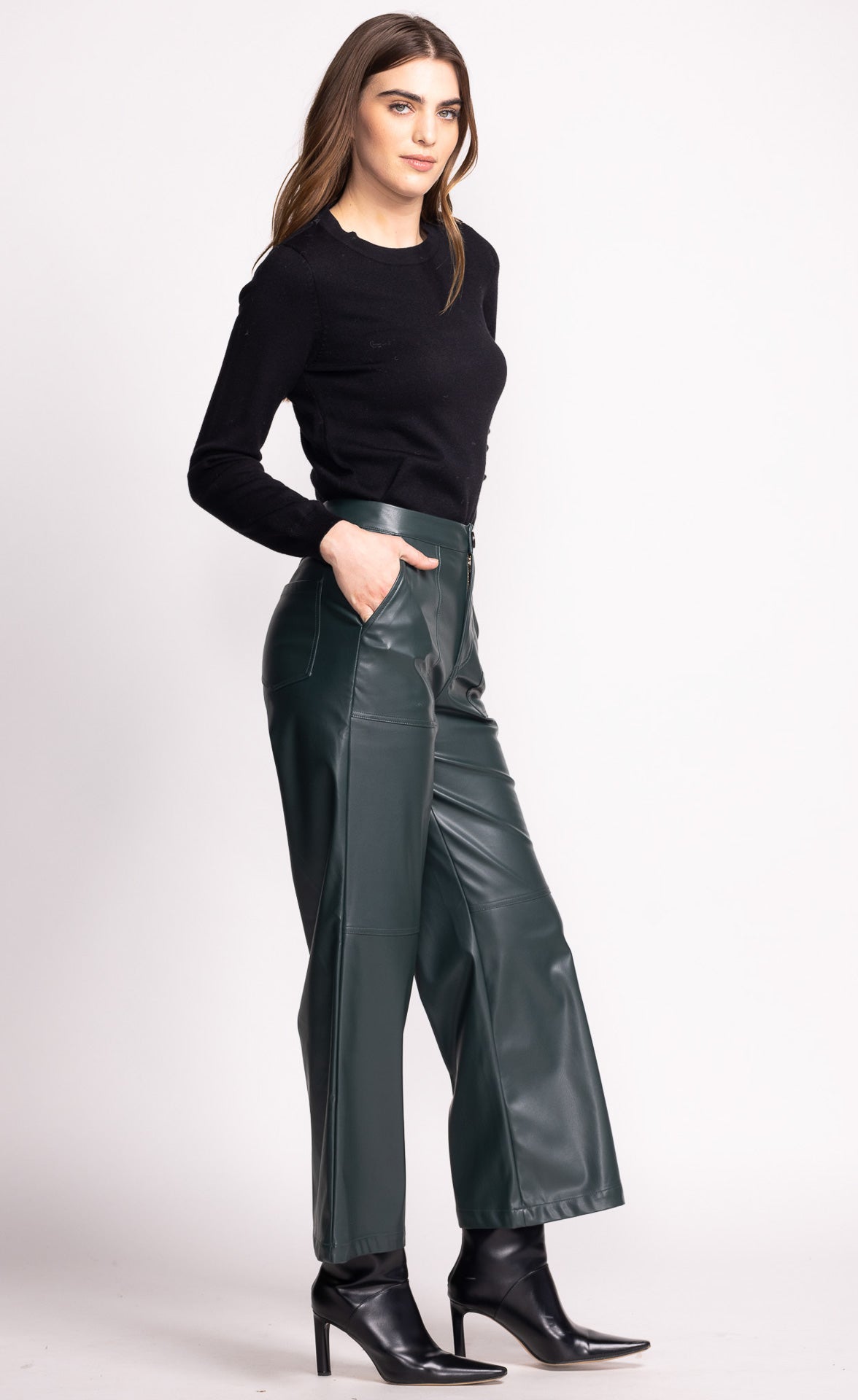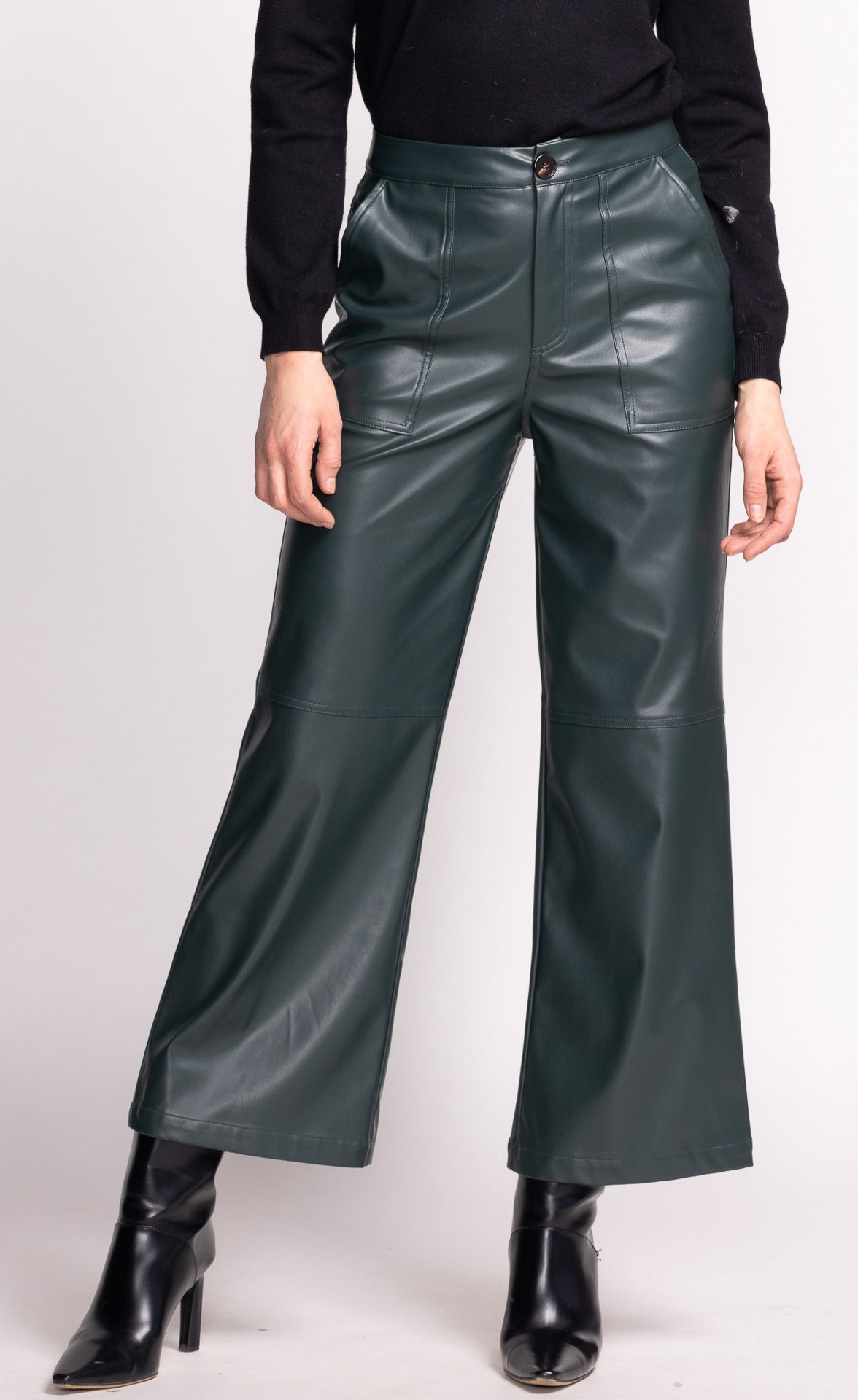 The Emory Pants are chic straight-leg pants crafted from sleek PU leather. Designed with wide side pockets for style and practicality, these pants are perfect for pairing with your favorite boots, adding an edgy yet polished touch to any outfit.