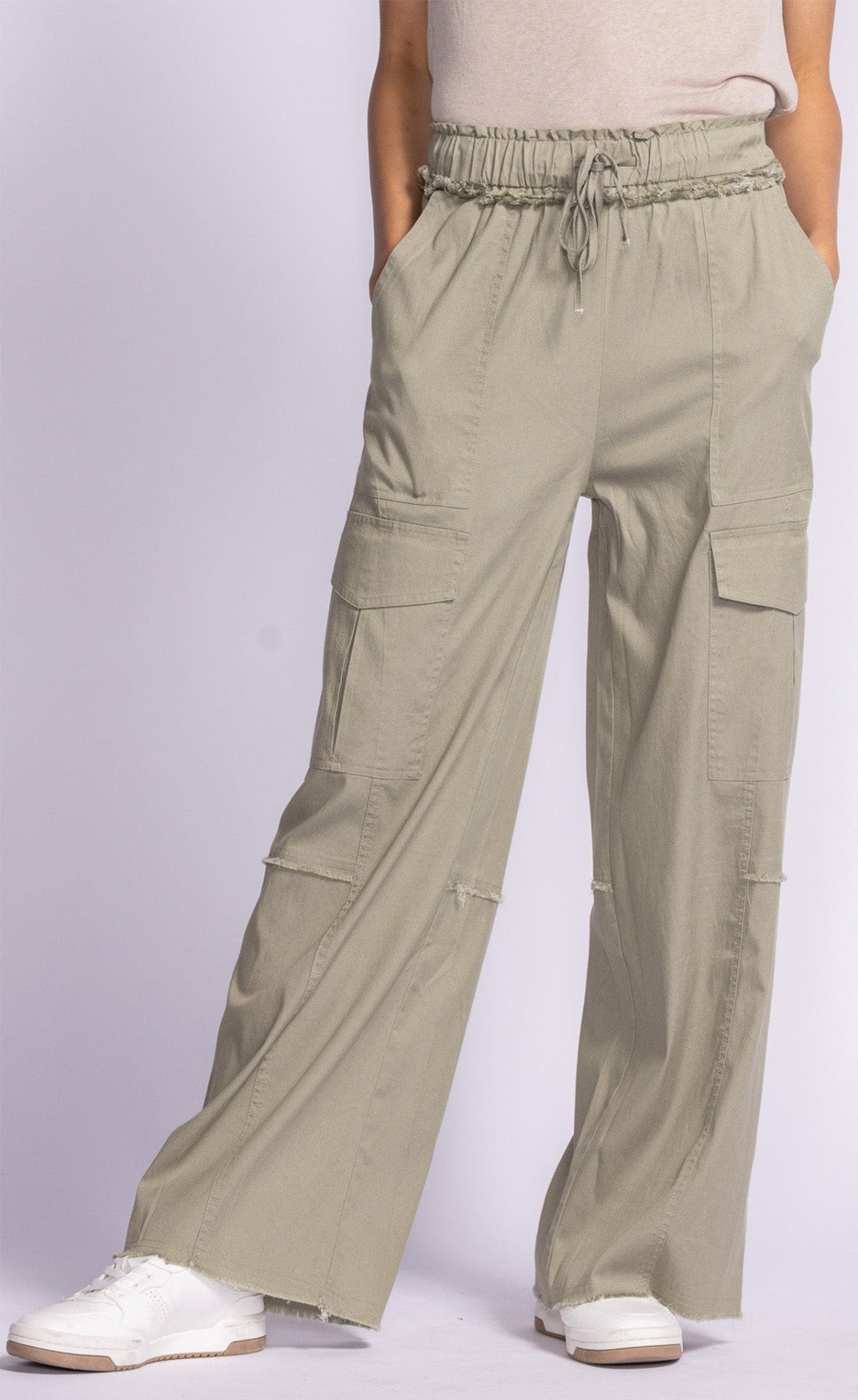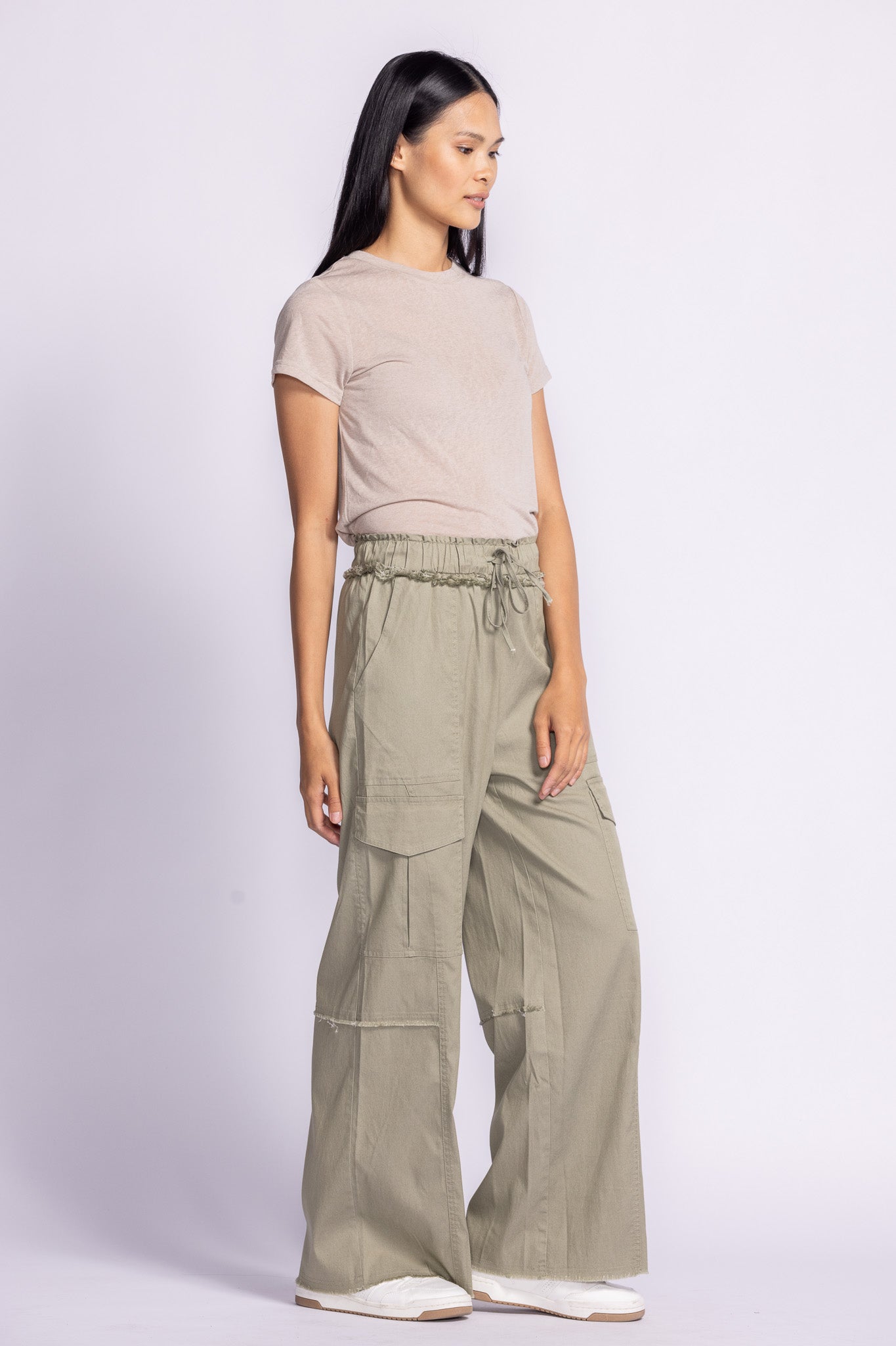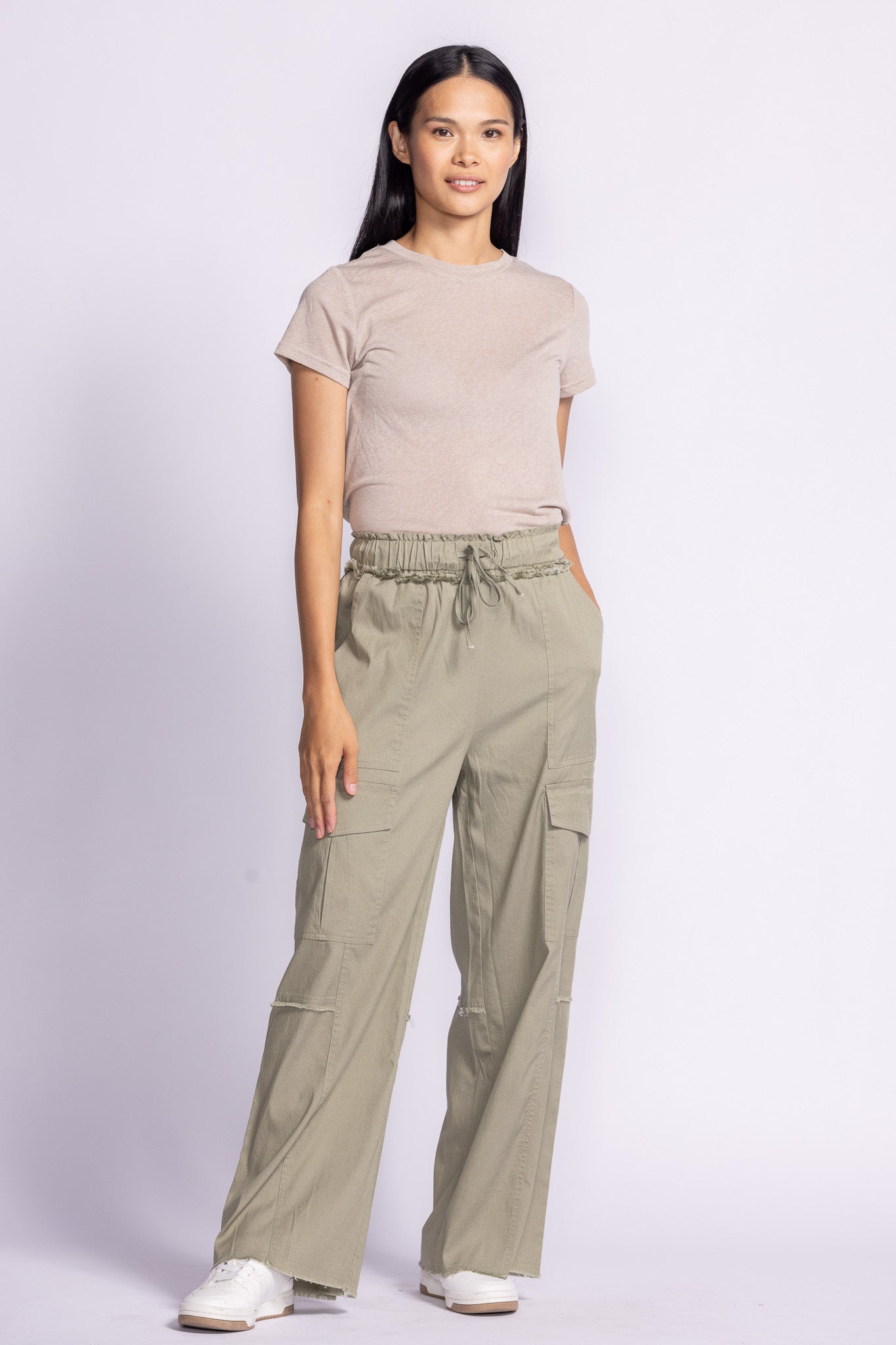 The Kristy Pants are wide-leg essentials with side pockets, an elastic waistband with cinchable drawcord waist, and a semi-distressed hem. Chic and versatile, they look perfect paired with a crisp white top.
