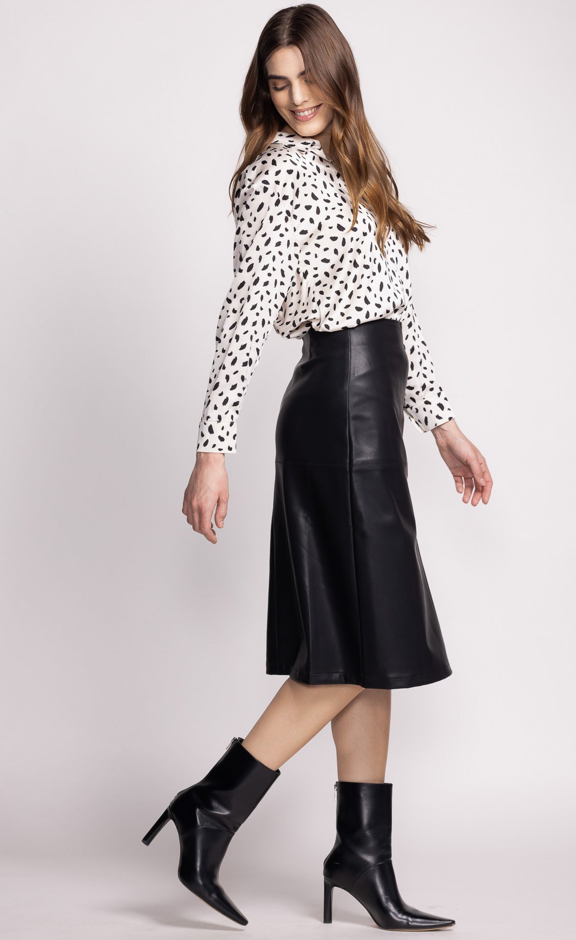 The Peyton Skirt is a chic mid-length faux leather piece that adds a touch of sophistication to any outfit. Style it with a tucked-in blouse and heels for a polished look!