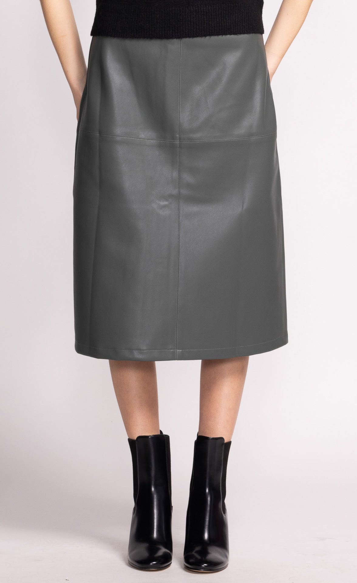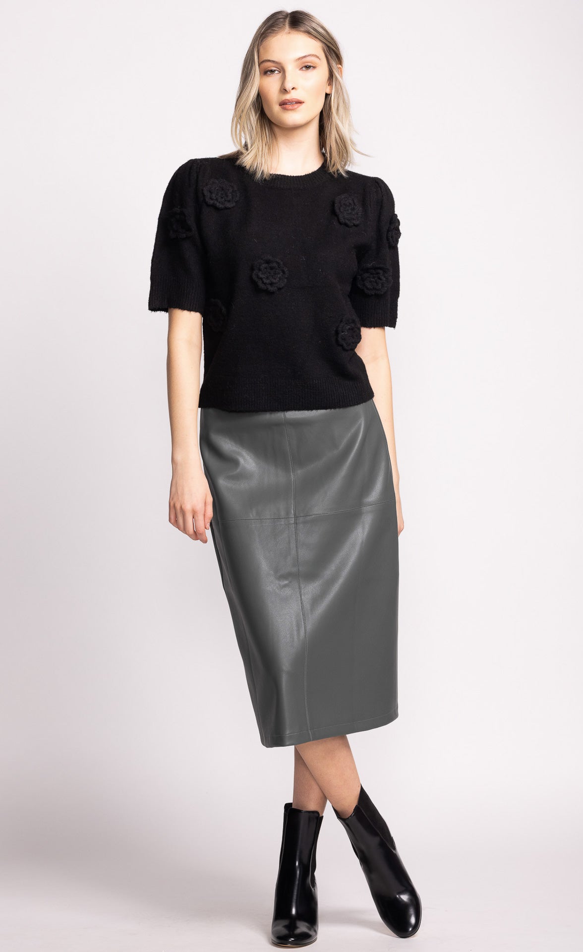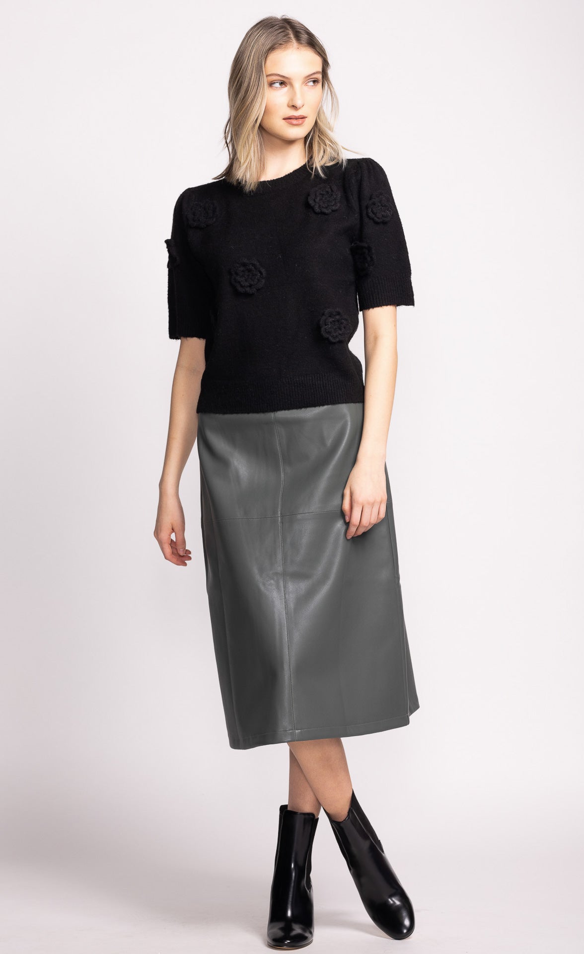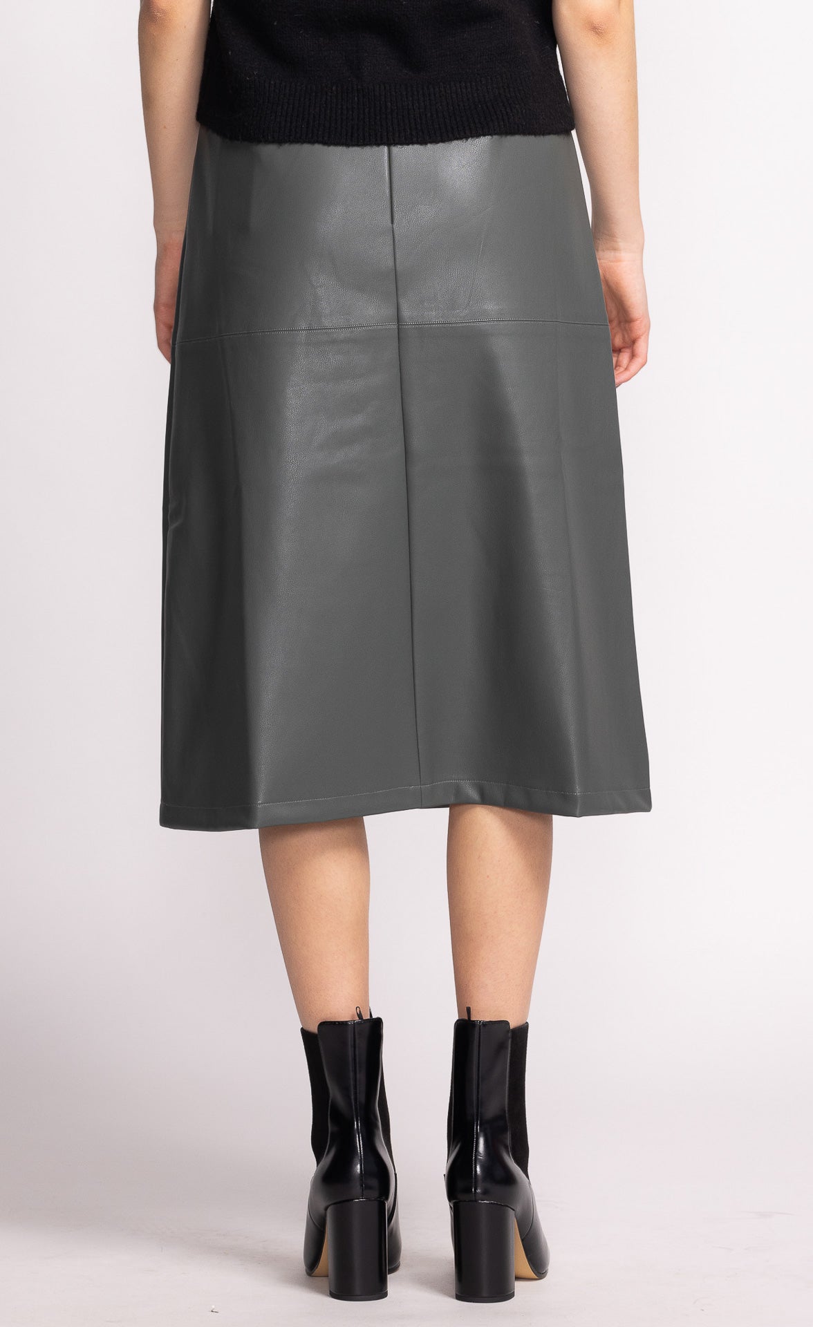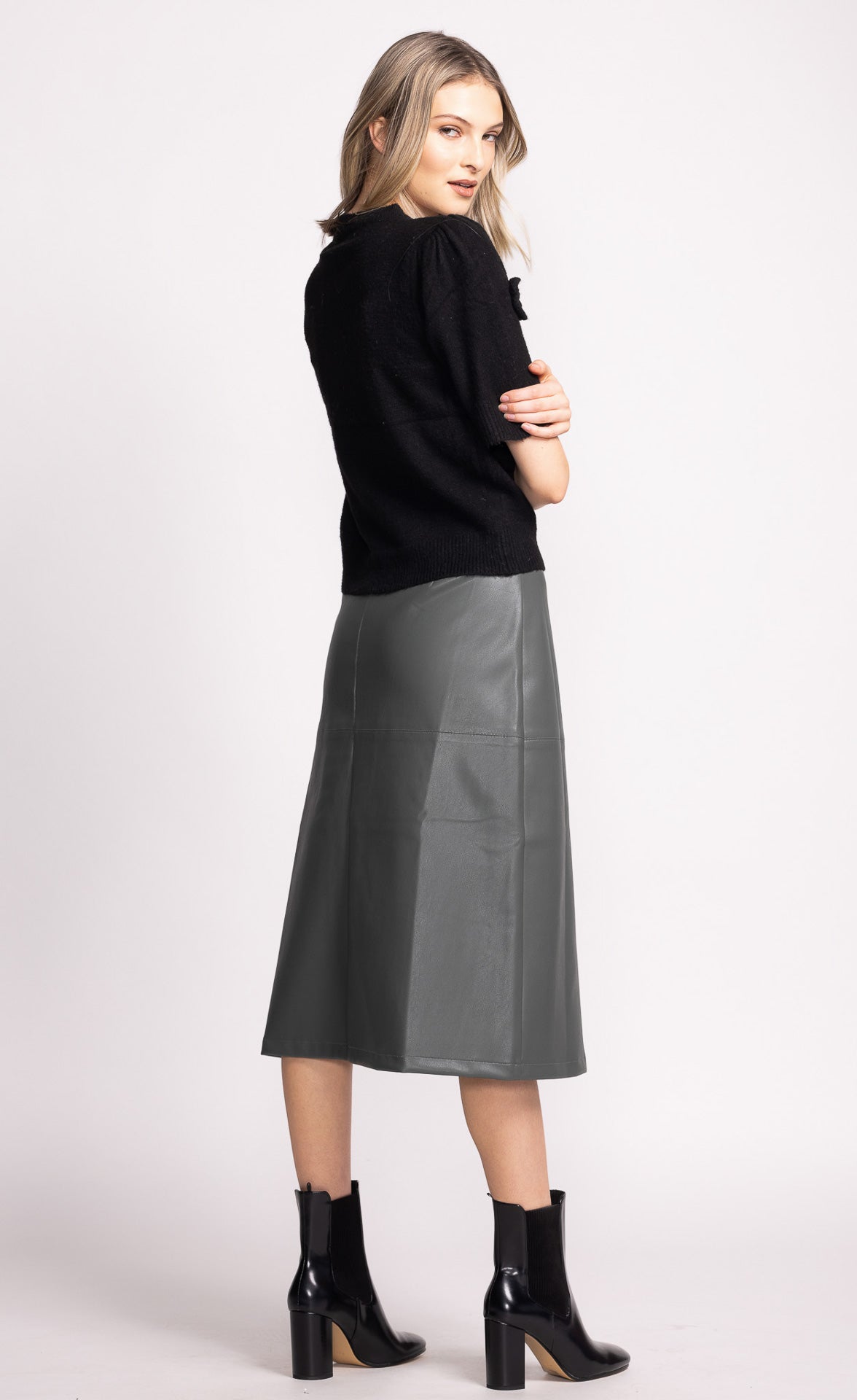 The Peyton Skirt is a chic mid-length faux leather piece that adds a touch of sophistication to any outfit. Style it with a tucked-in blouse and heels for a polished look!
