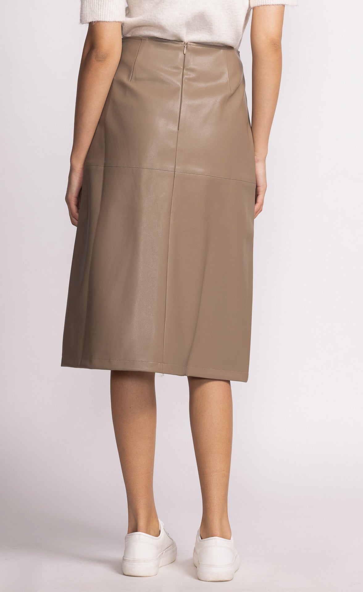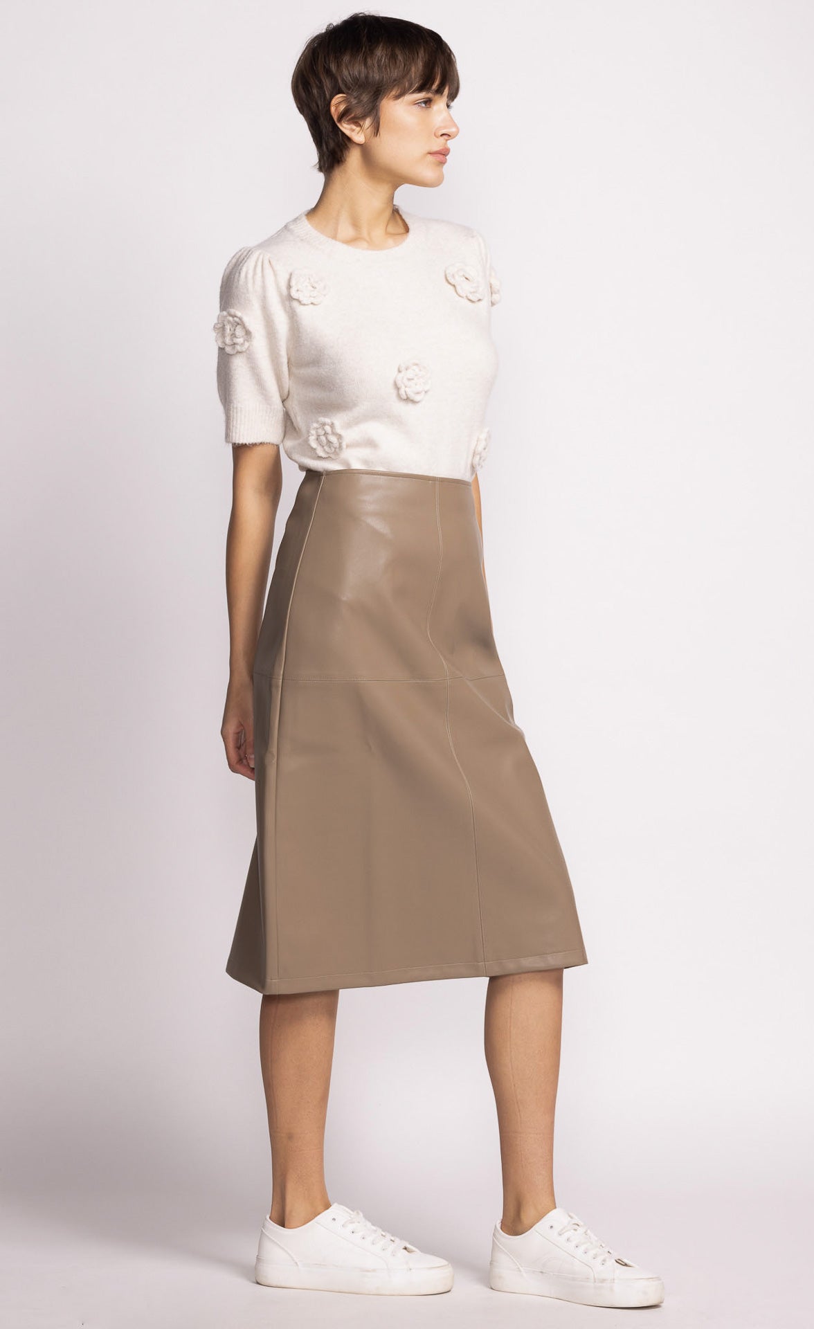 The Peyton Skirt is a chic mid-length faux leather piece that adds a touch of sophistication to any outfit. Style it with a tucked-in blouse and heels for a polished look!