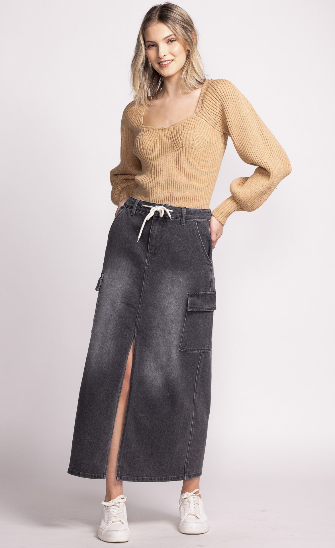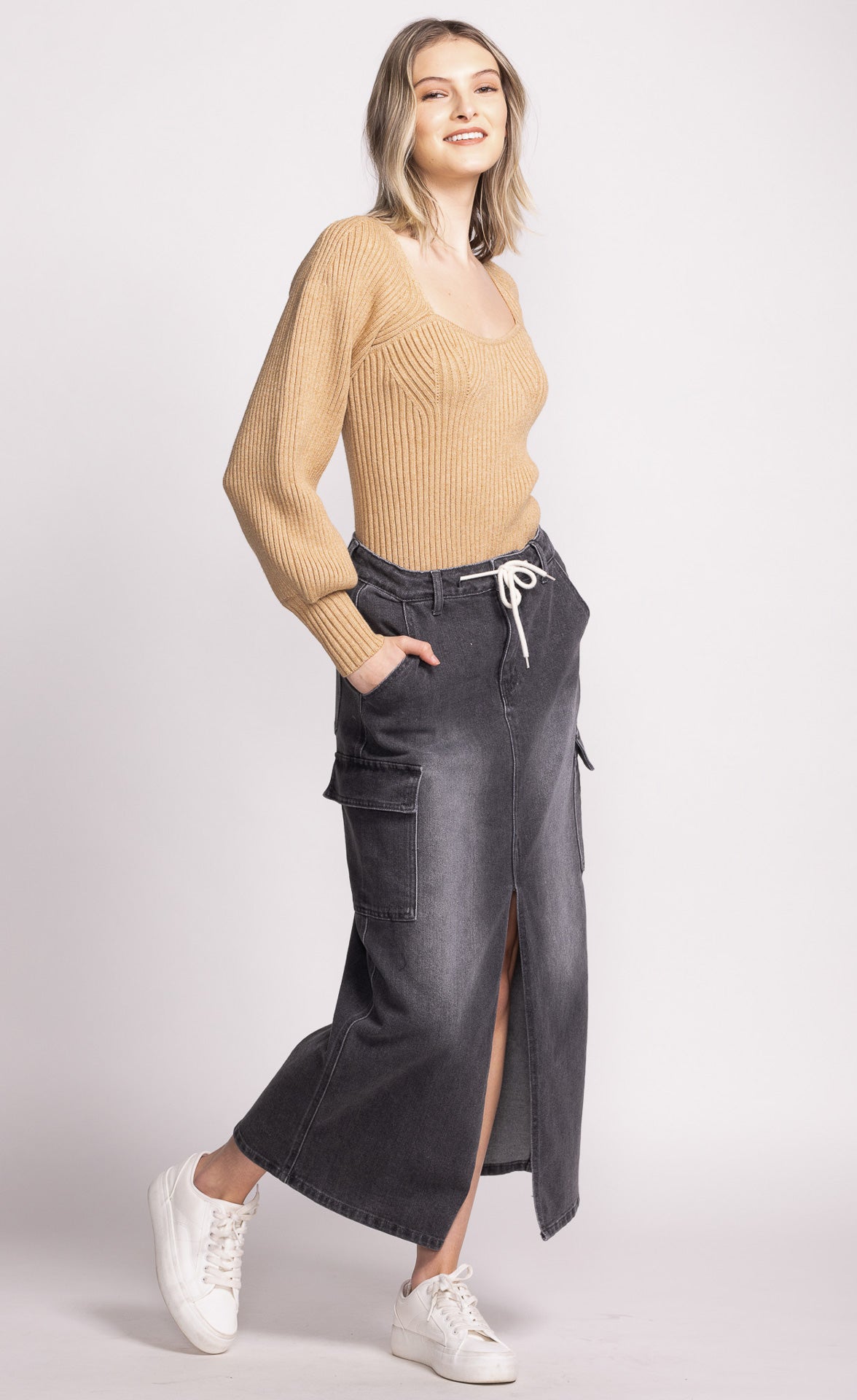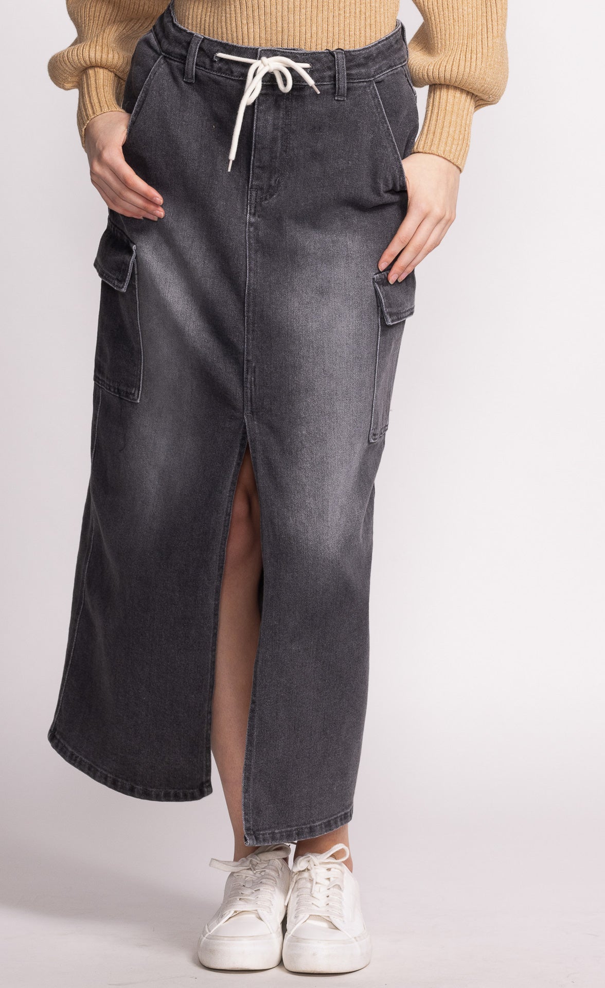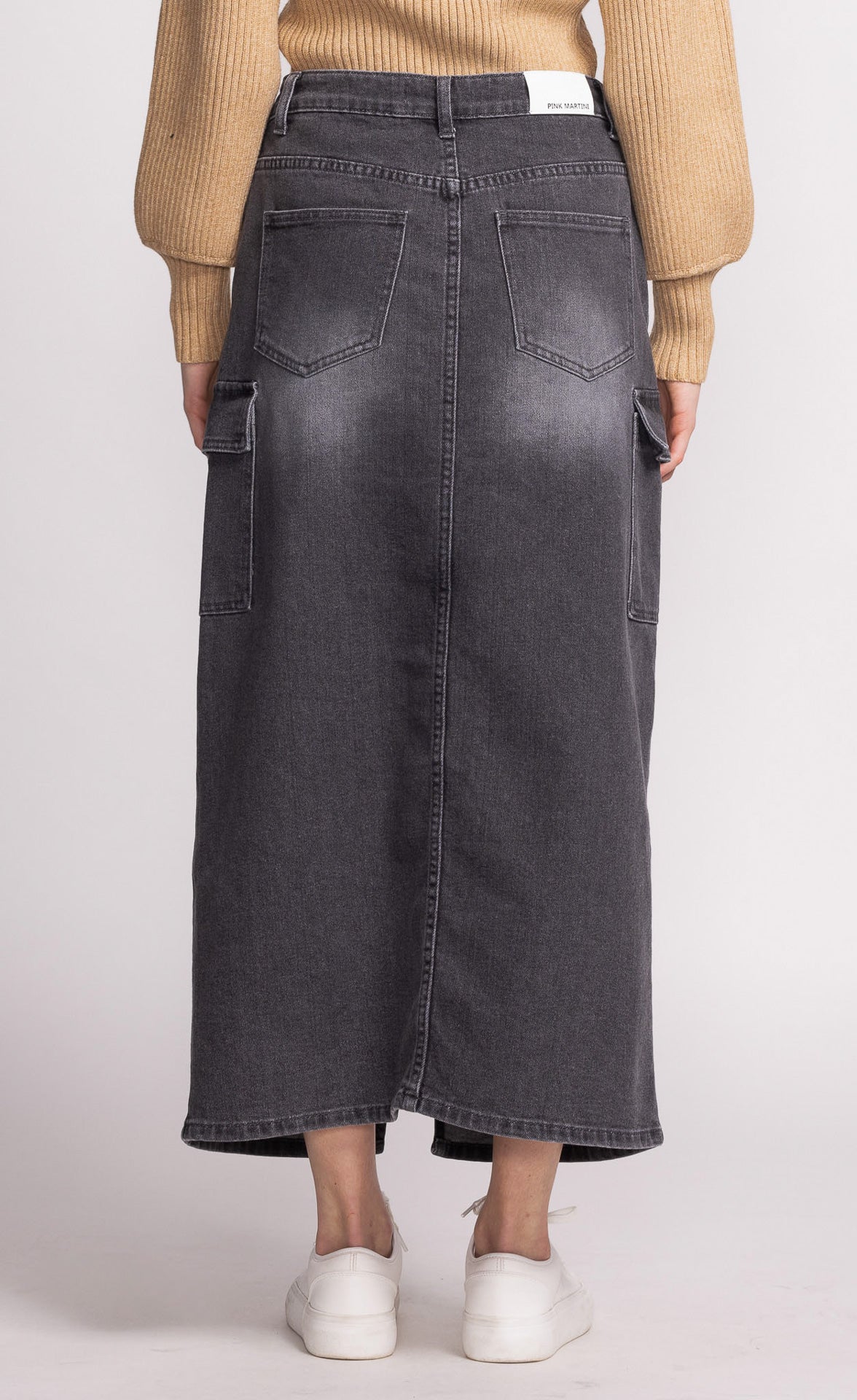 The Renee Denim Skirt is a stylish midi-length denim skirt featuring a chic front slit and convenient side pockets. Perfect for a casual yet polished look.