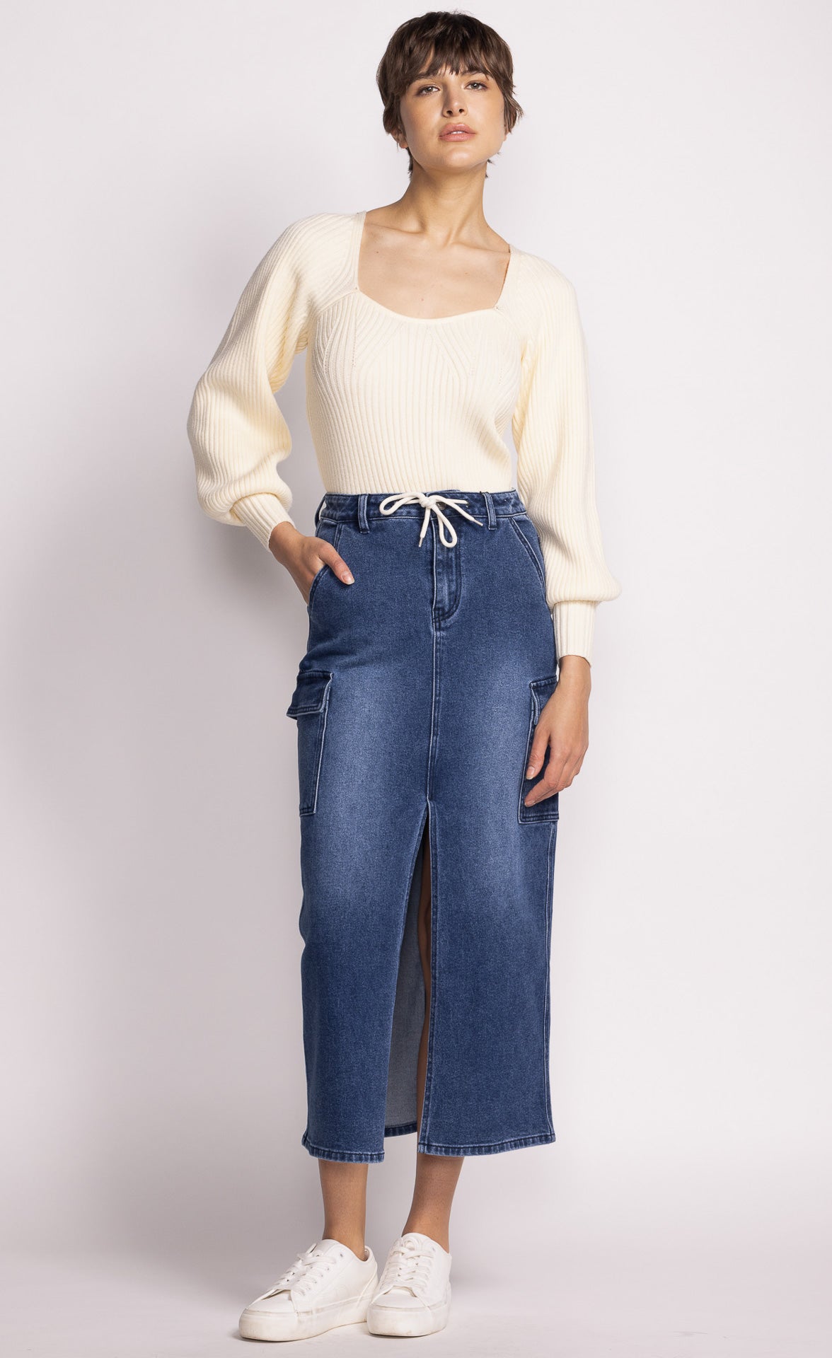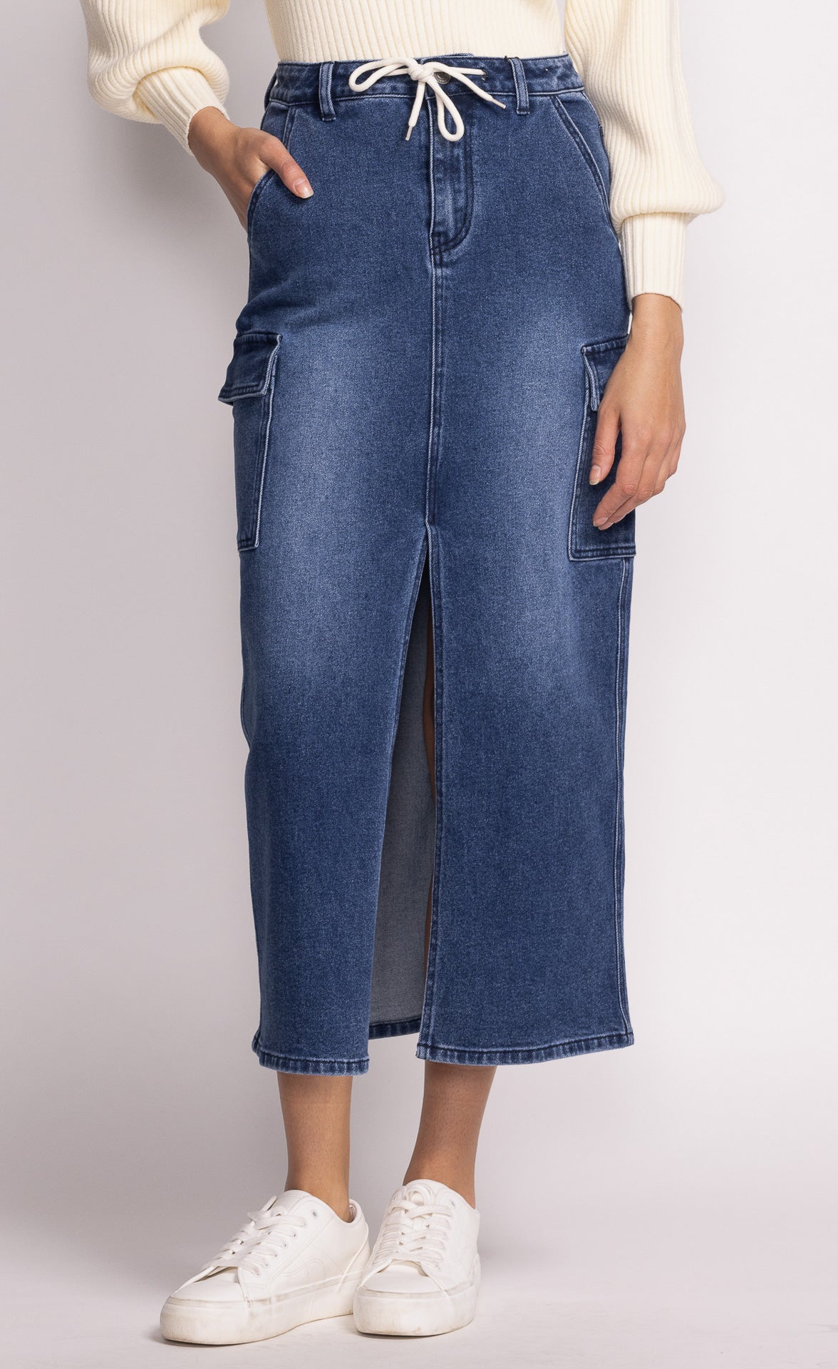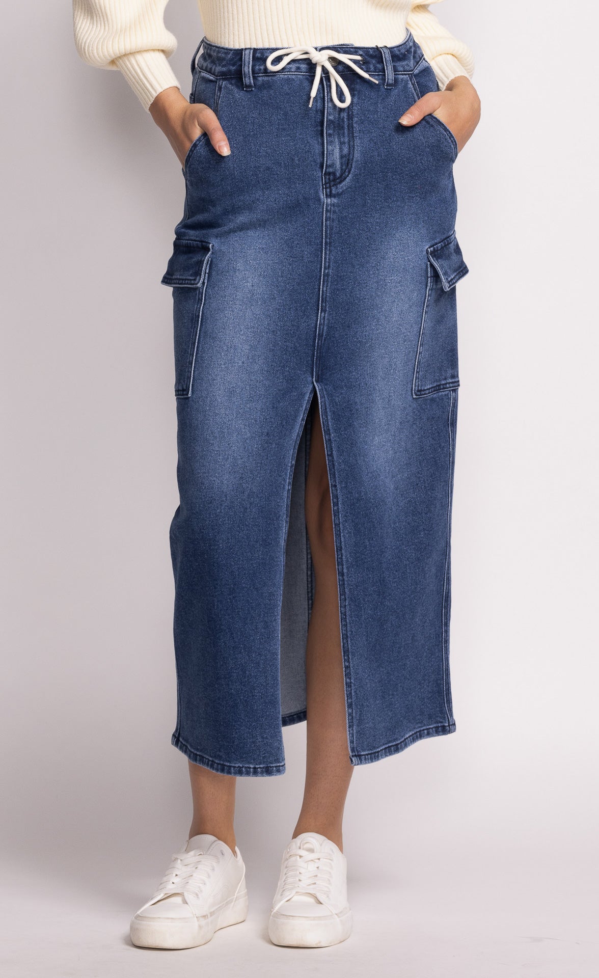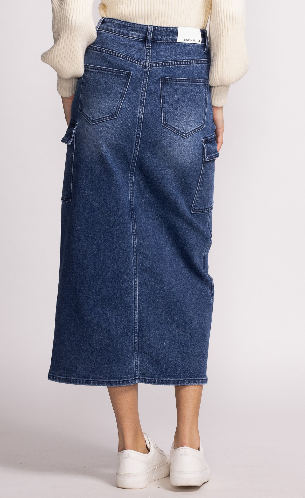 The Renee Denim Skirt is a stylish midi-length denim skirt featuring a chic front slit and convenient side pockets. Perfect for a casual yet polished look.