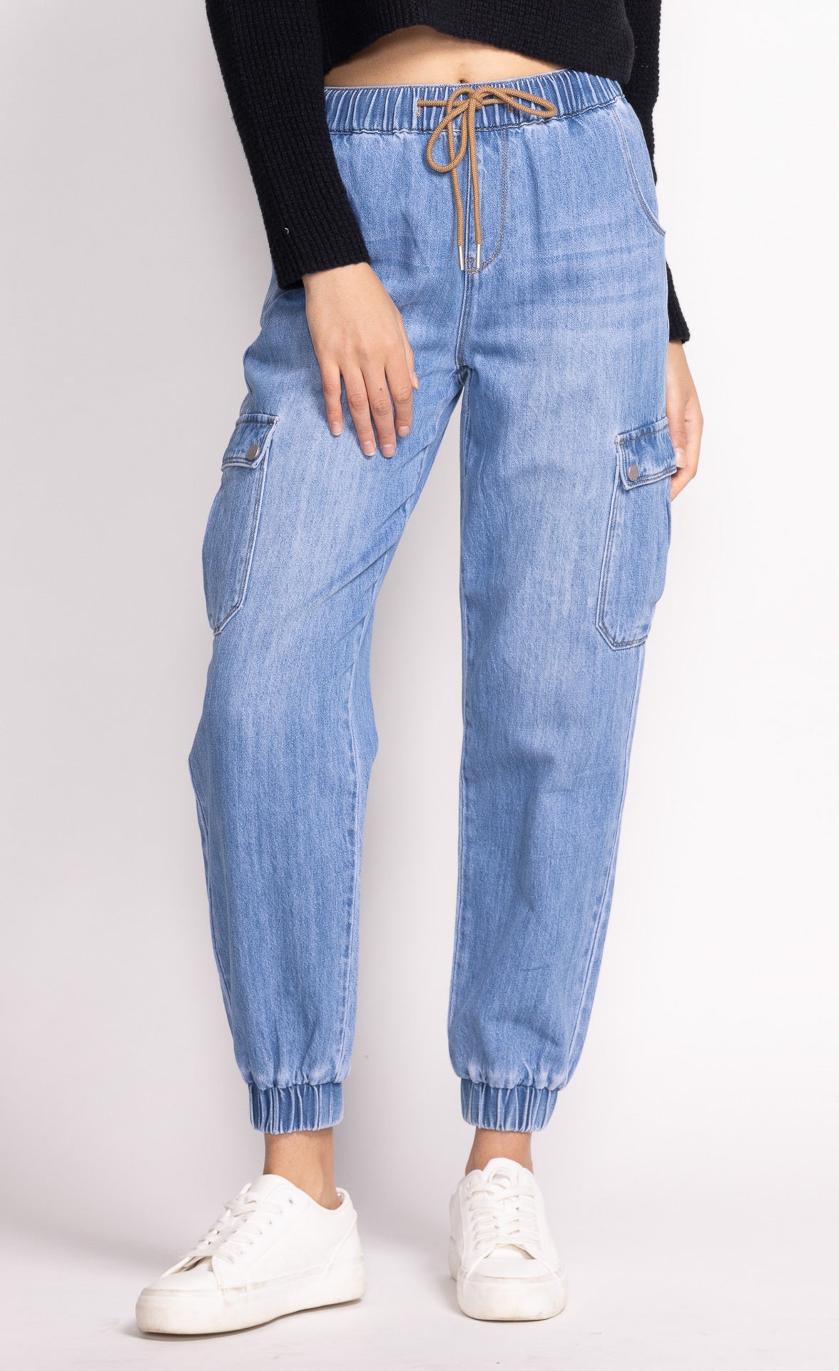 The Simone Denim feature a drawstring waistband, jogger silhouette with elastic leg cuffs, and handy side pockets for a perfect blend of style and comfort.