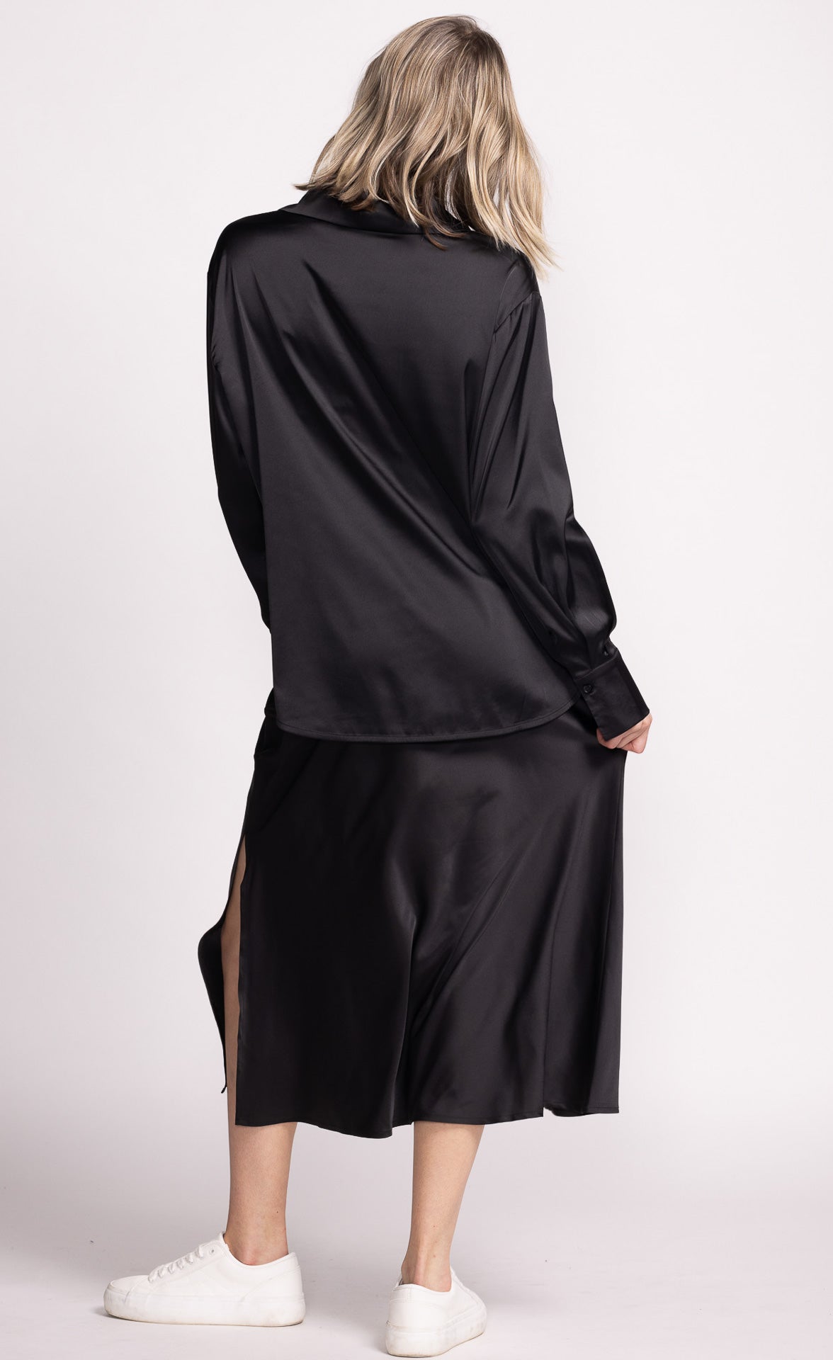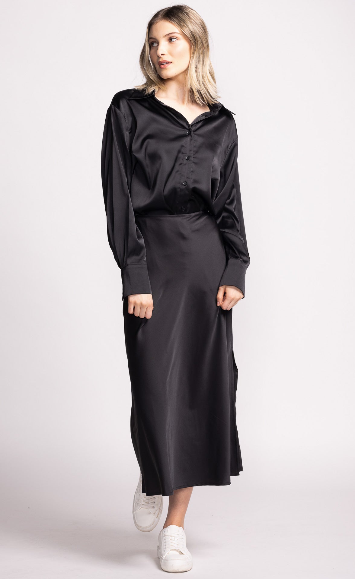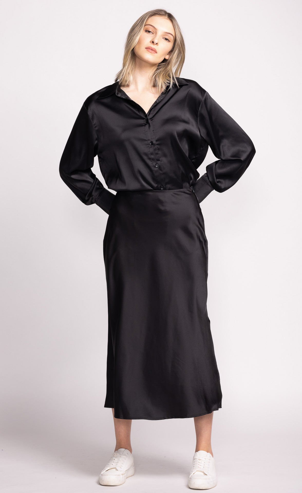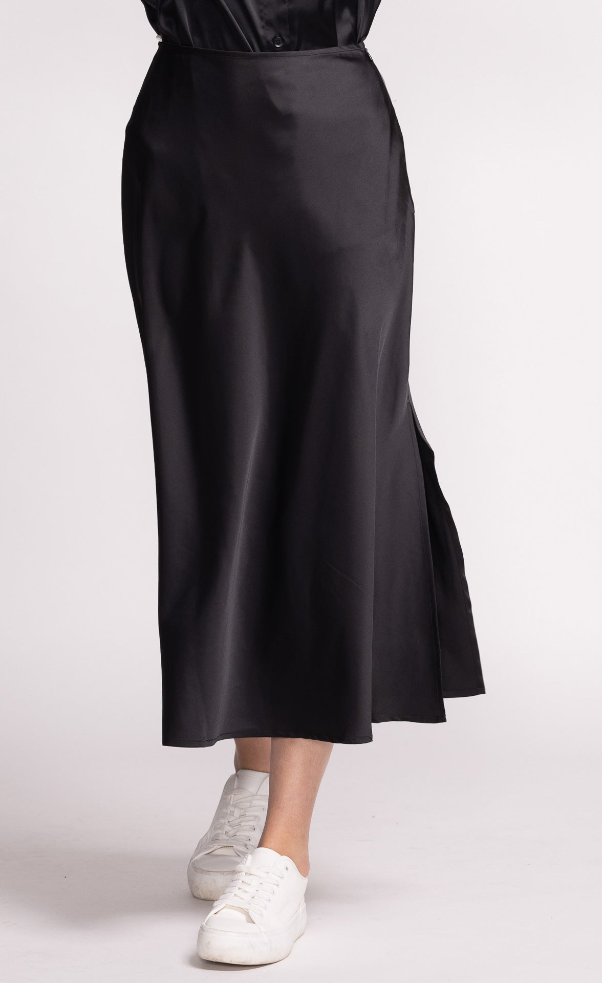 Lena Skirt is a flowy midi skirt in a sleek sheen fabric, perfect for elevating cozy looks. Features a side zip closure and effortless versatility. Style it with a chunky sweater for a chic contrast!