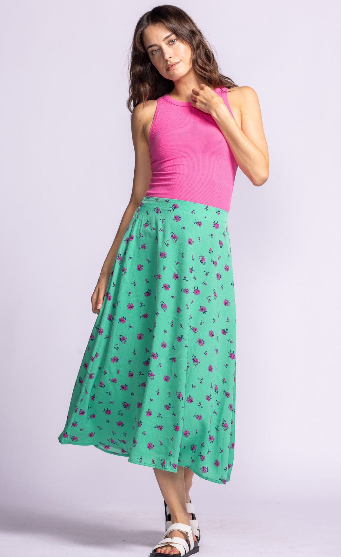 The Vicky Skirt features a beautiful floral print and a flowy silhouette with a comfortable back waistband—perfect for a breezy, feminine look!