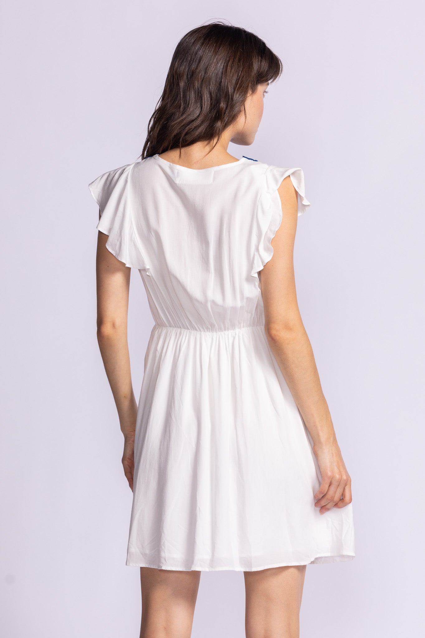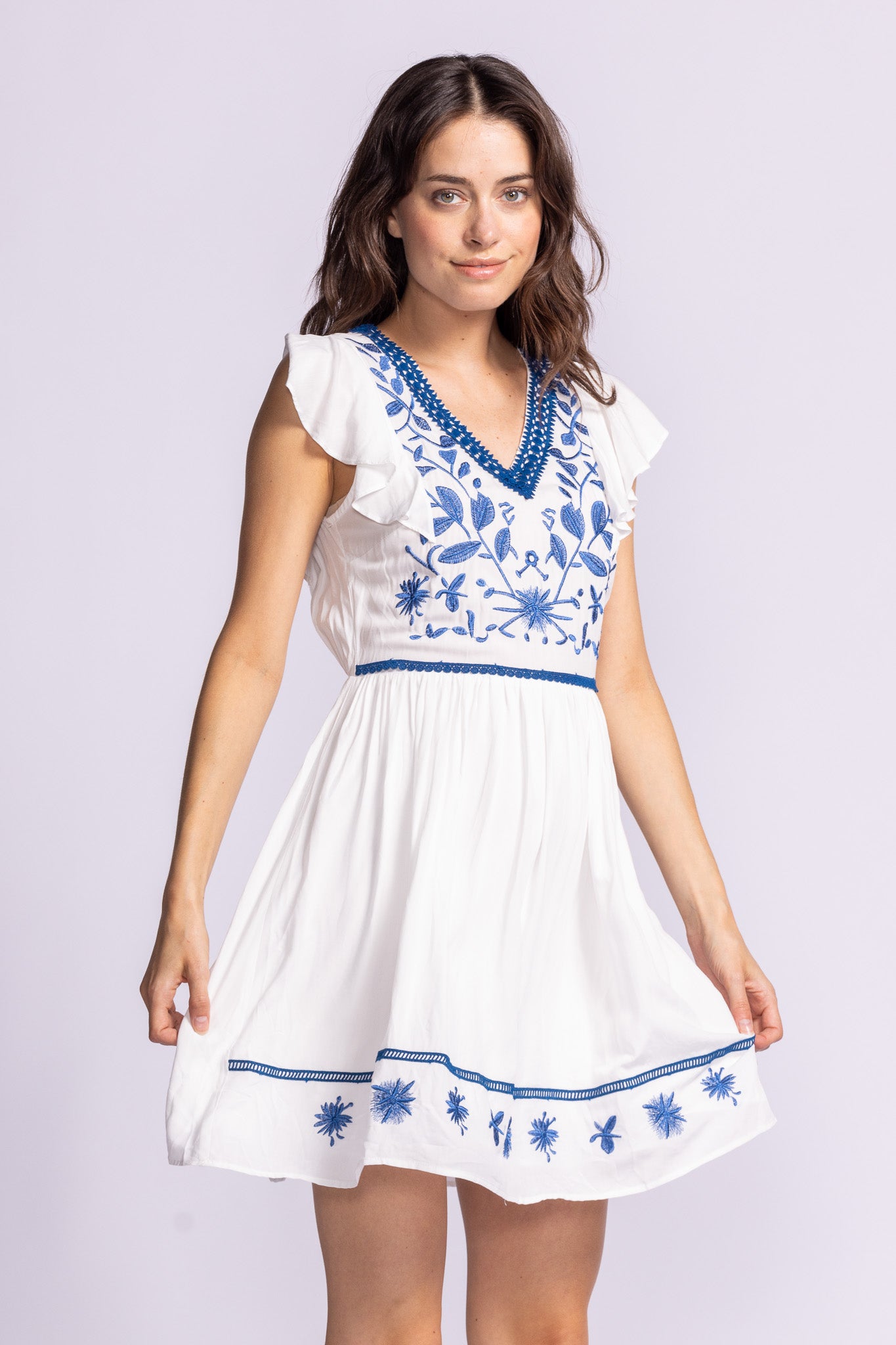 The Adrienne Dress is a fit-and-flare dress featuring a flattering V-neck, embroidered bodice, ruffled sleeves, and a cinched waist. Lightweight and easy to wear for a sunny day out or your next getaway.