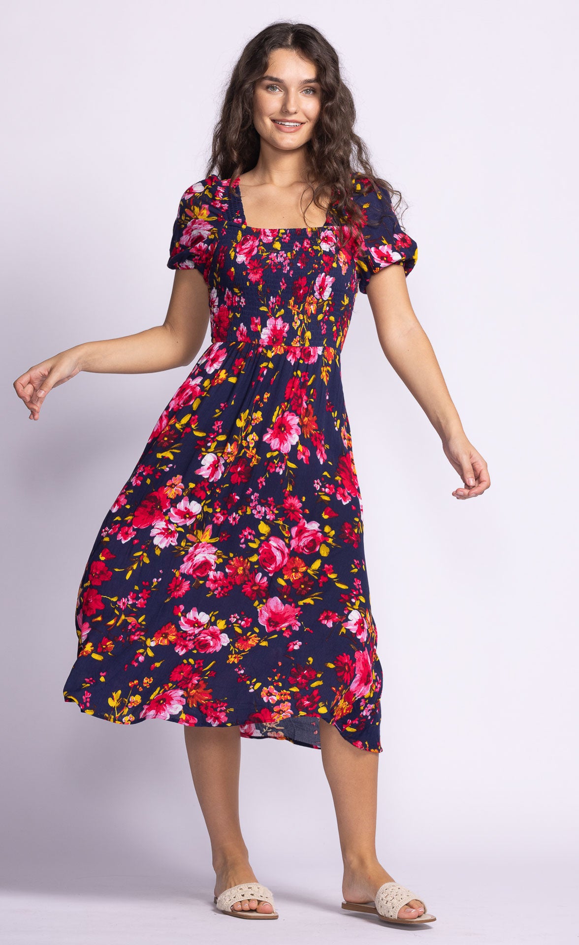 The Francesca Dress features a dreamy floral print with cinched sleeves, a ruched bodice for a flattering stretch-to-fit look, and a flowy skirt. Lightweight and versatile, it's perfect for travel-ready style.