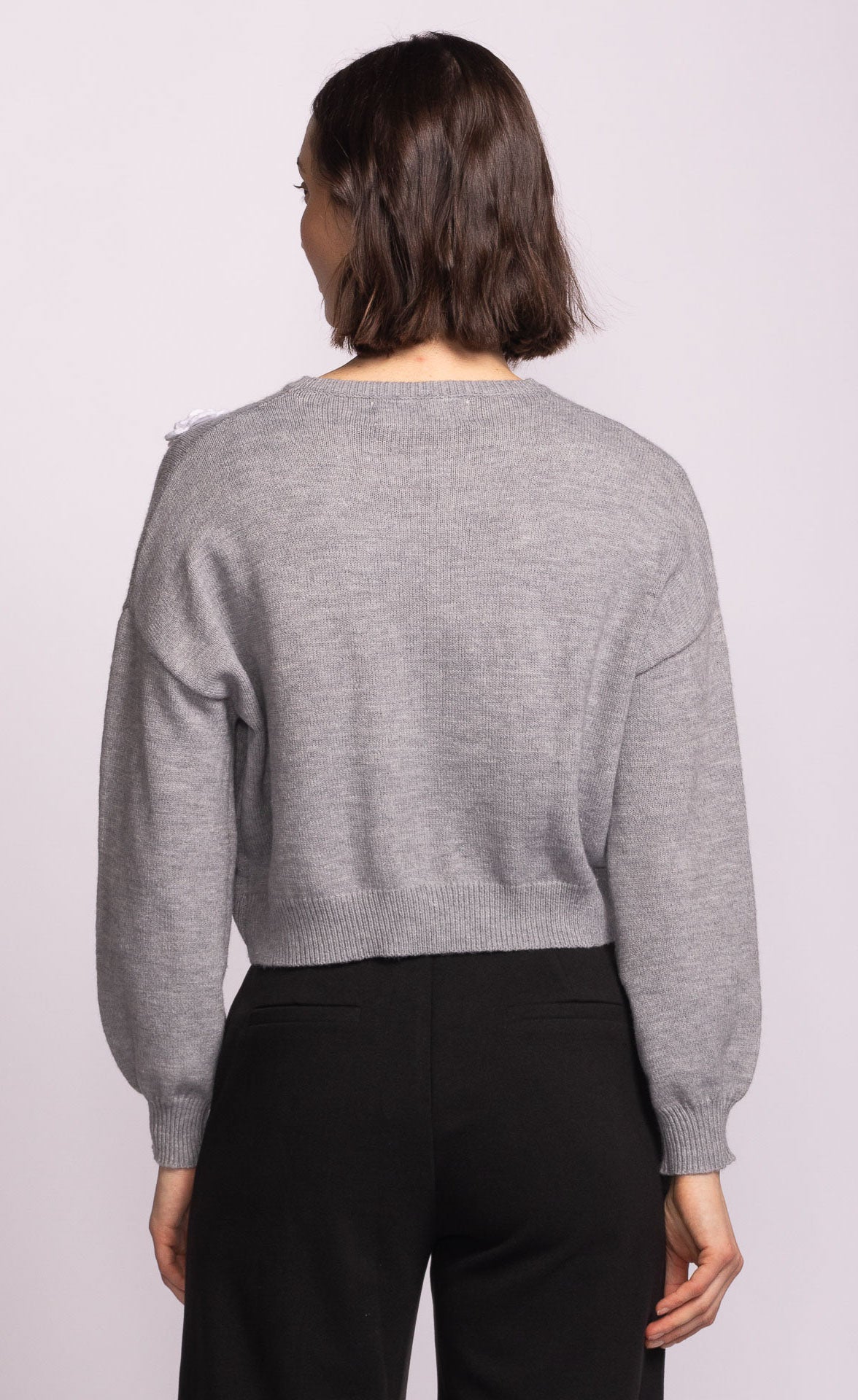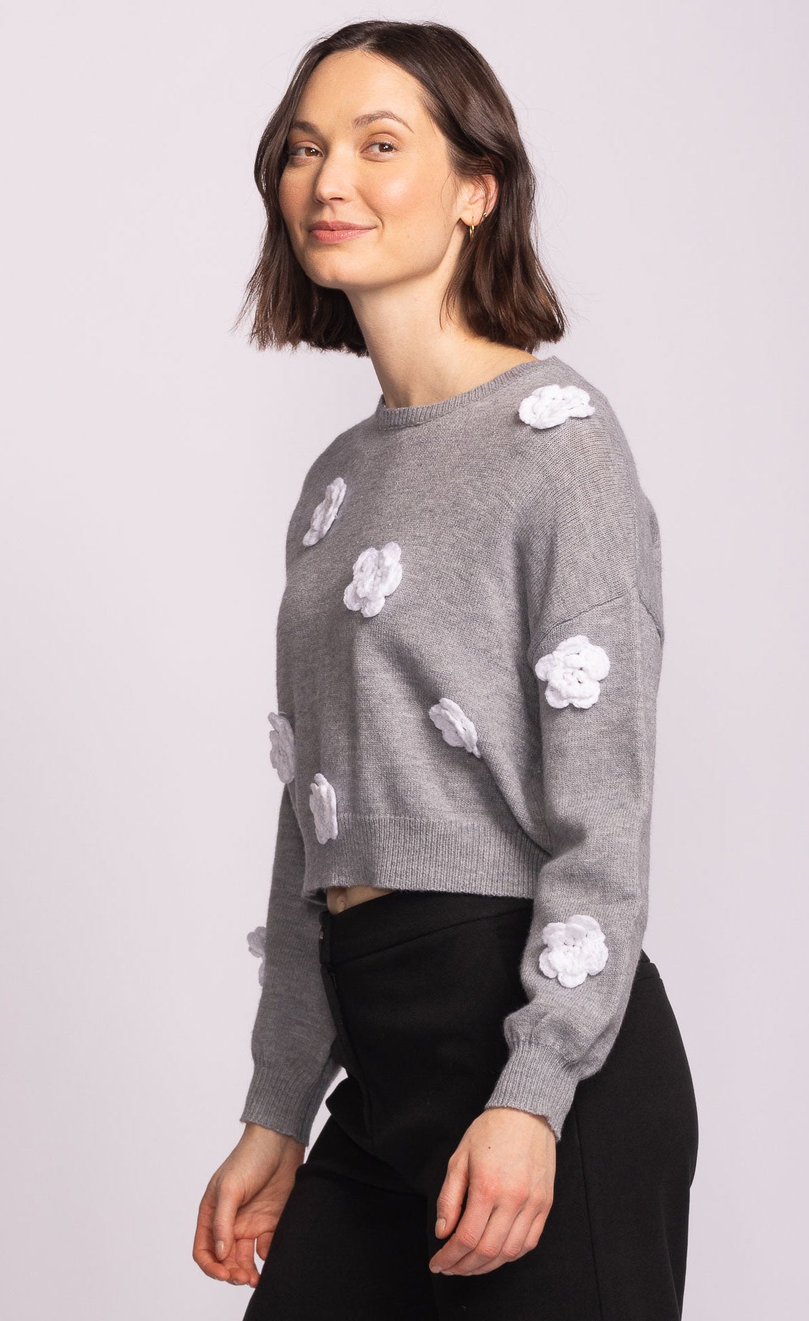 The Dahlia Sweater is a cozy knit cropped pullover designed with contrast 3D floral appliques. Finished with rib-knit trims and a boxy fit, this sweater pairs effortlessly with denim pants, trousers, or a skirt for that comfy-chic look.