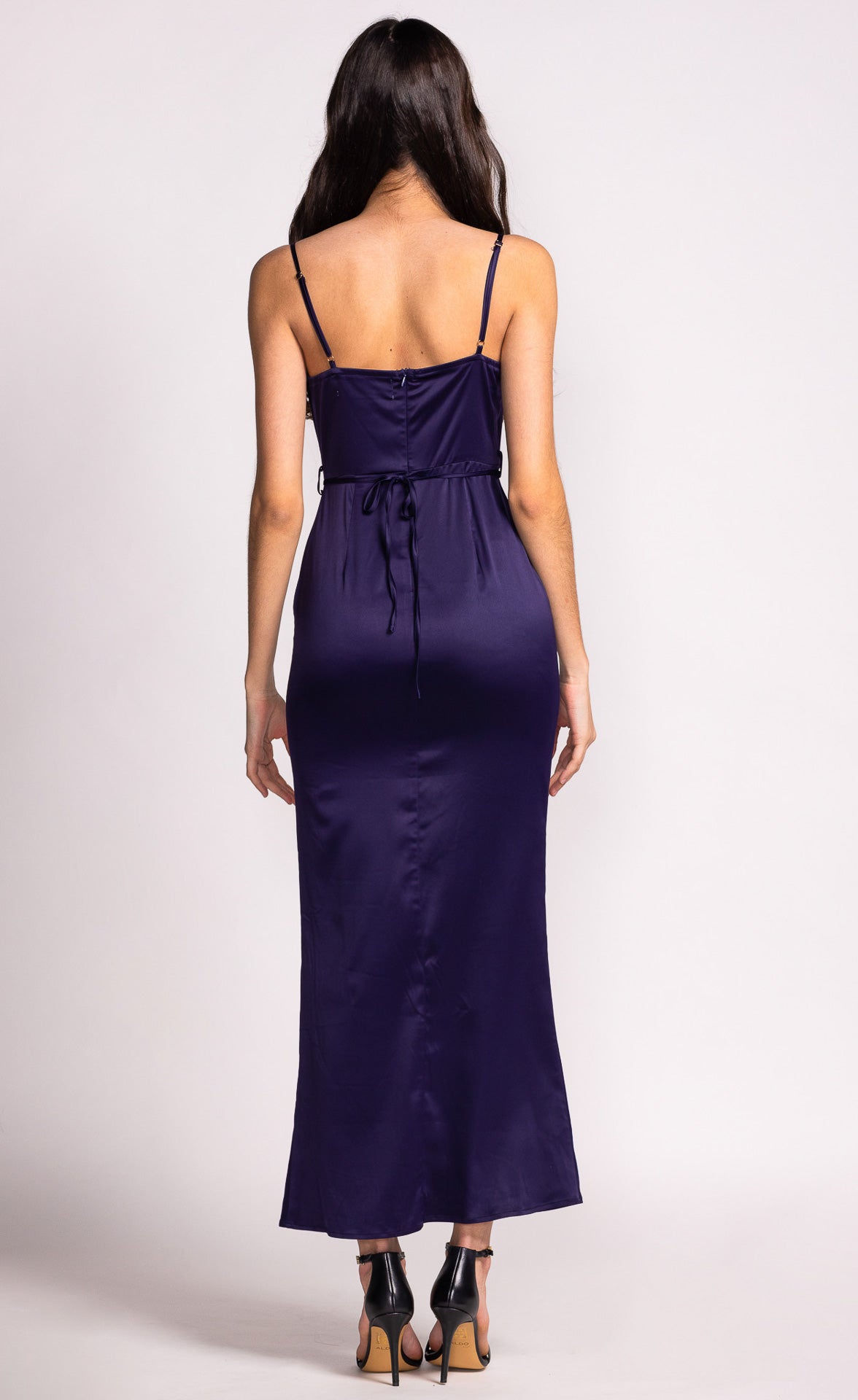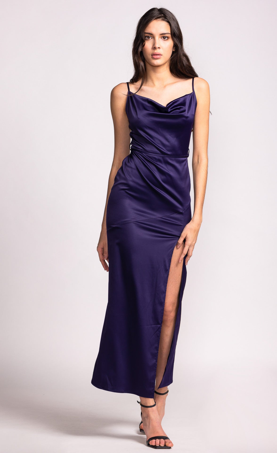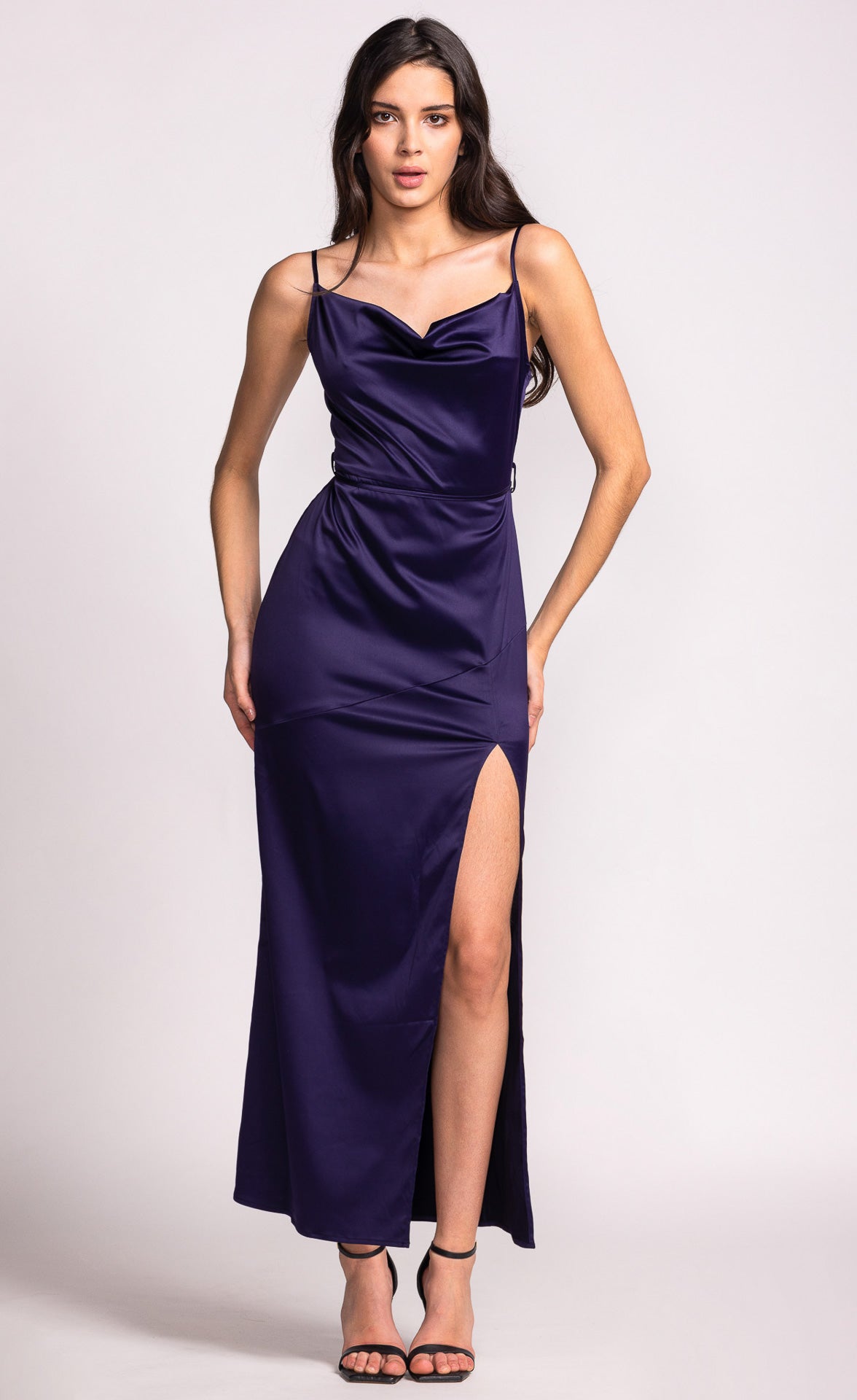 Exude elegance in this long dress featuring a cowl neckline with adjustable straps, a back zip closure, and side slit hem detail. Style with strappy heels and statement earrings for a sophisticated evening look.
