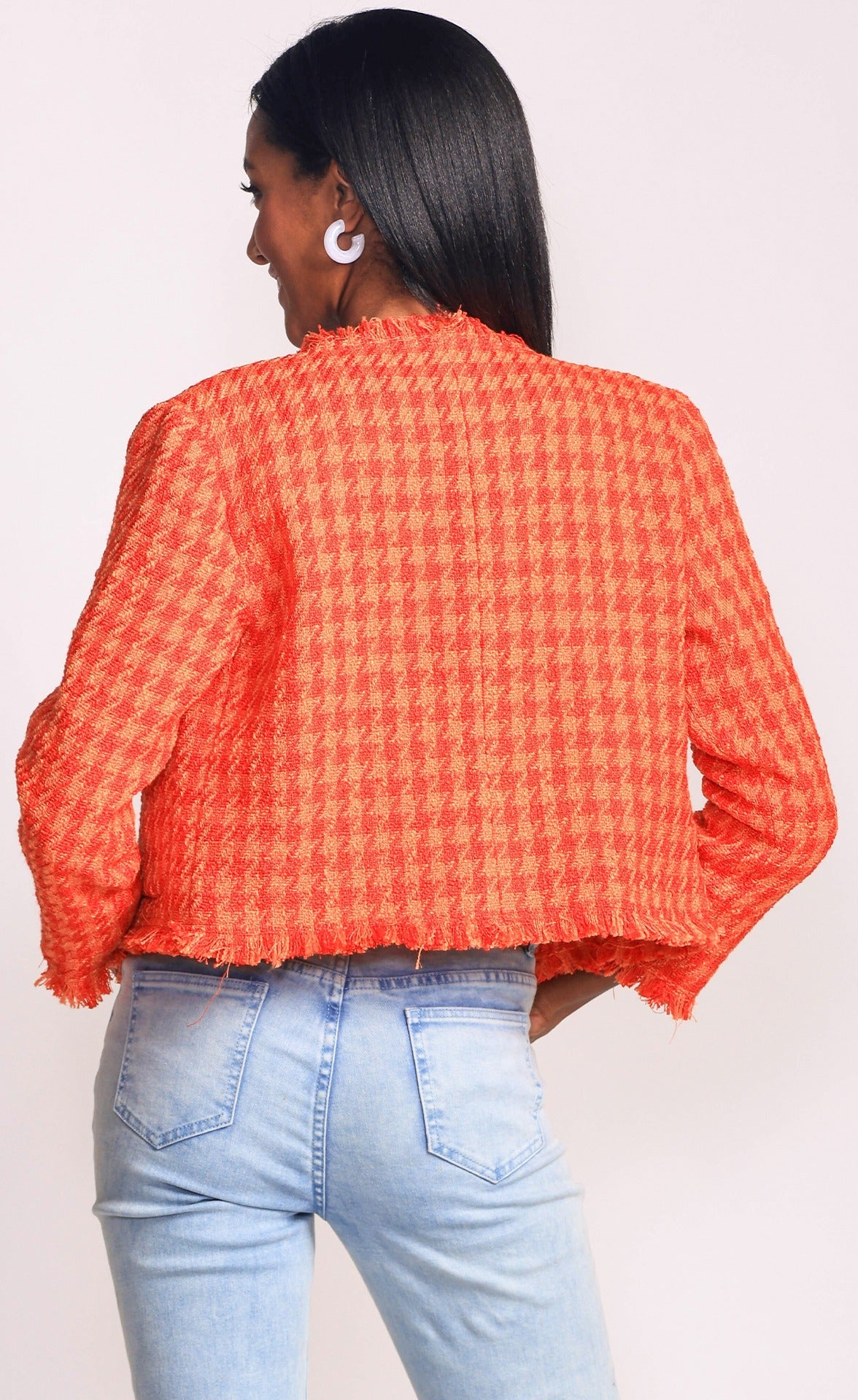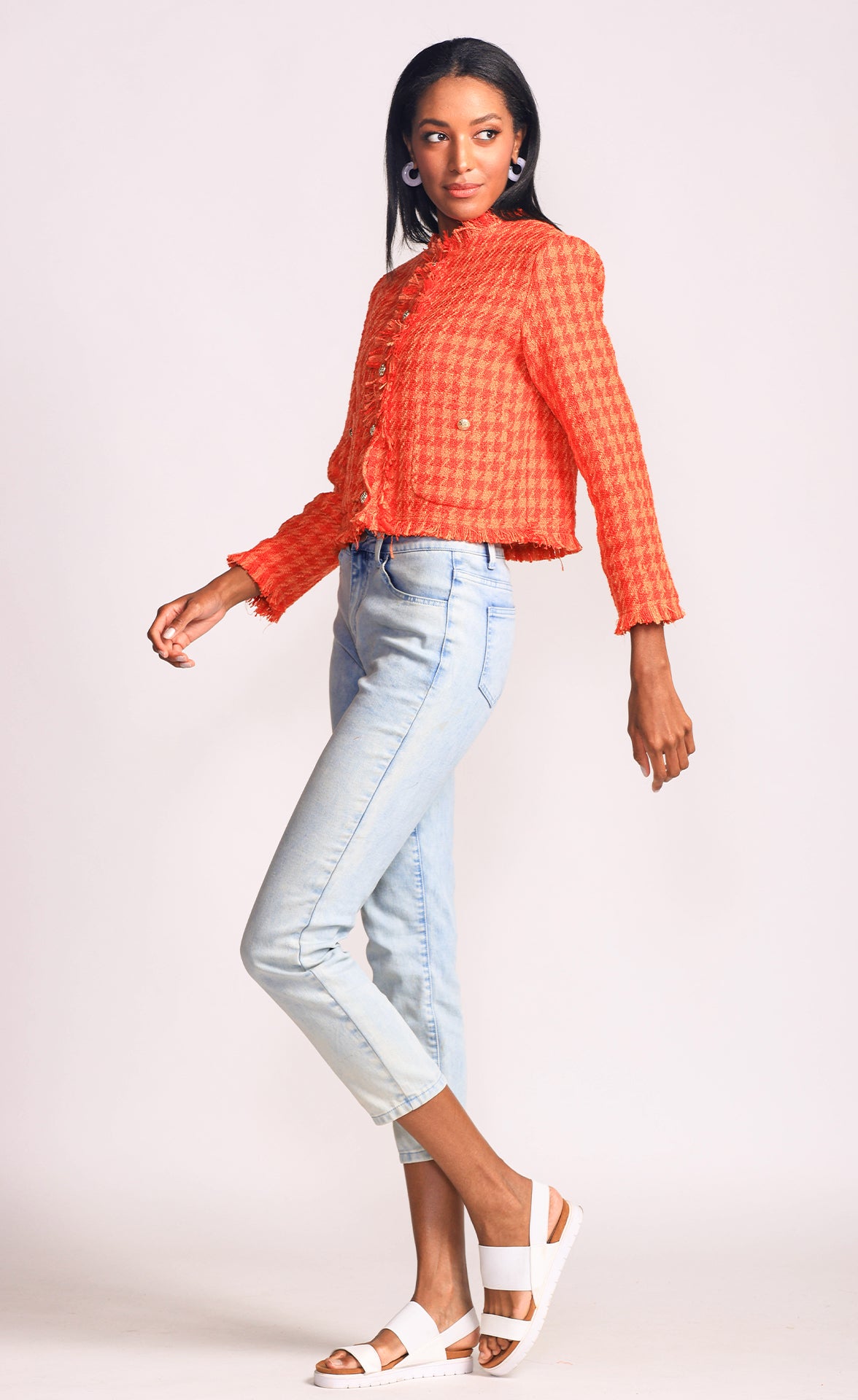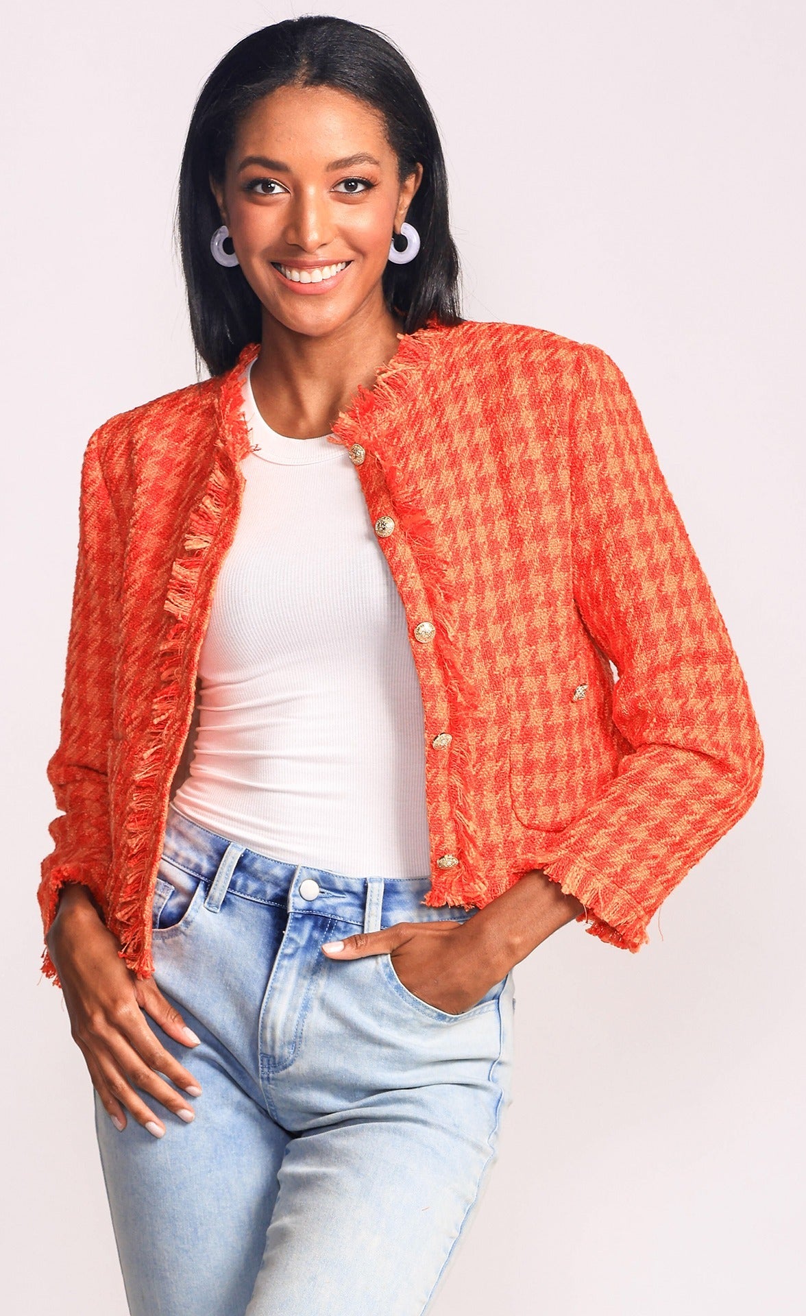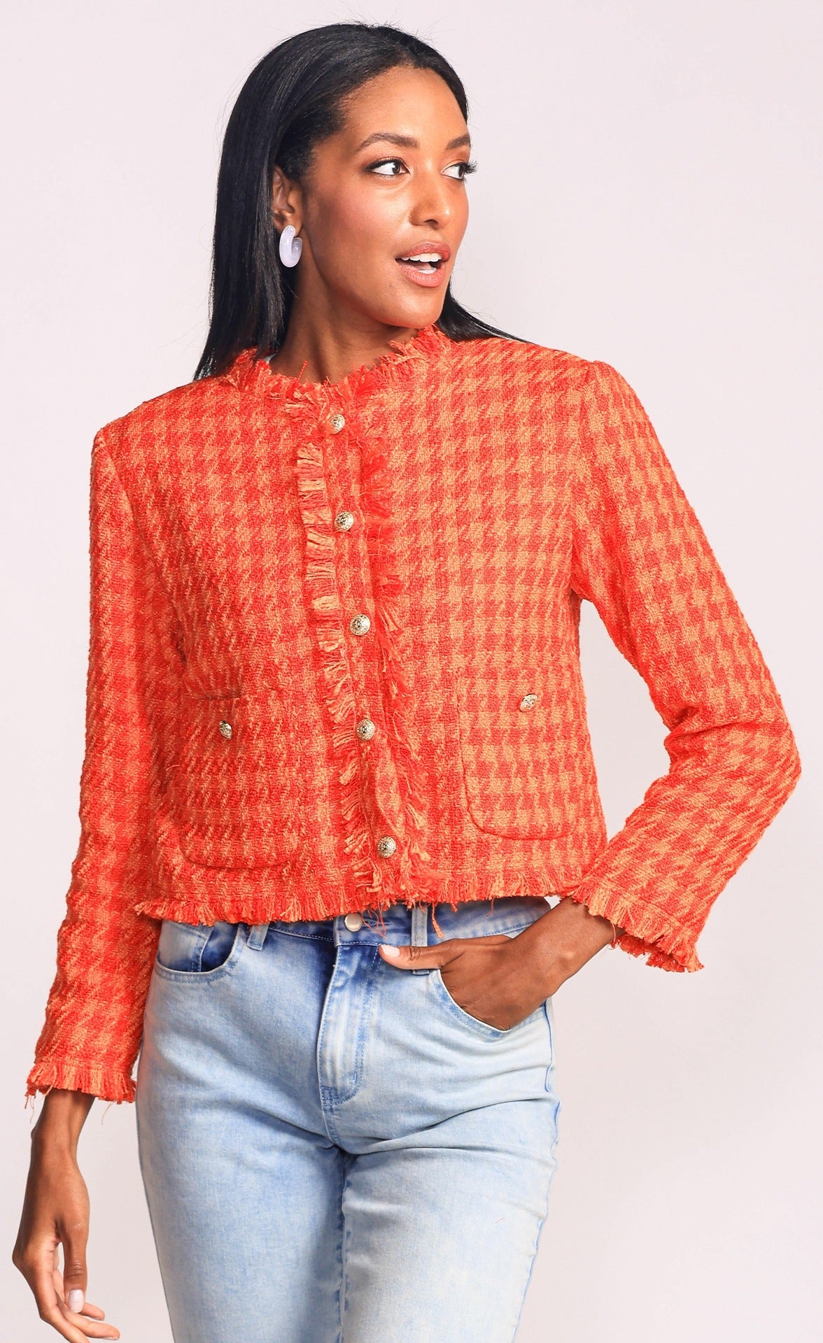 Make a statement with the Mindi Jacket featuring fringe trim and a gold button closure. The epitome of elegance, it's the perfect piece to elevate any outfit.