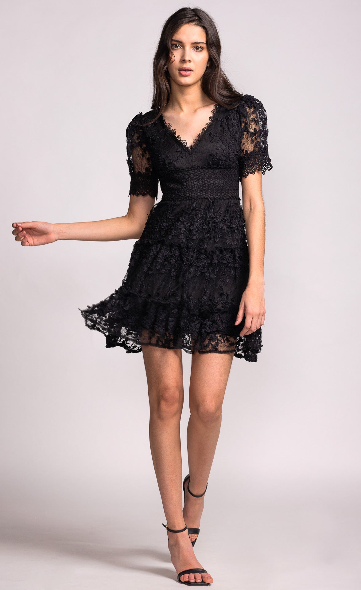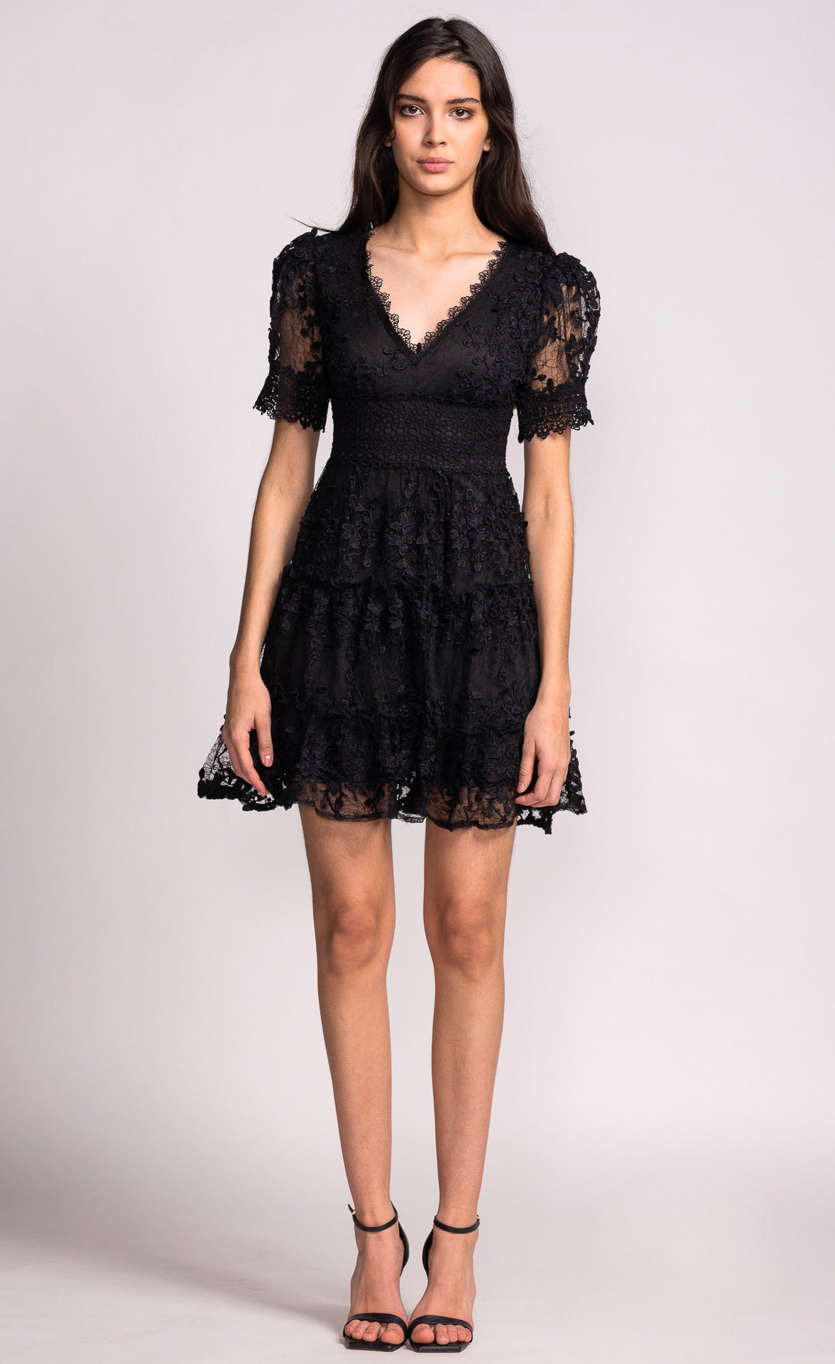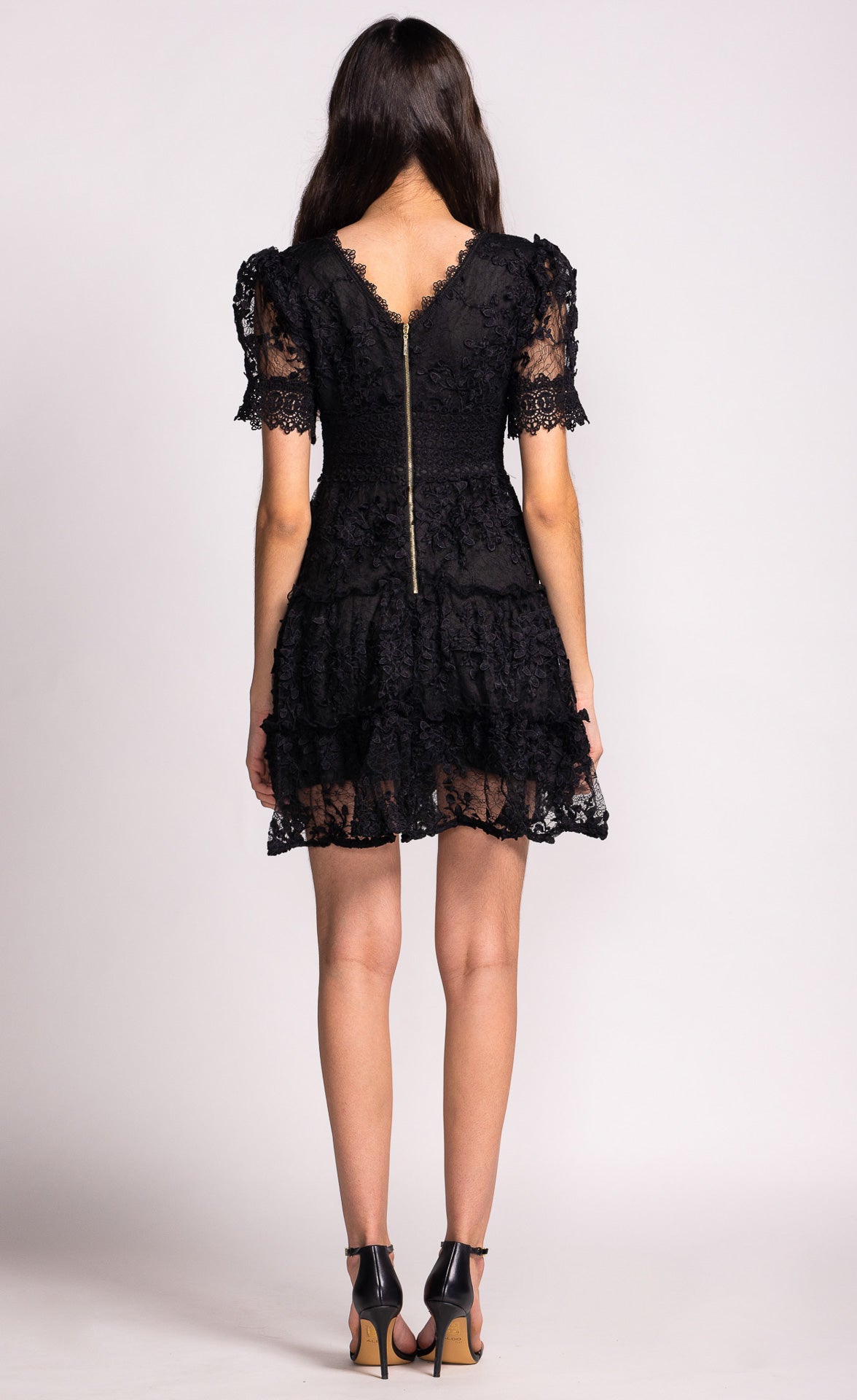 Perfect for a garden gala, this dress features a flattering V-neckline, cinched waist detail, and charming puffed sleeves with lace accents.