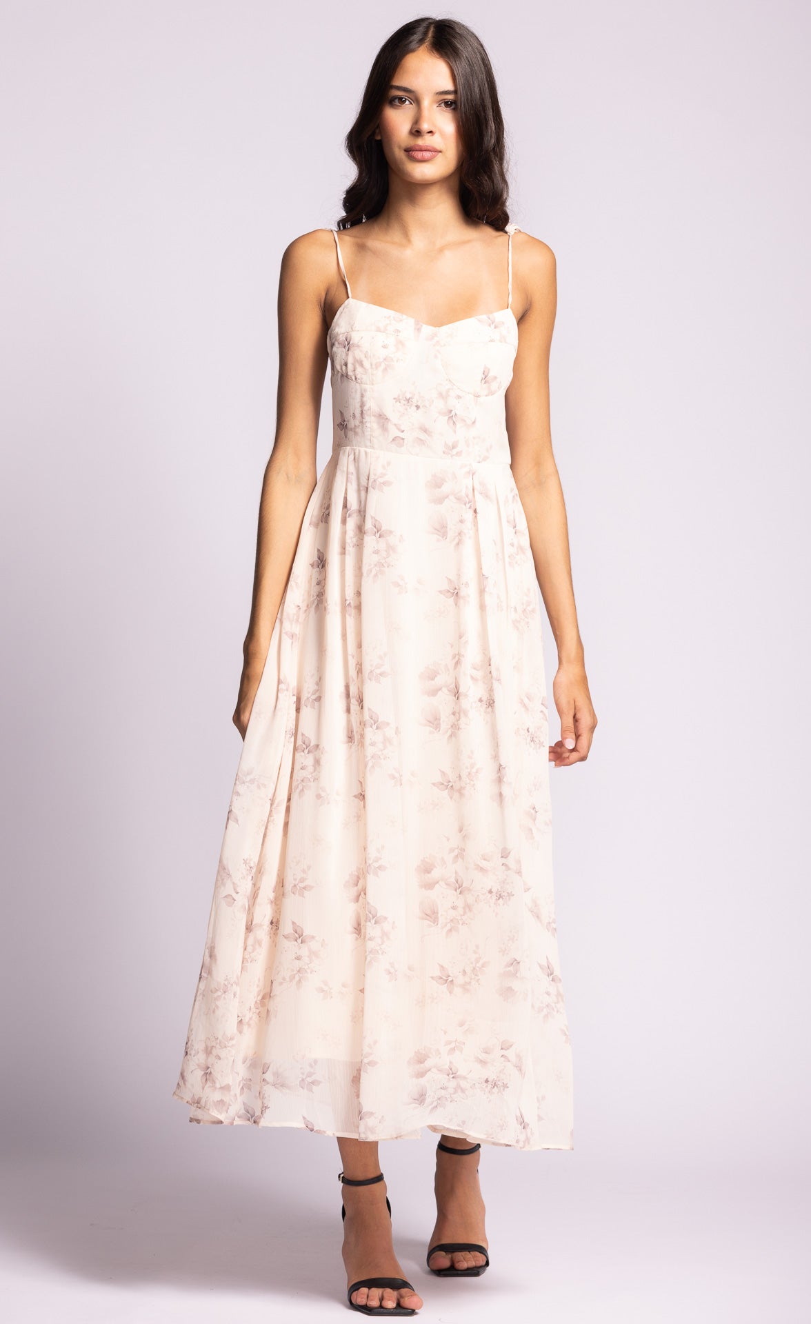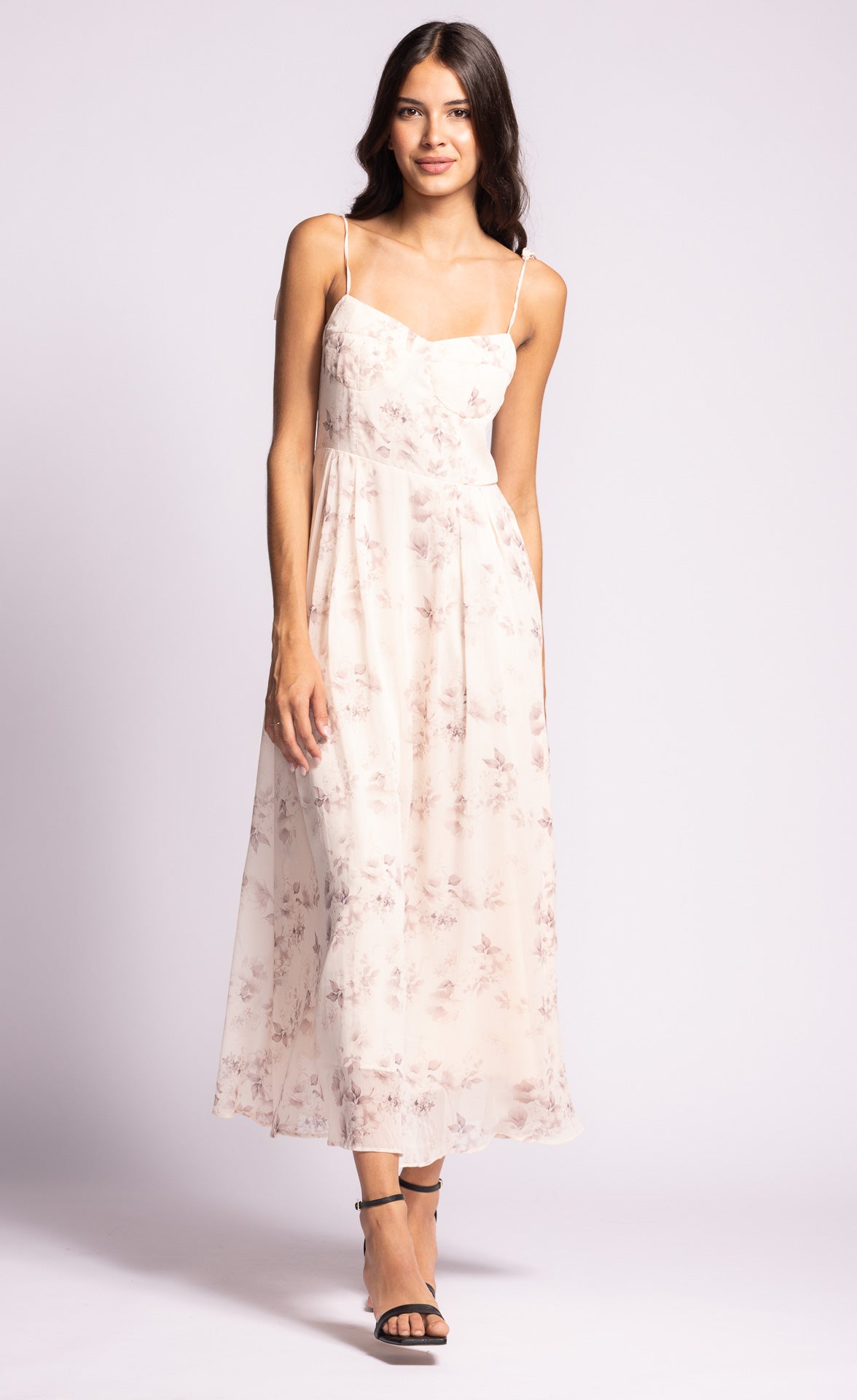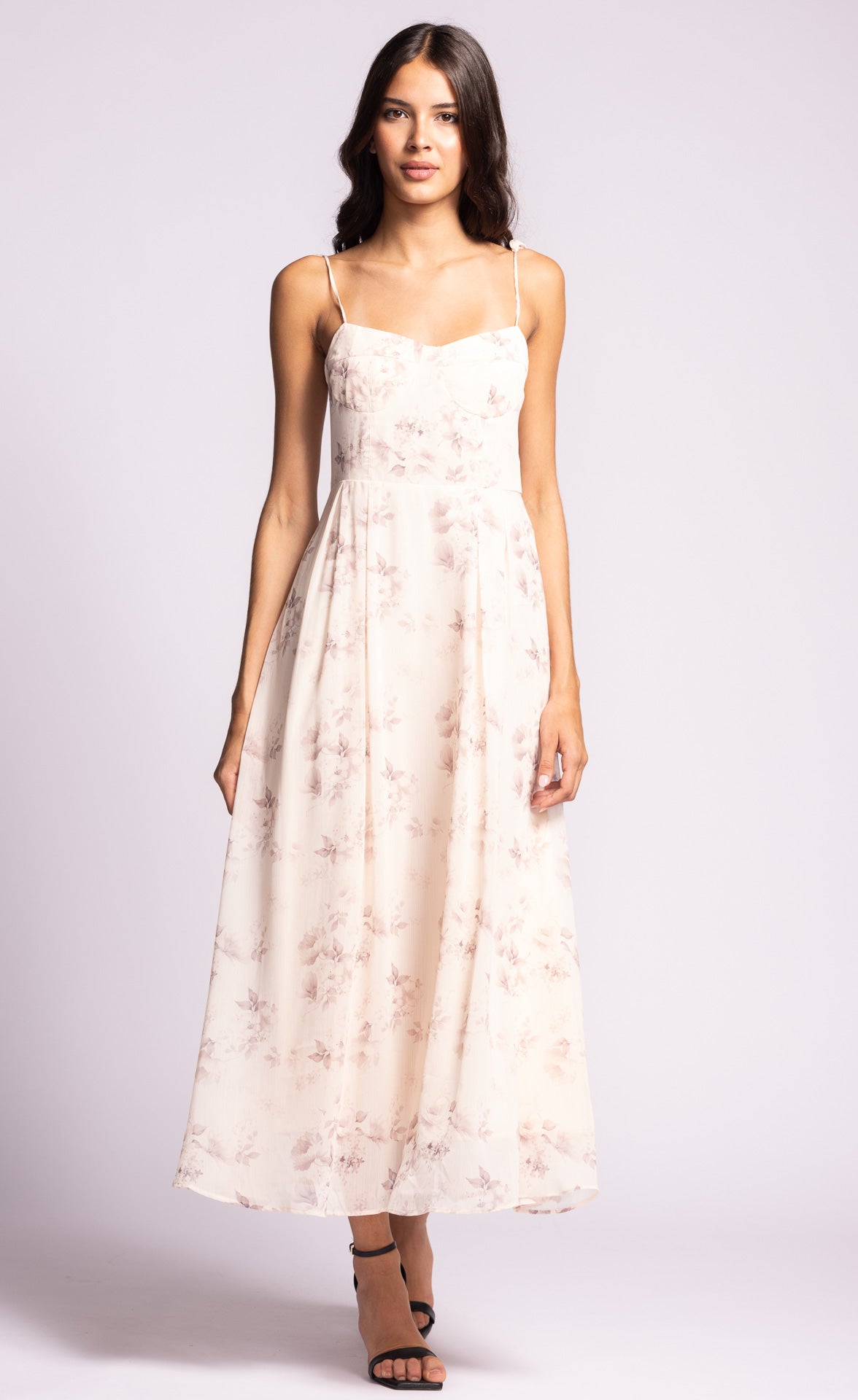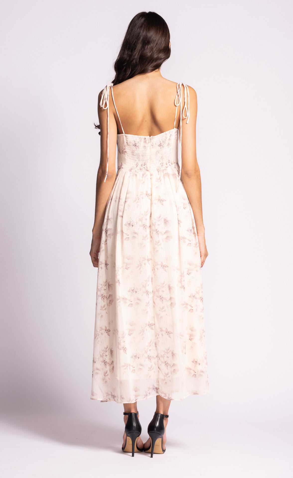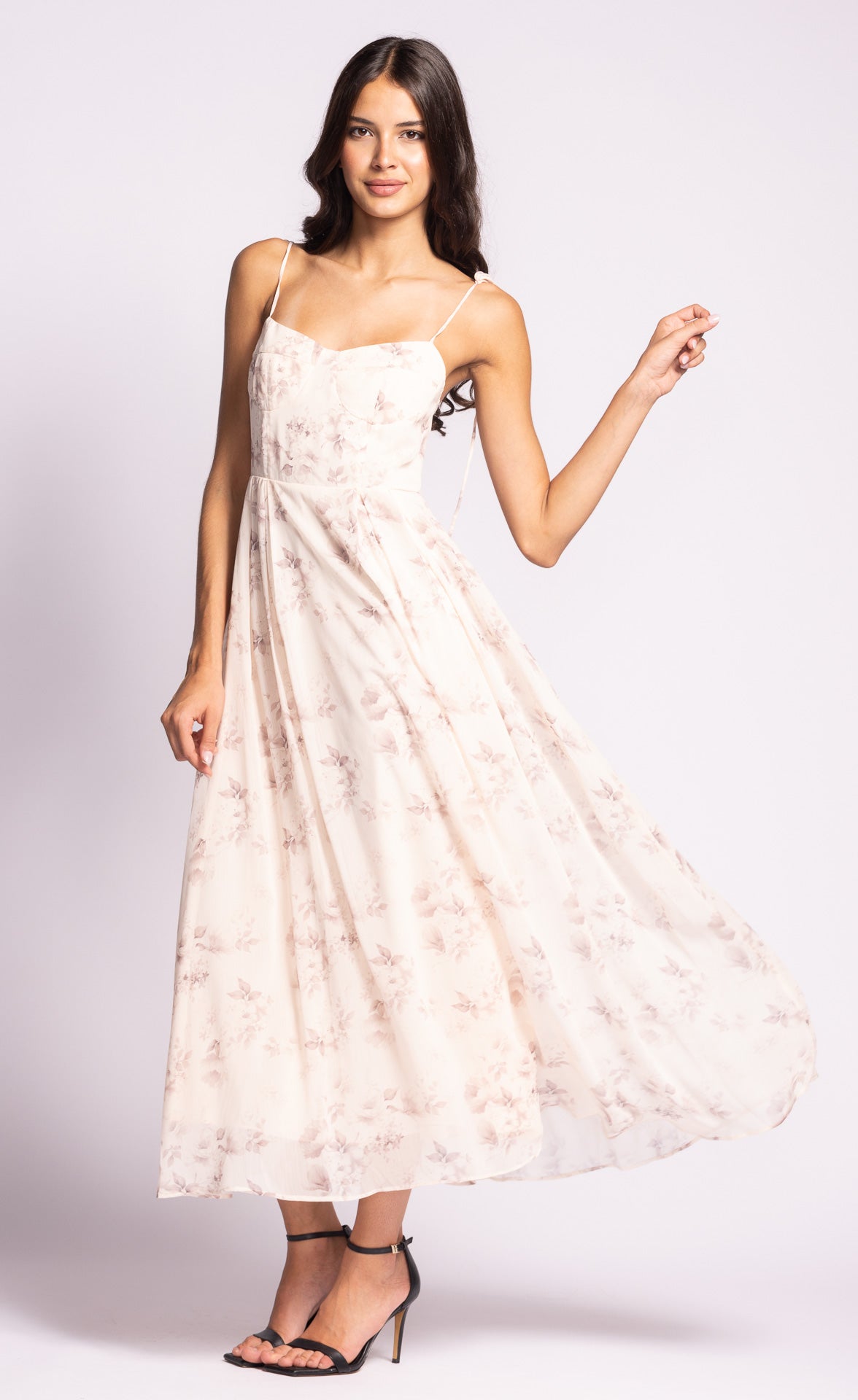 The Layla Dress is a lined midi dress featuring a delicate floral print and self-tie straps. Lightweight and flowy, it drapes effortlessly to create a soft, romantic silhouette. Perfect for any occasion that calls for feminine charm.
