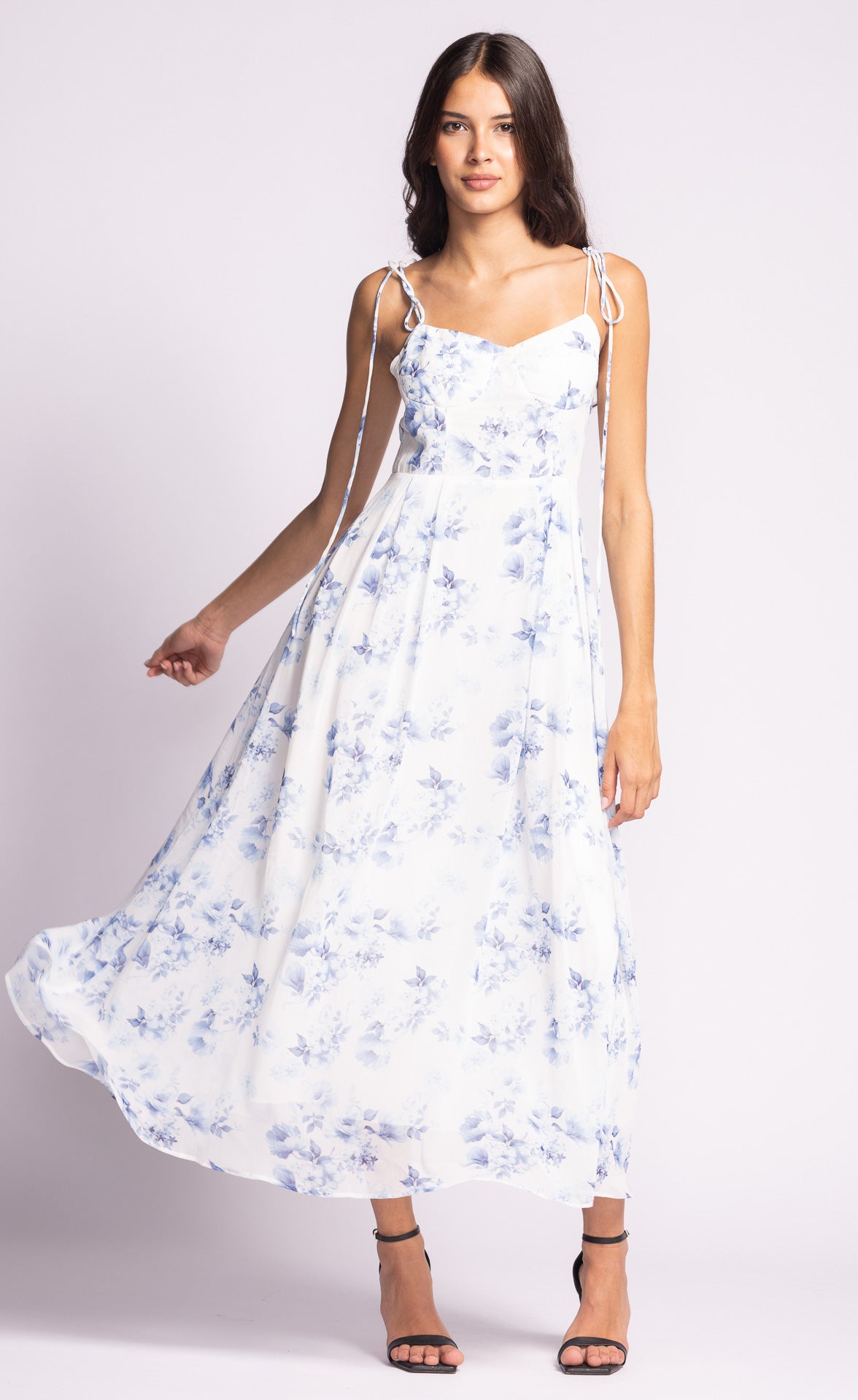The Layla Dress is a lined midi dress featuring a delicate floral print and self-tie straps. Lightweight and flowy, it drapes effortlessly to create a soft, romantic silhouette. Perfect for any occasion that calls for feminine charm.