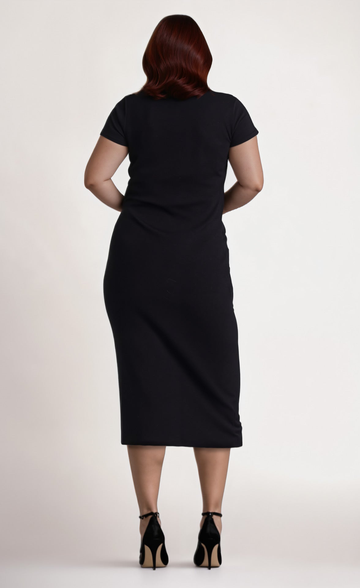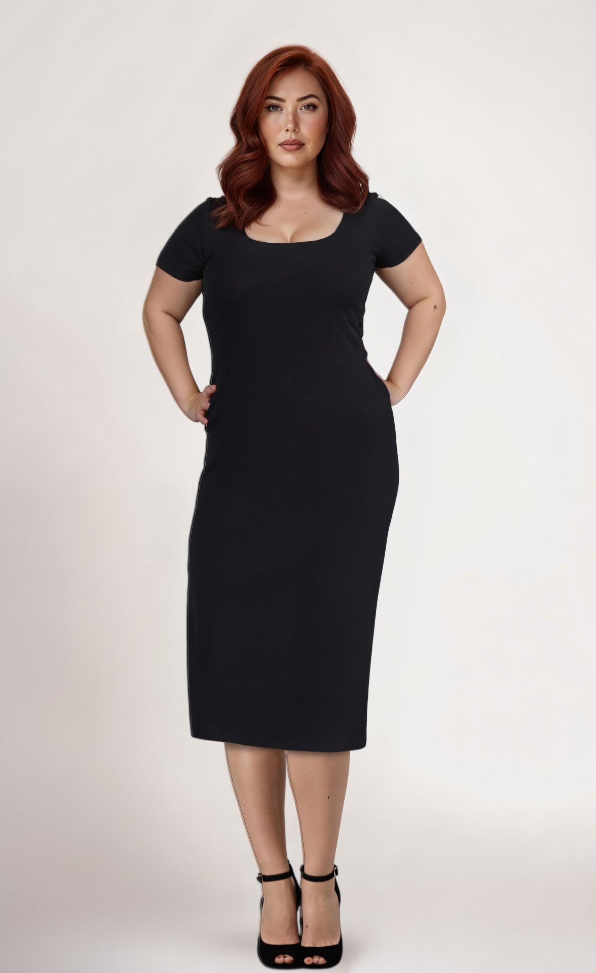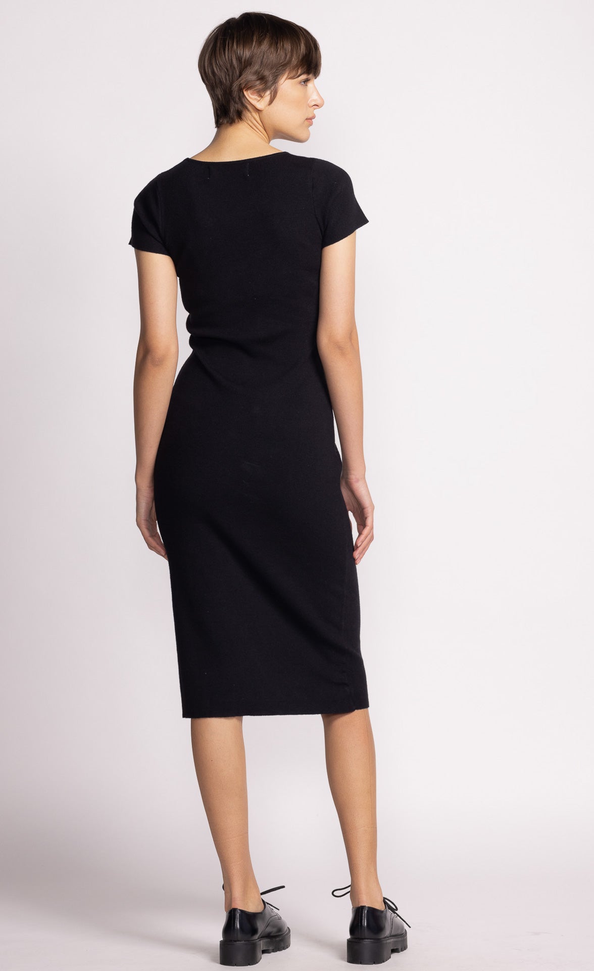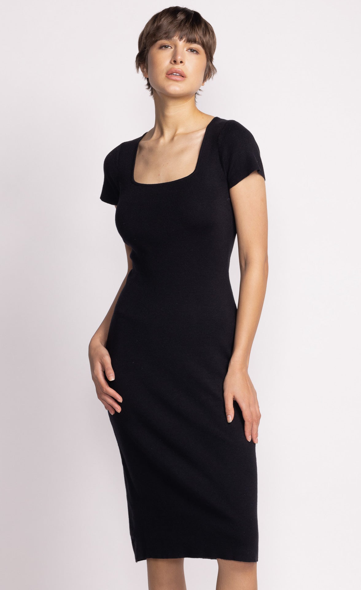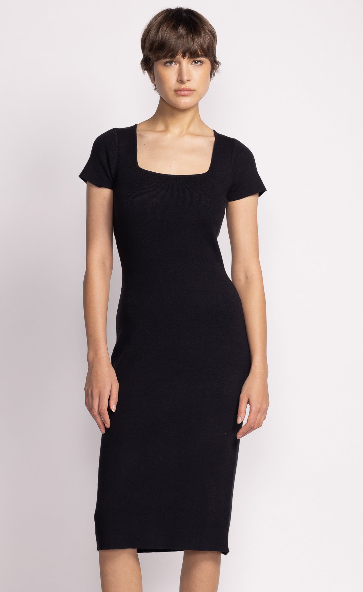 The Paige Sweater Dress features a chic, minimal design with a scoop neckline and a stretch-to-fit silhouette, offering effortless style and comfort.