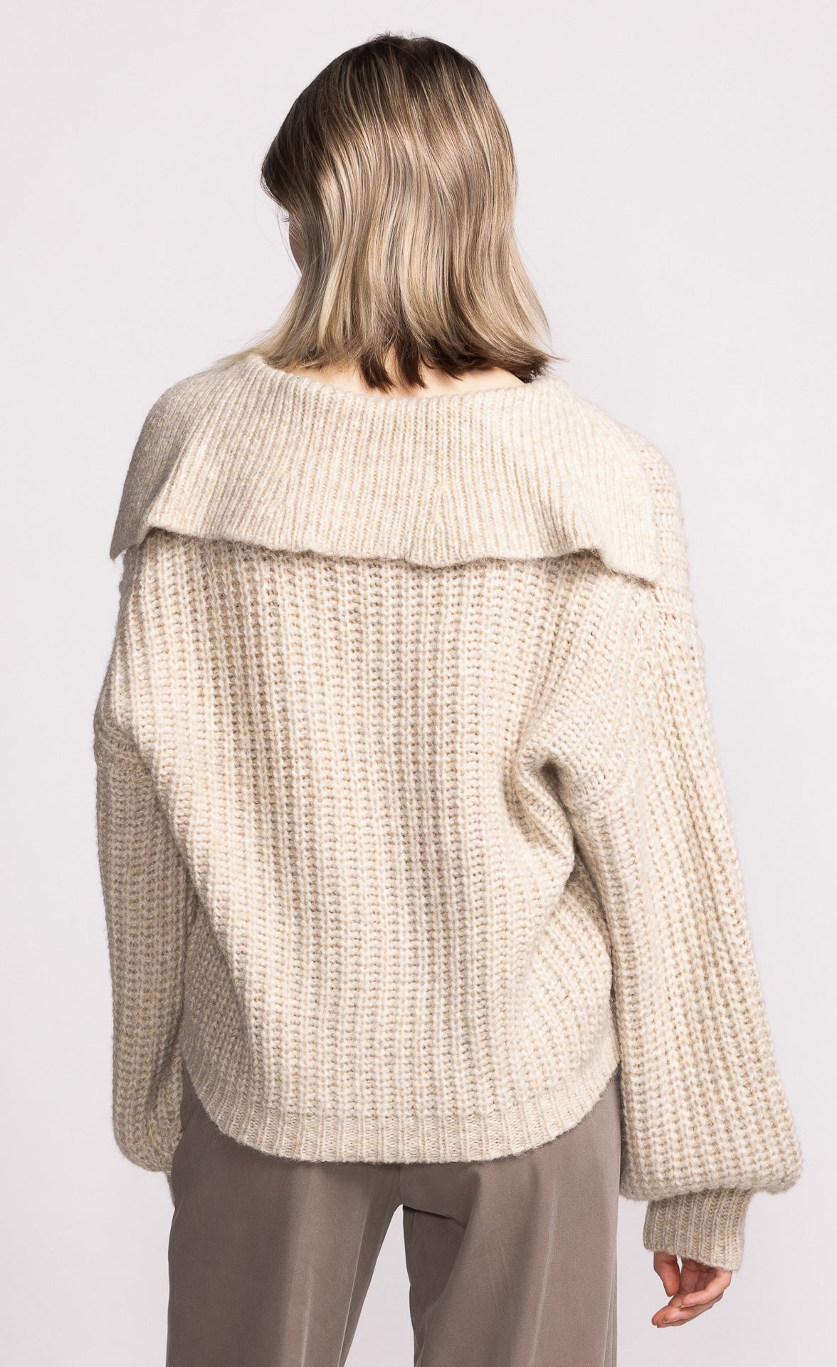 Stay cozy and chic with the Sloane Sweater's relaxed fit, spread collar, and ribbed details at the hem and cuffs. Perfect with your favorite jeans or layered over a slip dress for an effortlessly polished look.