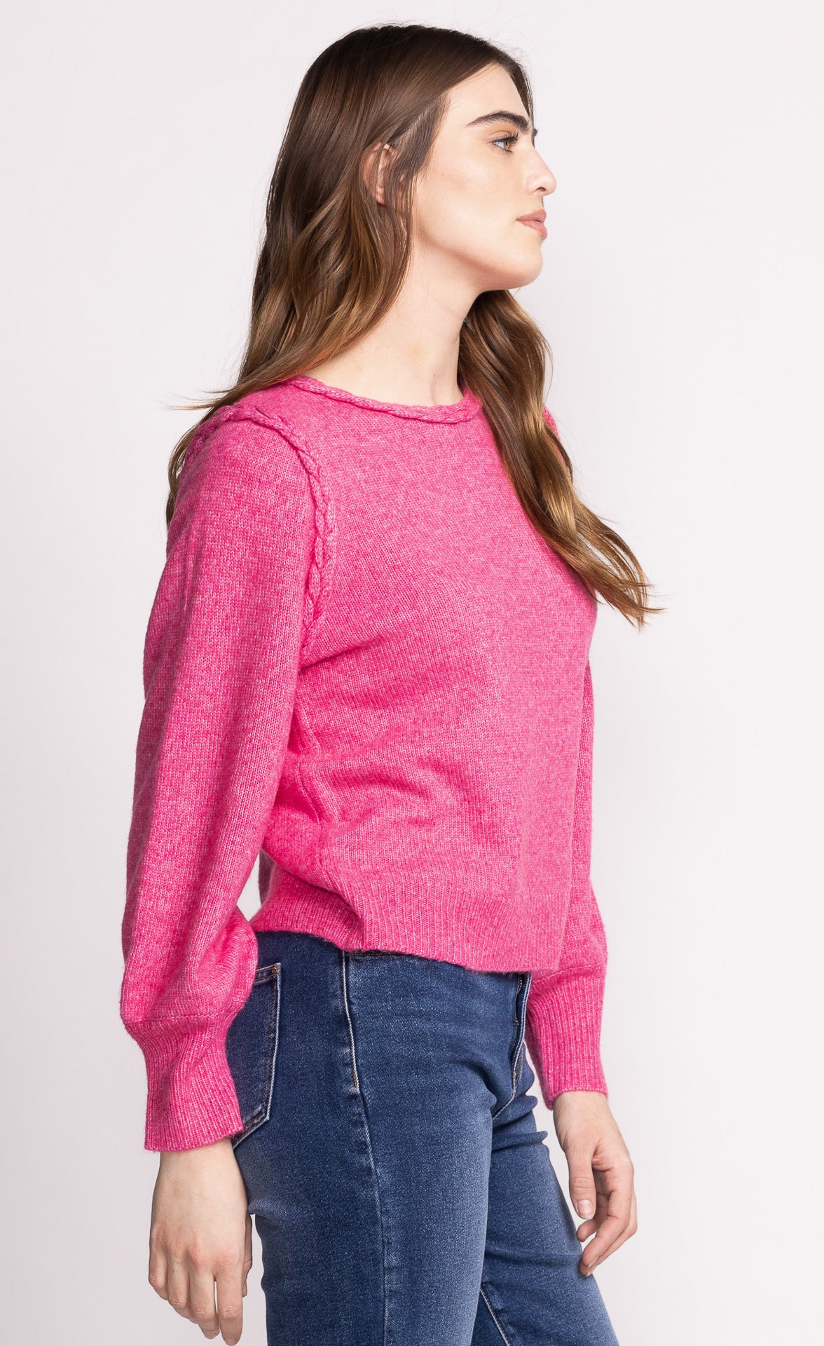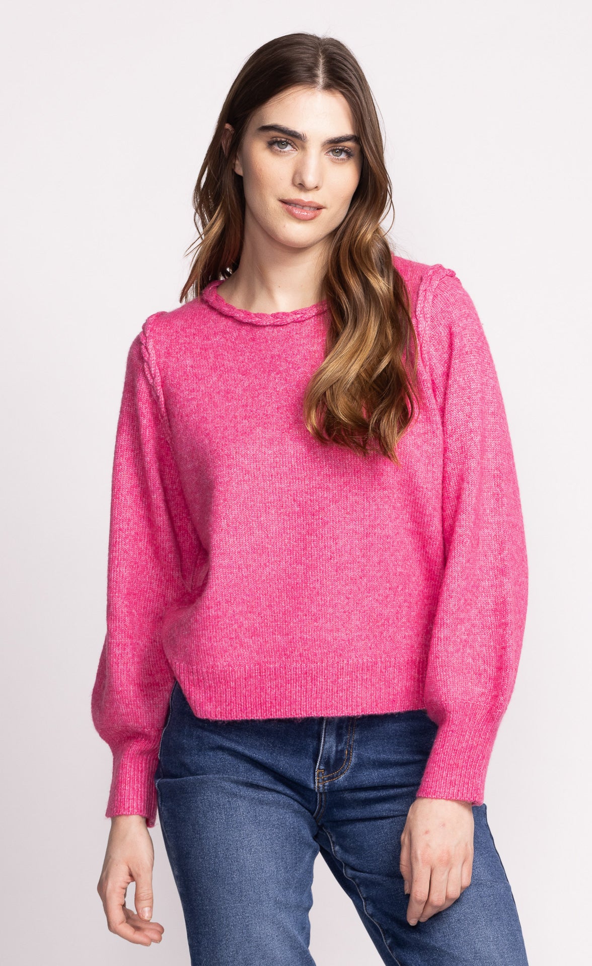 The Audrey Sweater brings a touch of charm with its braided trim details and relaxed fit. Finished with ribbed hem and cuffs, it's effortlessly stylish. Pair with jeans or a skirt for a cozy, chic look.