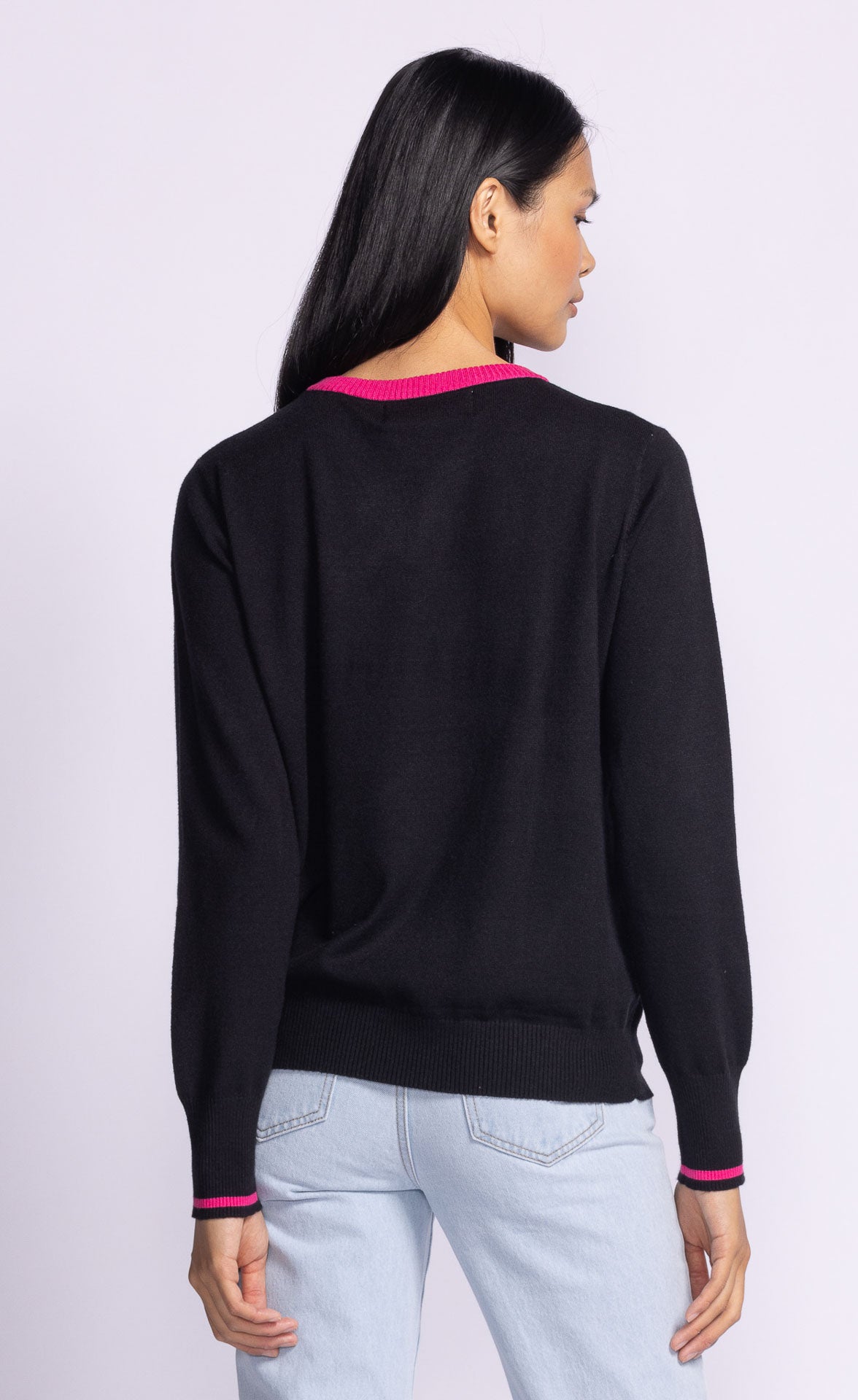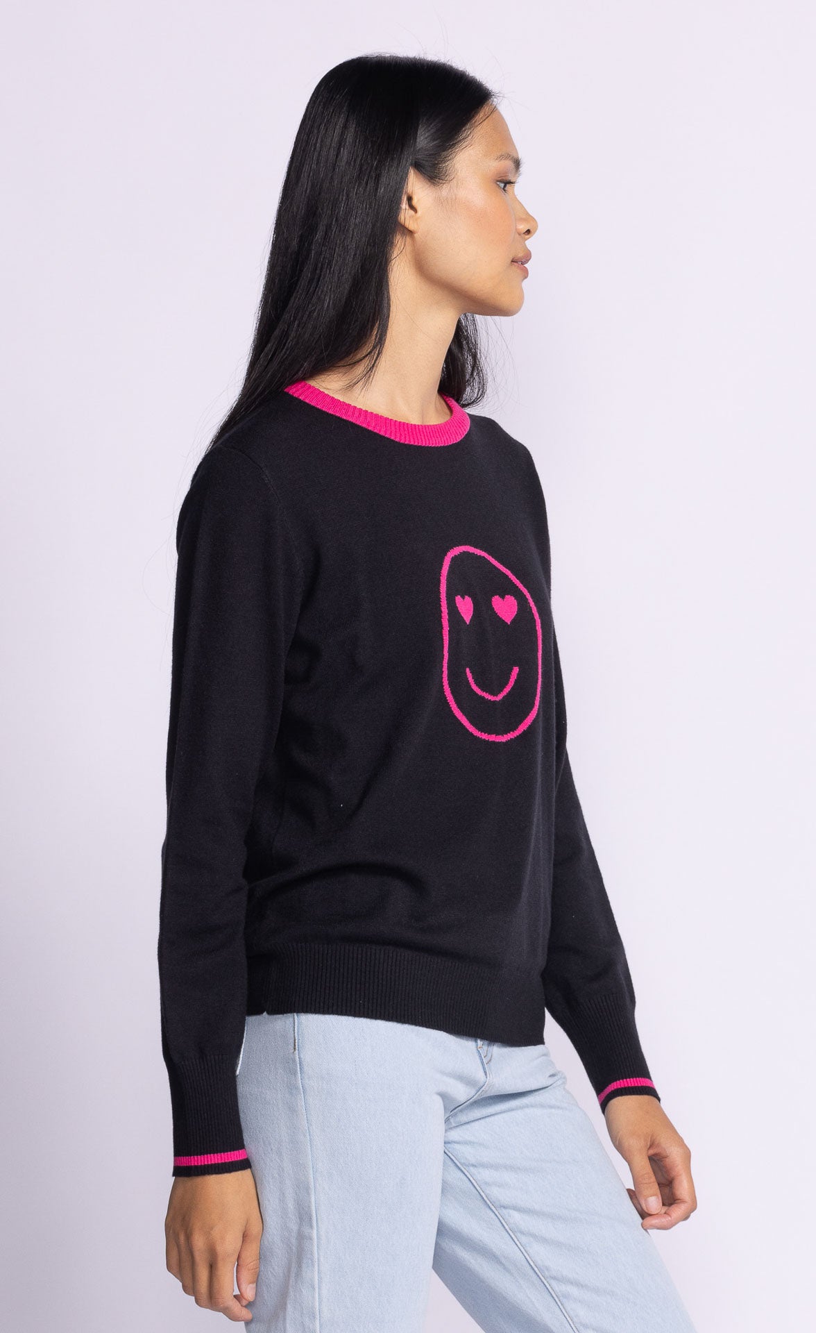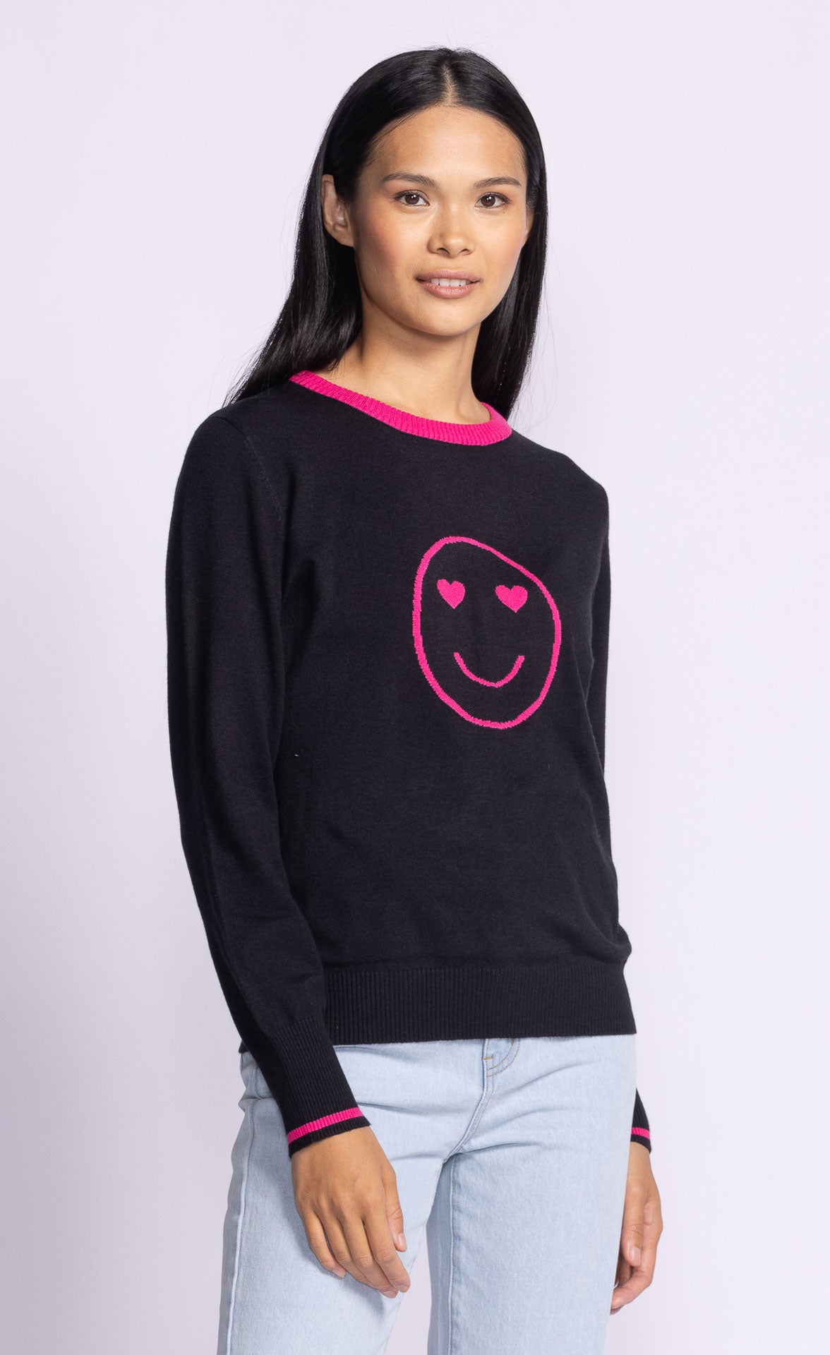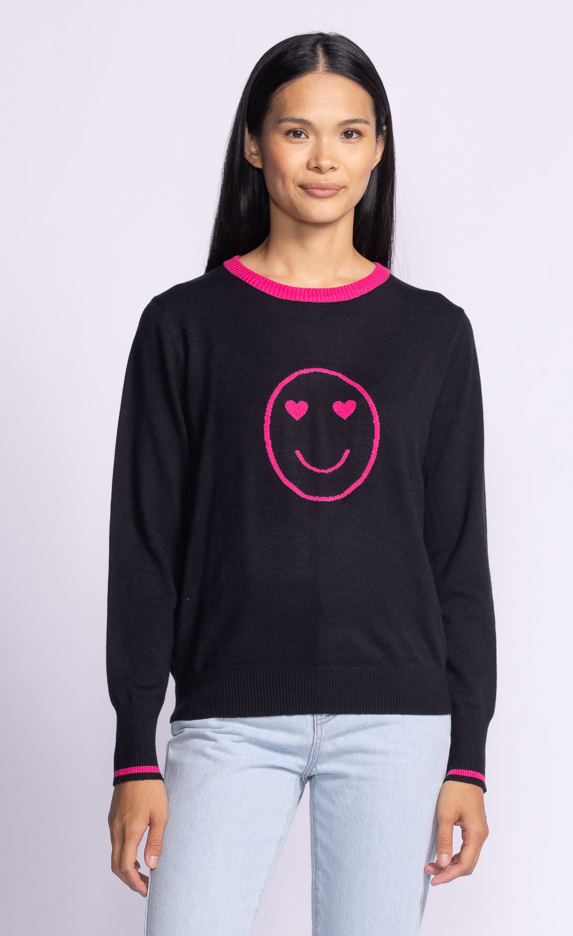 The Emoji Sweater features a contrast ribbed neck and cuffs, and a playful smiley print on the front. Cute yet chic—perfect for adding a fun touch to your casual style!