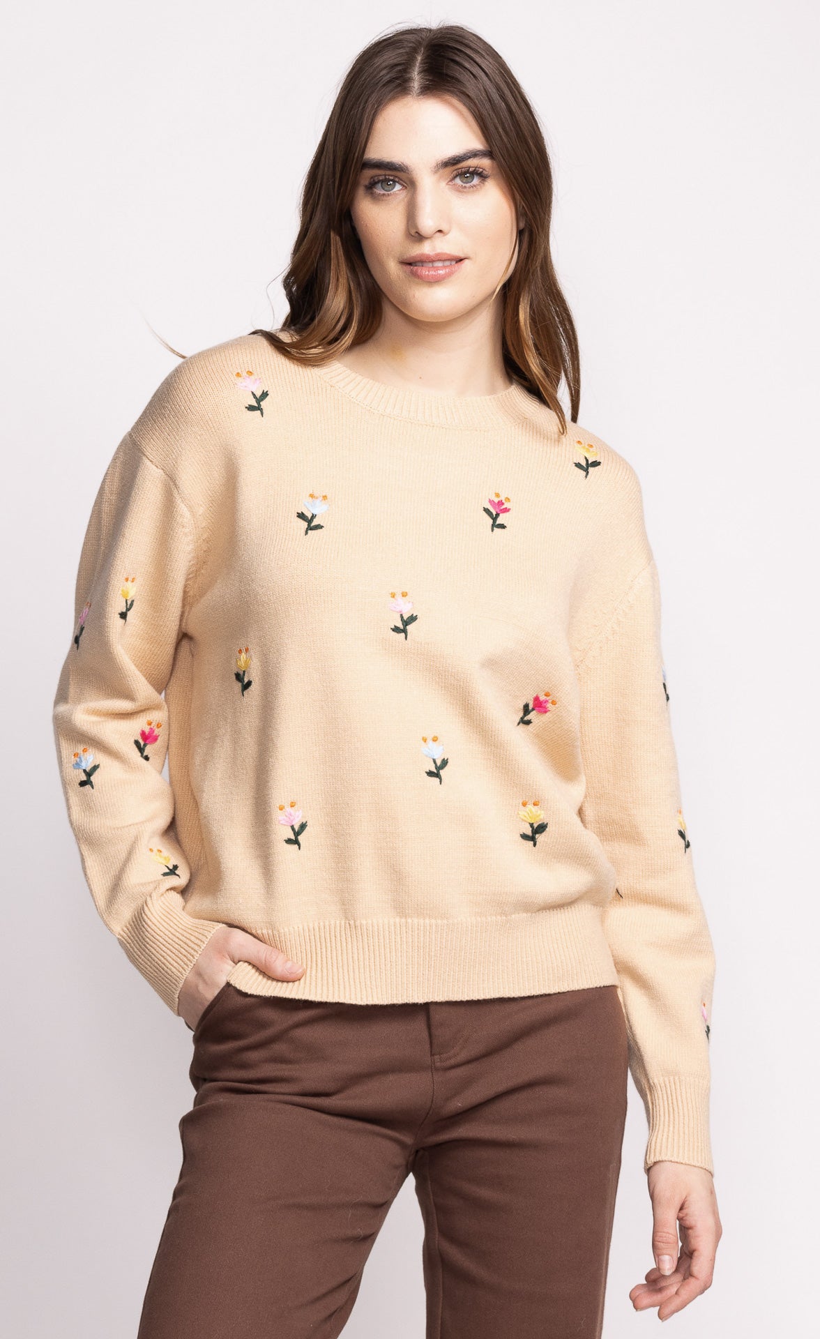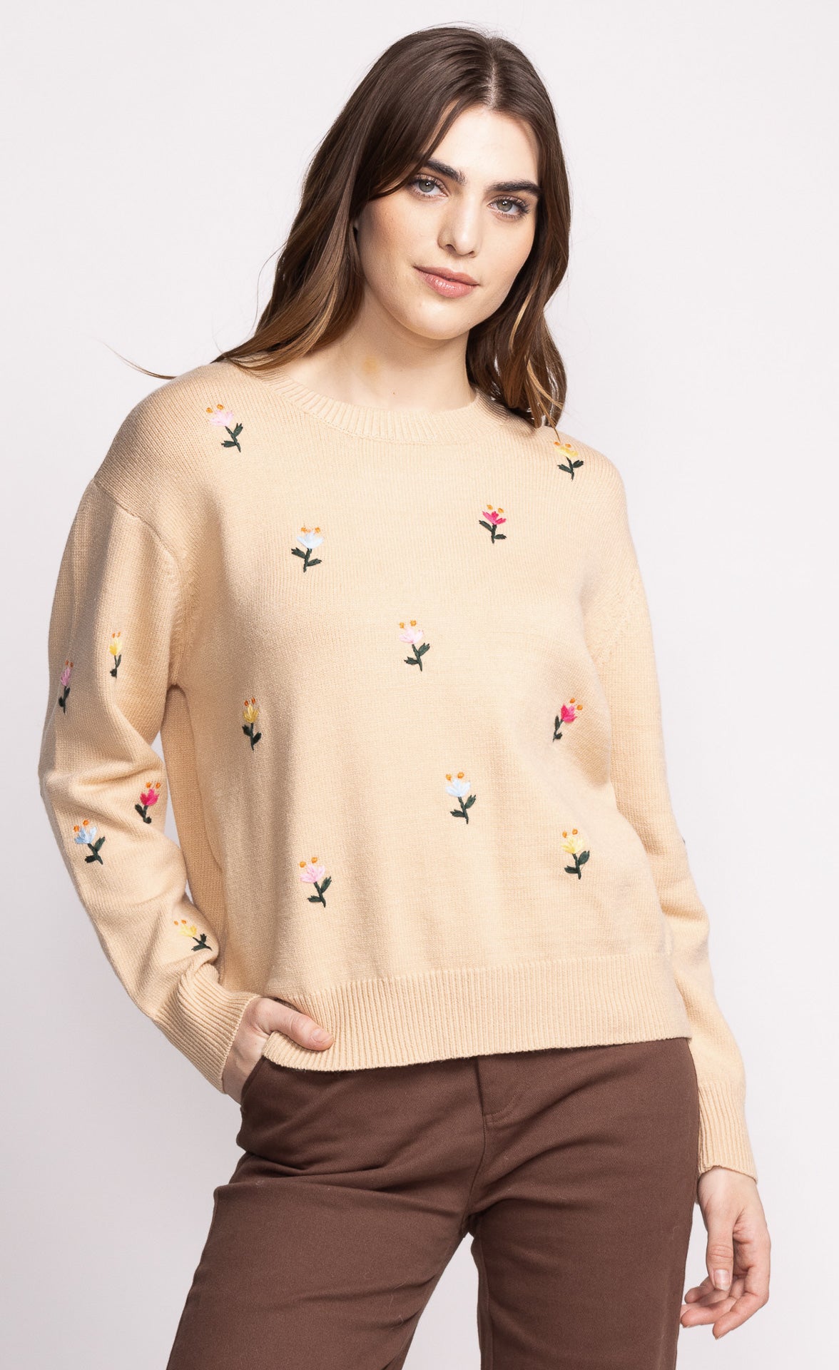 The Eva Sweater is super chic with delicate flower embroidery, perfect for adding a subtle touch of elegance. Pair it with high-waisted jeans or a sleek skirt for a minimalist yet stylish look.