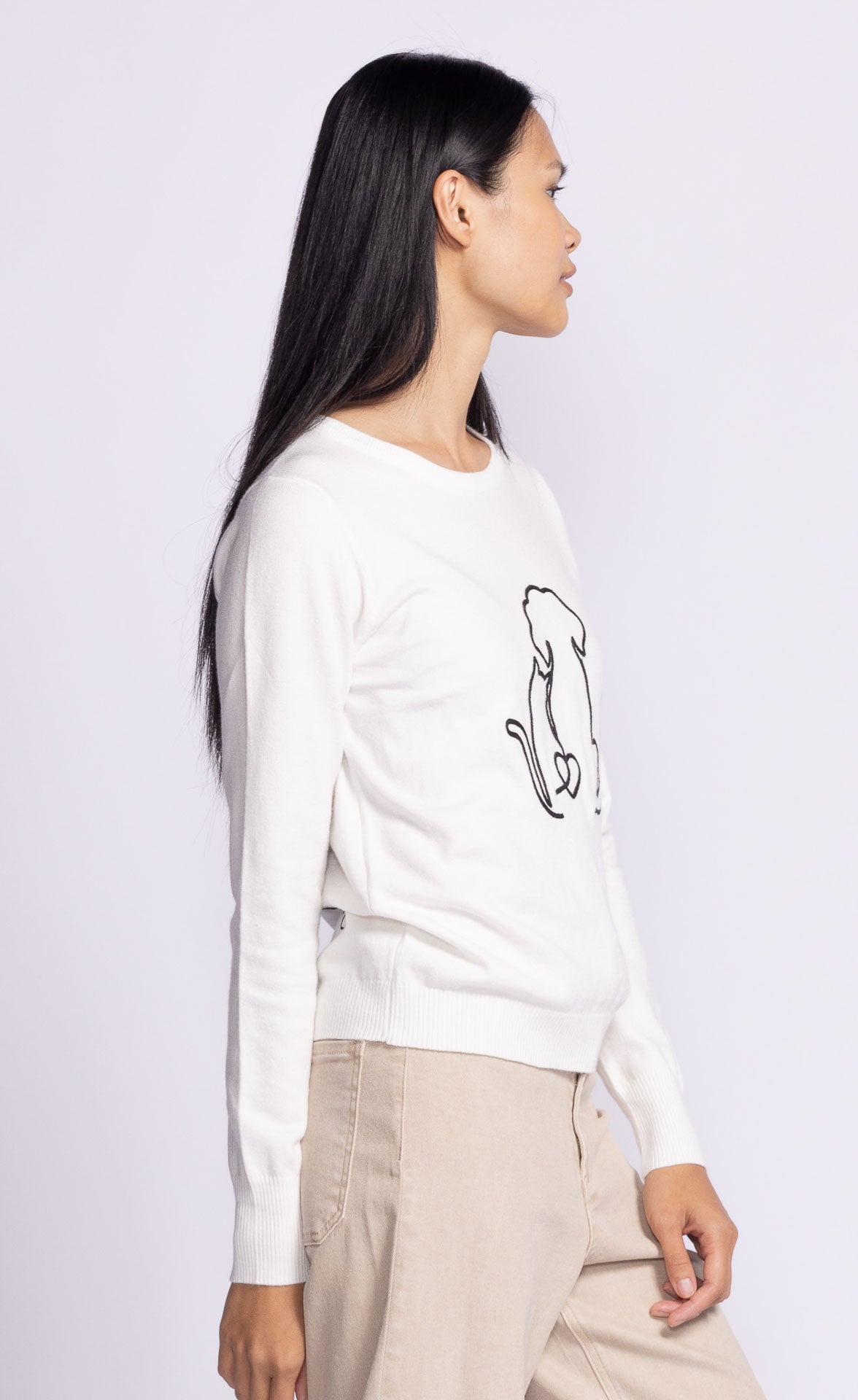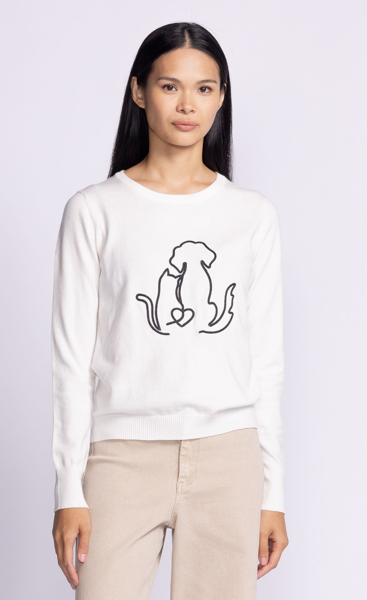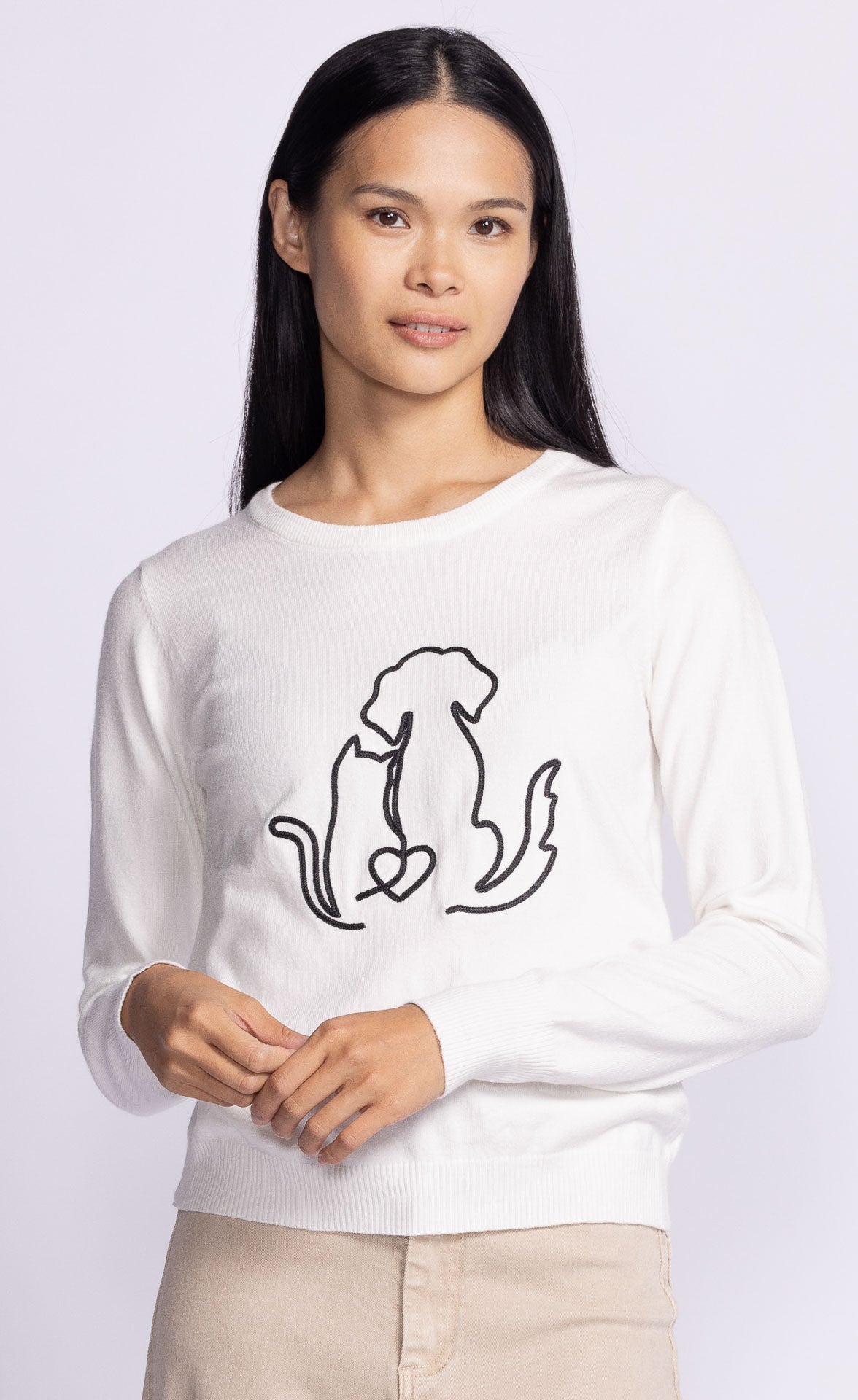 The Friends Forever Sweater features adorable puppy and kitten embroidery on the front, with cute paw print on the back, all in soft knit fabric. Pair it with jeans or leggings for a cozy, playful look!