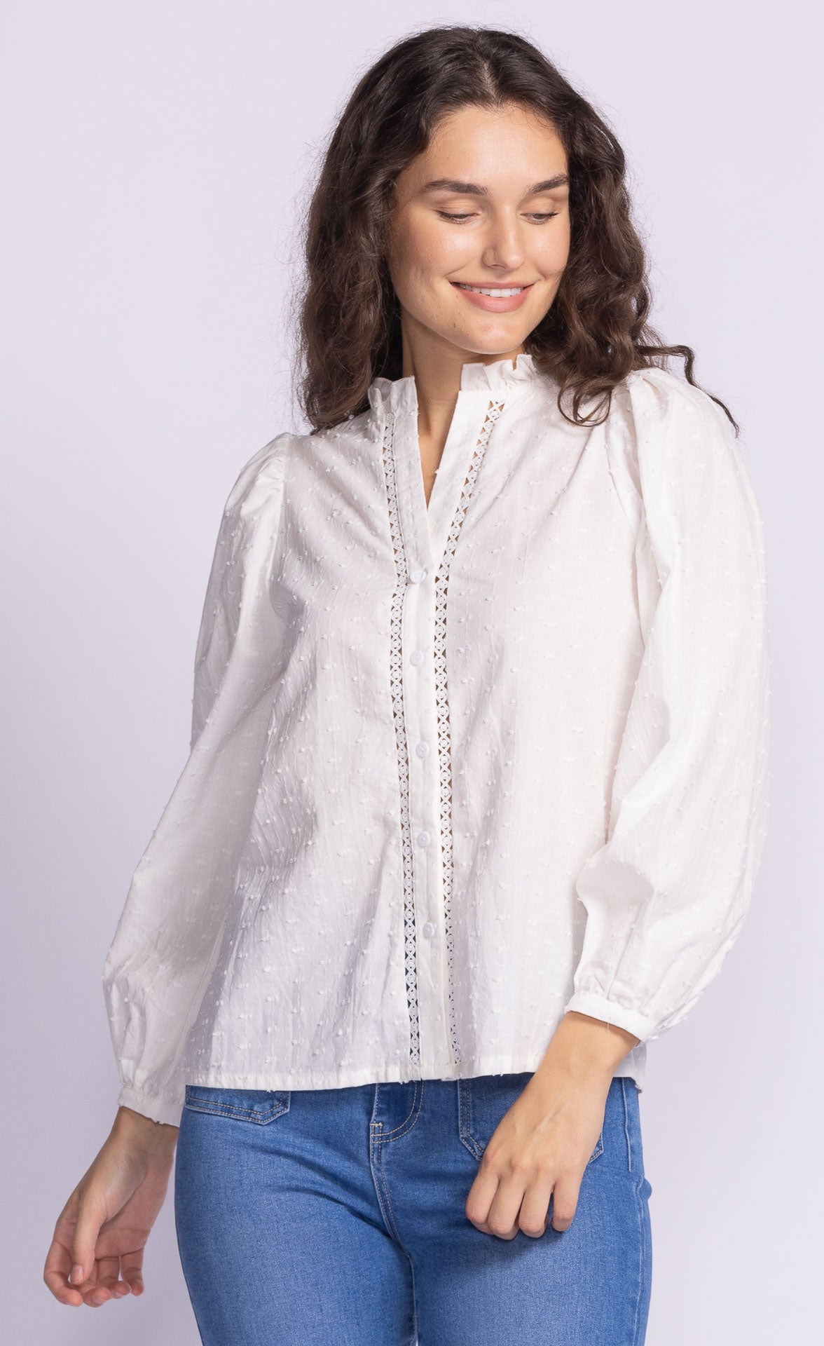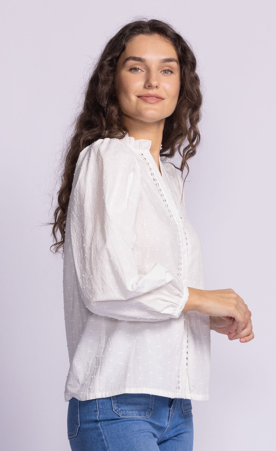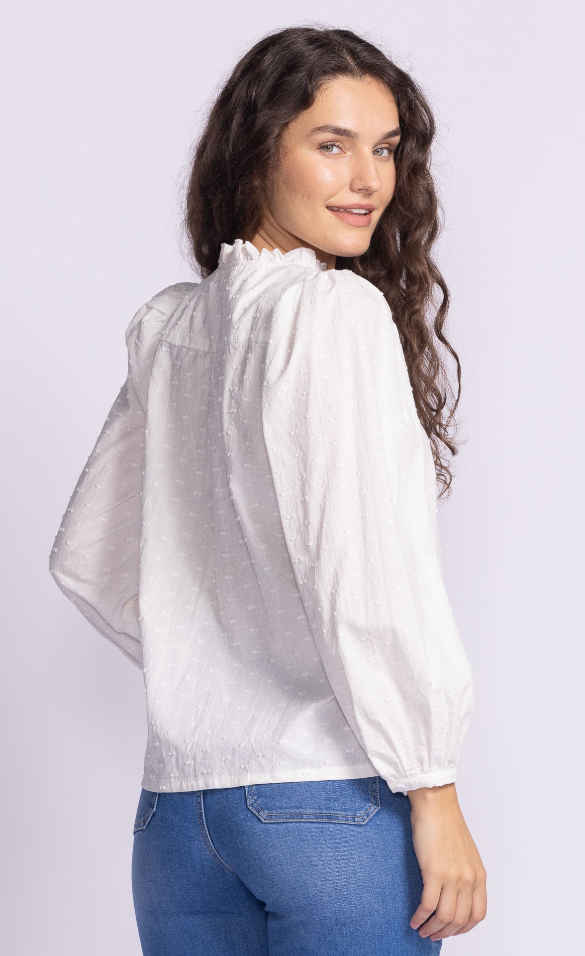 Gale Top is a chic button-down with cinched sleeves, ruffled neck detail, and textured fabric that adds a sophisticated touch. Pair with white bottoms for an effortlessly stylish and fresh look.