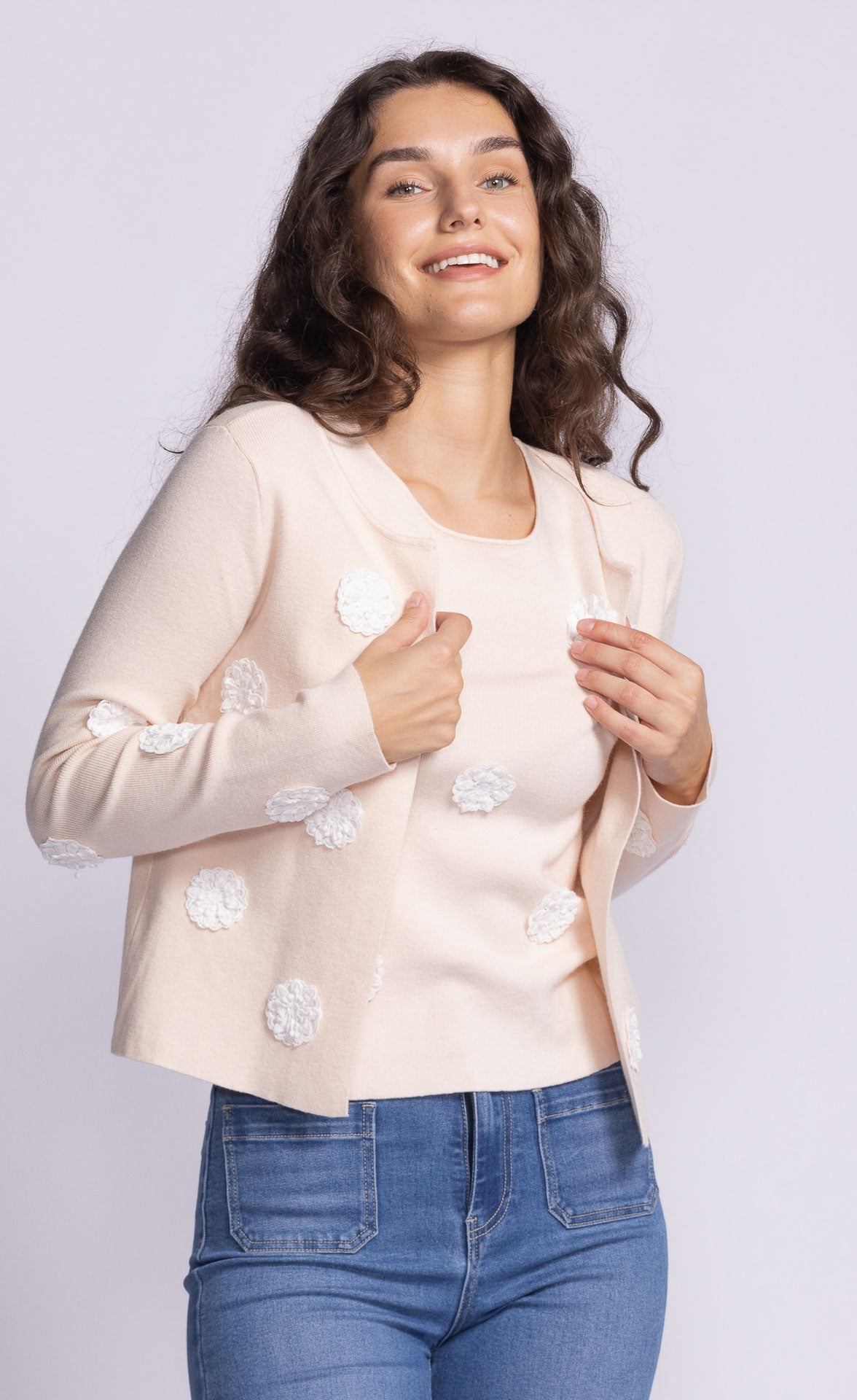 The Kelsey Sweater features dainty flower patch details, adding a touch of charm to your look. Layer it over a white shirt for a stylish, effortlessly chic outfit!