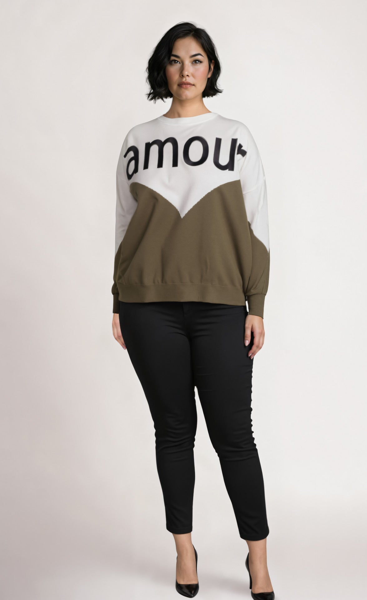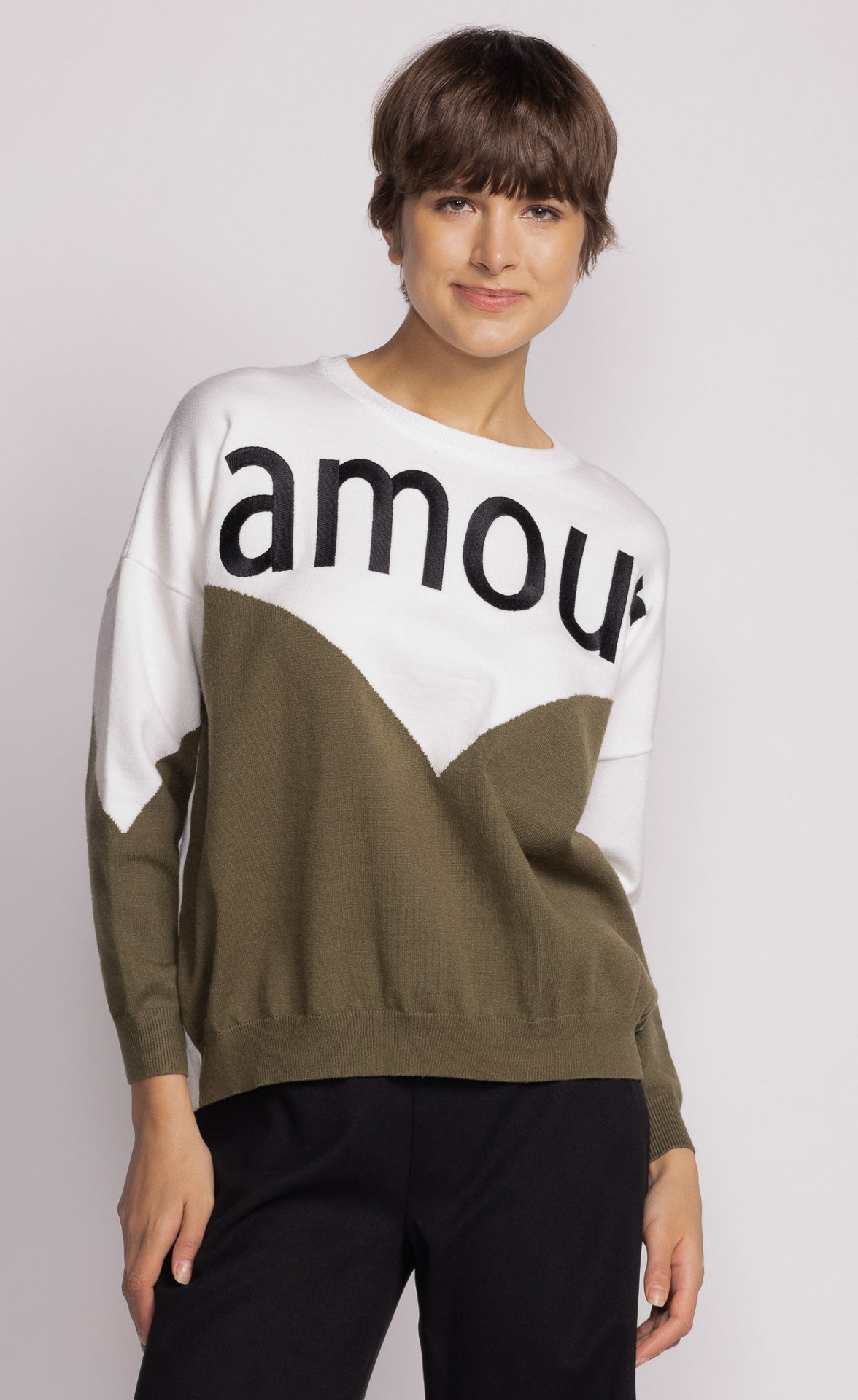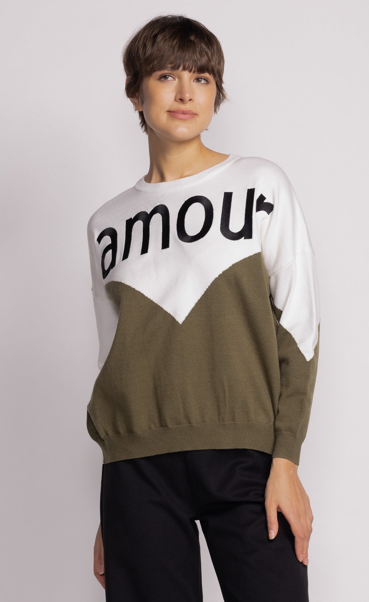 The Robyn Sweater features a cozy, timeless design with an AMOUR print and color block details. It’s the perfect blend of style and comfort for any season.