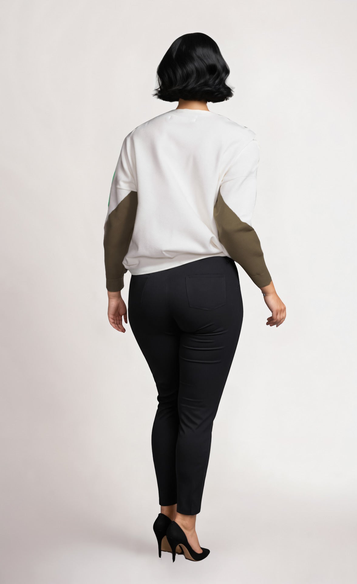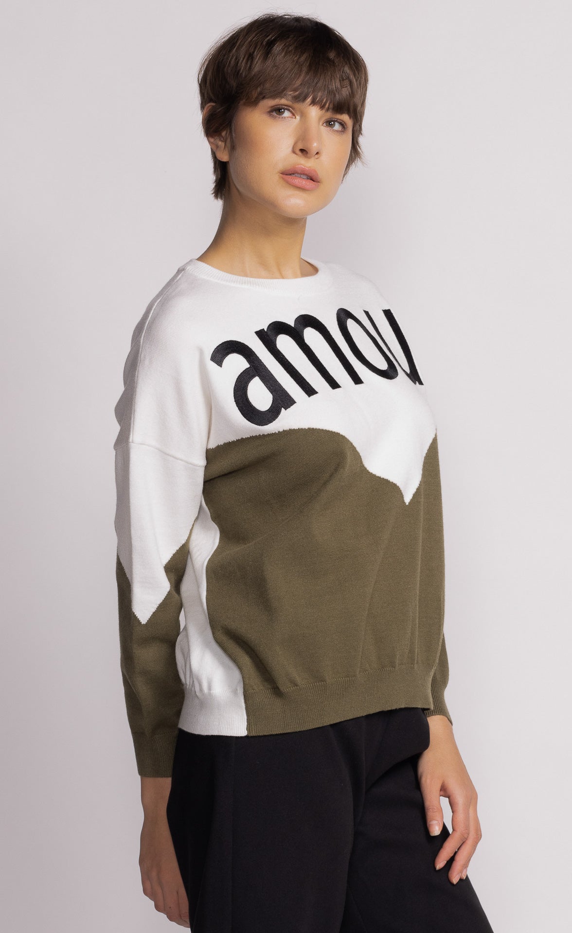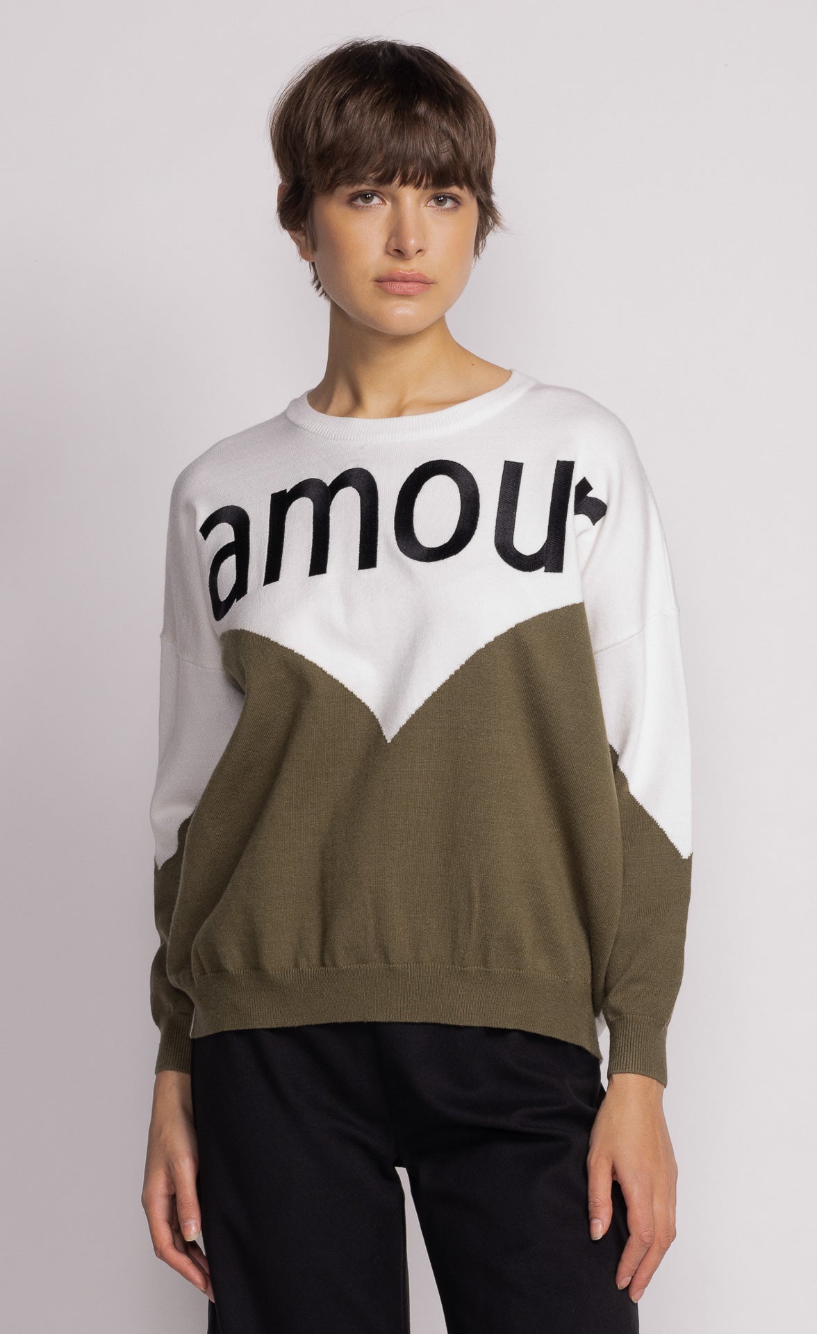 The Robyn Sweater features a cozy, timeless design with an AMOUR print and color block details. It’s the perfect blend of style and comfort for any season.