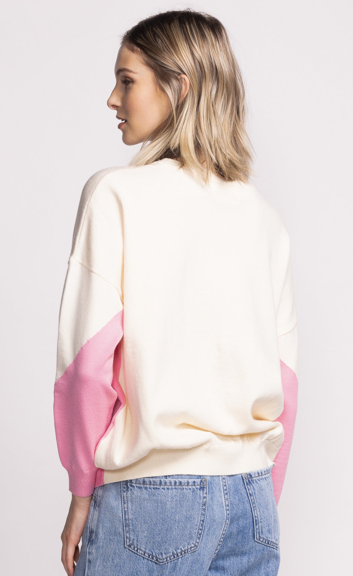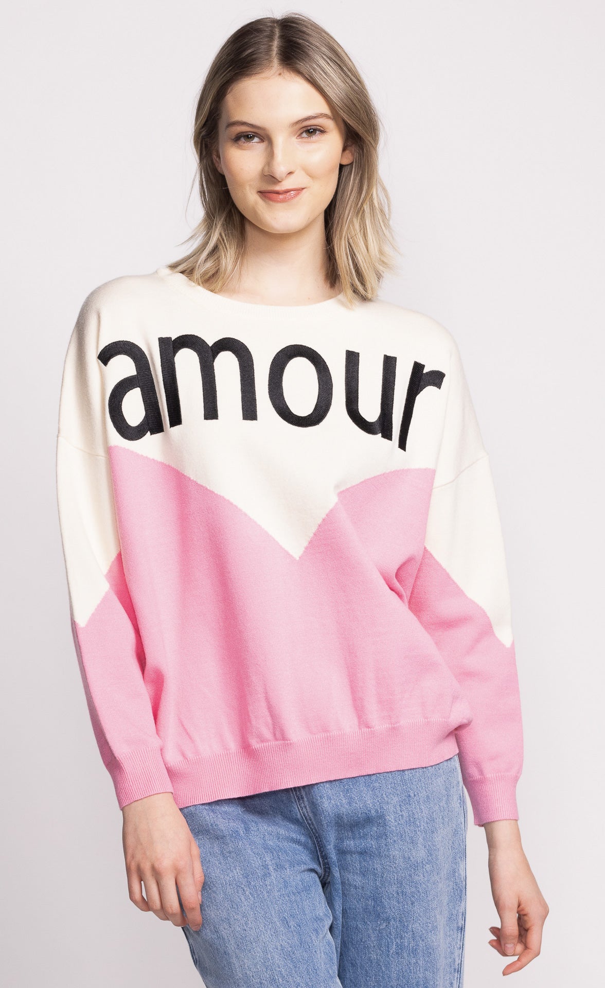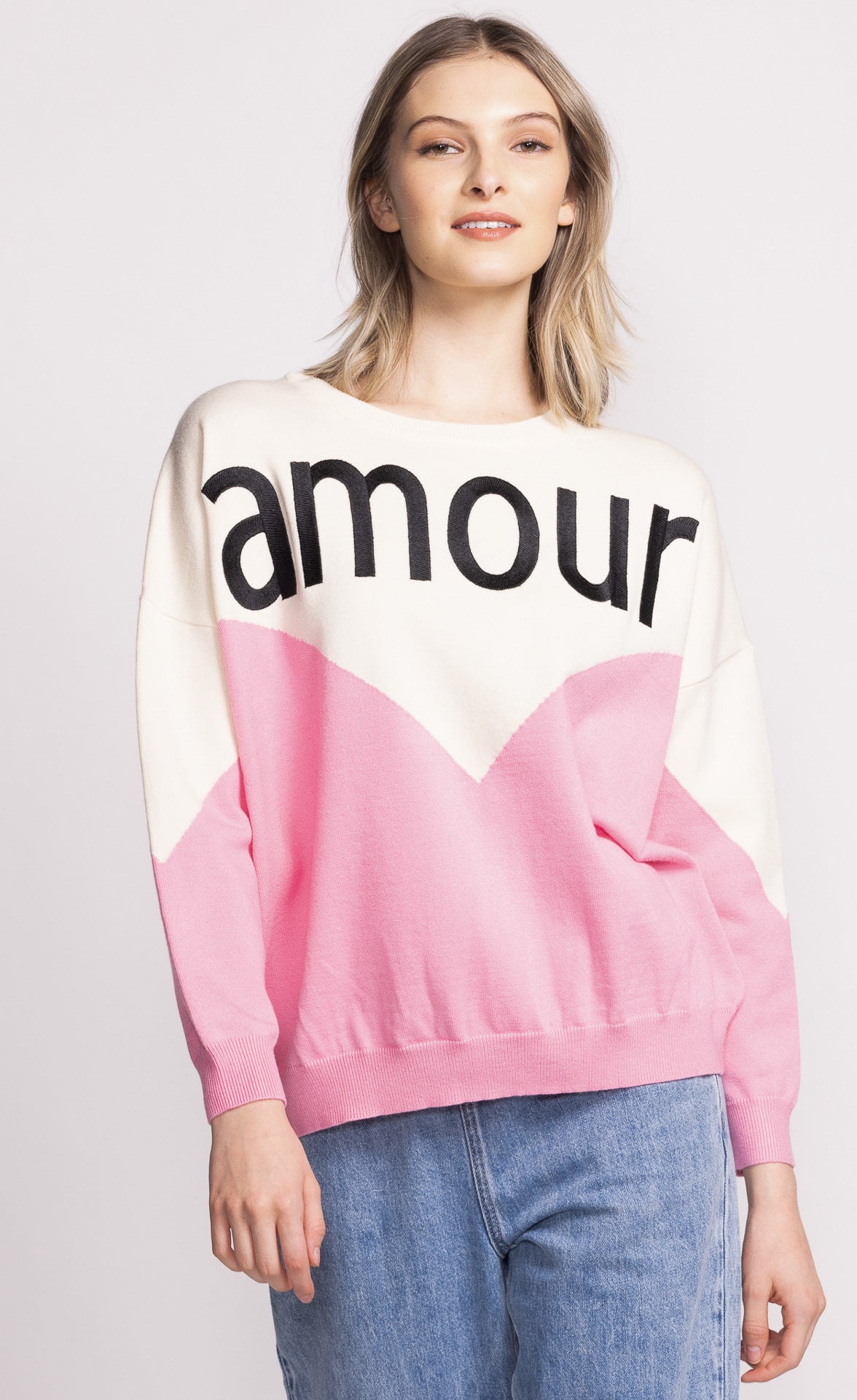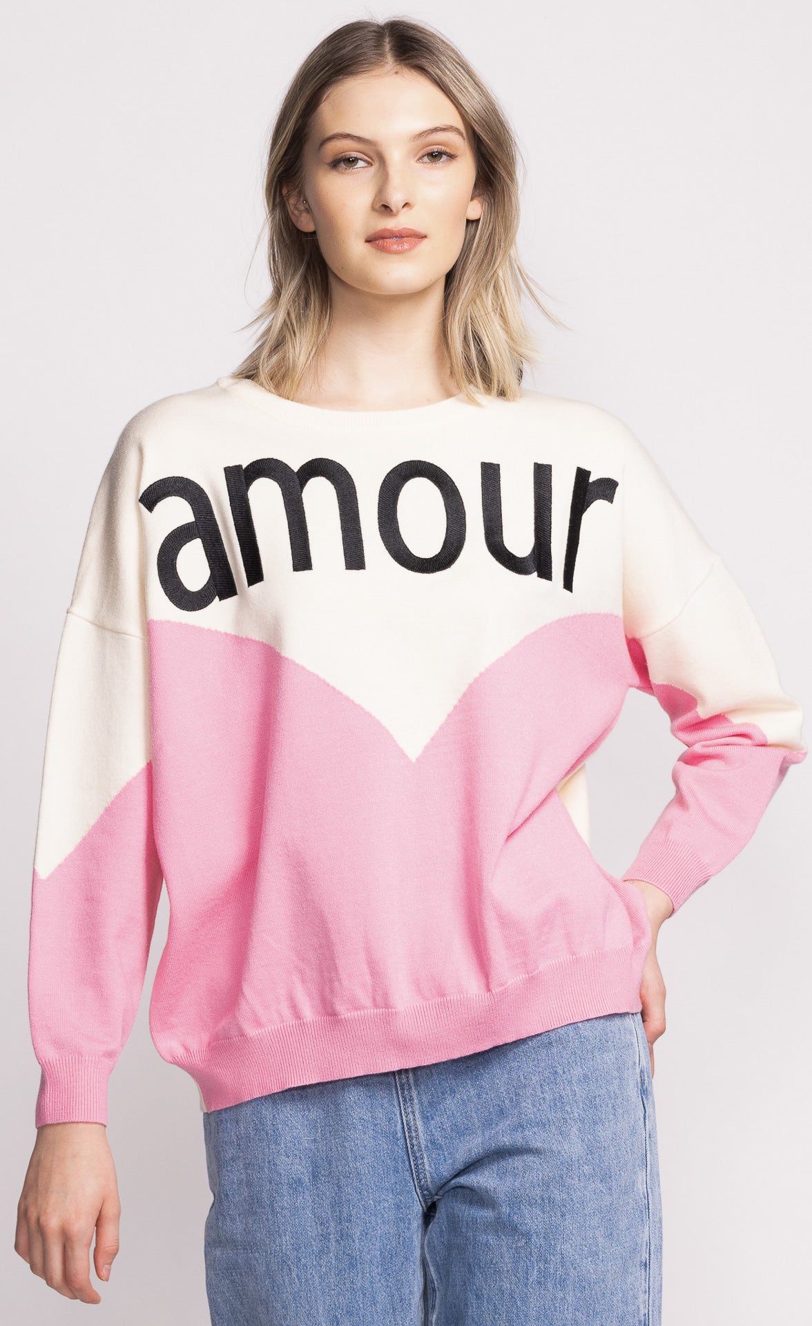 The Robyn Sweater features a cozy, timeless design with an AMOUR print and color block details. It’s the perfect blend of style and comfort for any season.