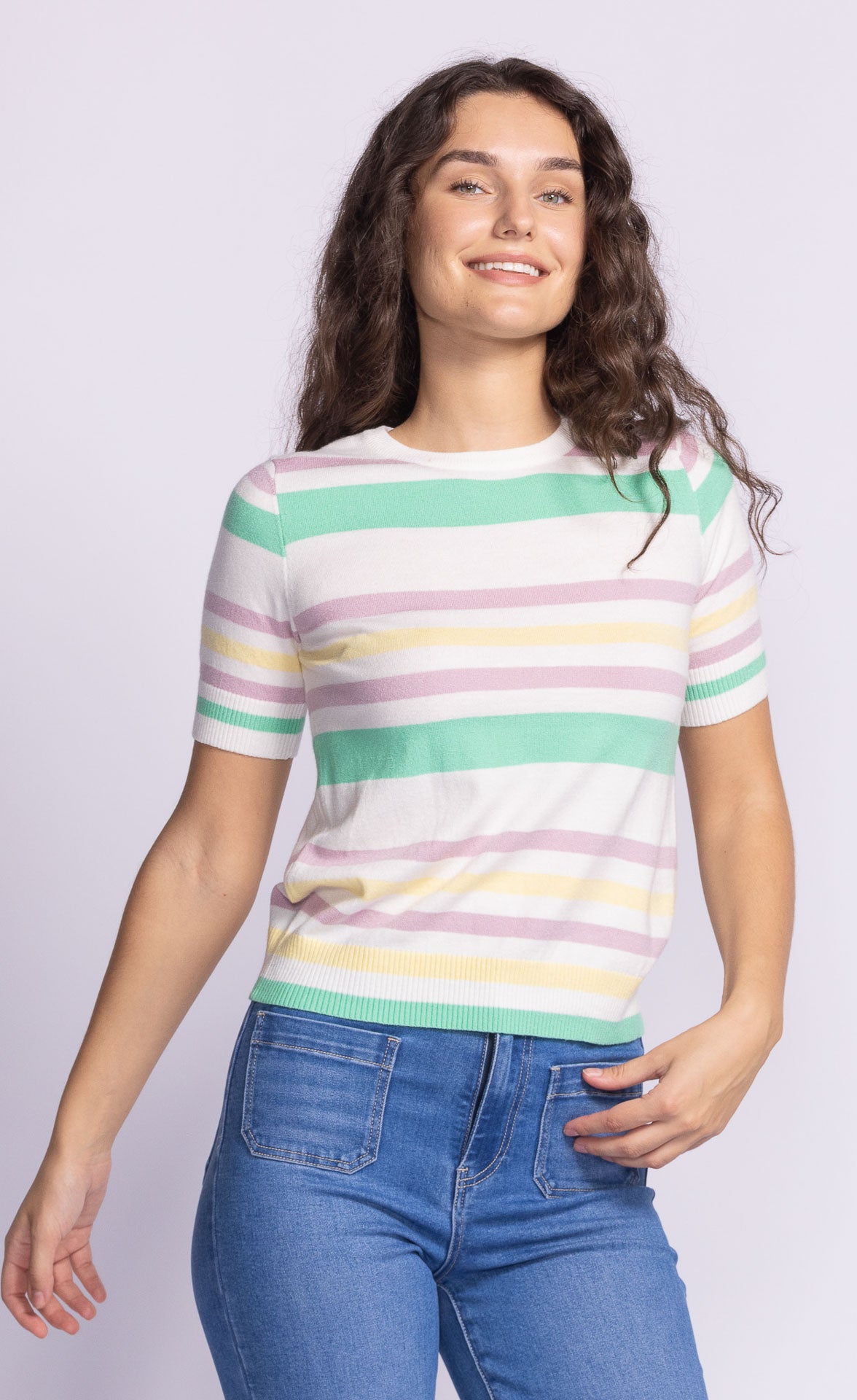 The Sandy Top is a soft knit basic with a round neck, short sleeves, and ribbed hem and cuffs. Simple yet super chic—perfect for effortless everyday style!