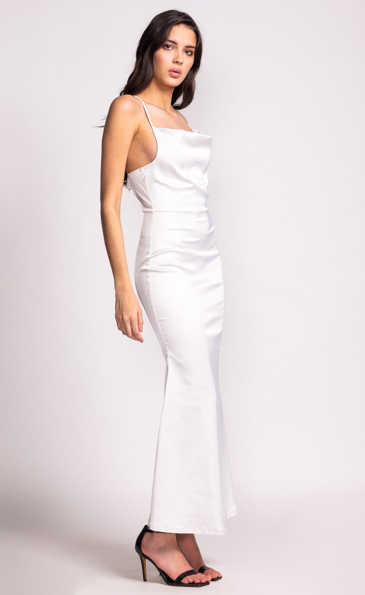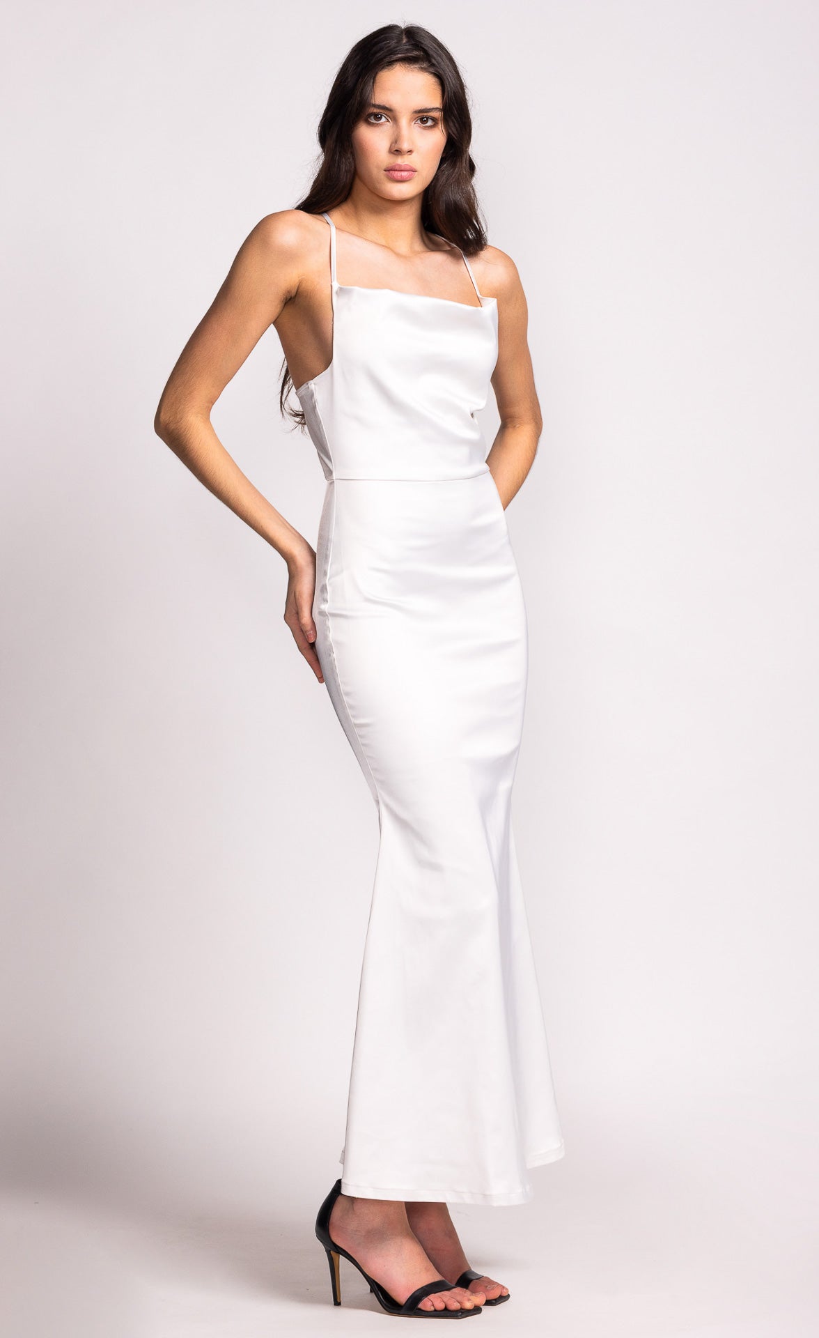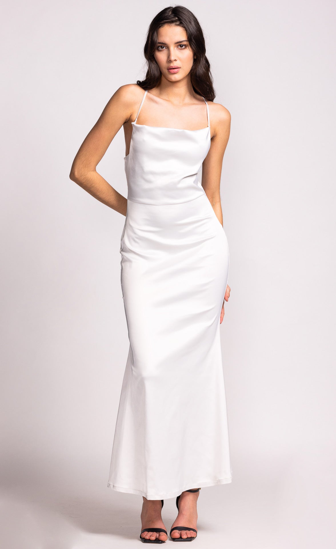 Elevate your evening look with this stunning long dress featuring a sophisticated cowl neckline and a dramatic cross-back detail with adjustable straps. Pair it with strappy heels and delicate jewelry for a glamorous ensemble.