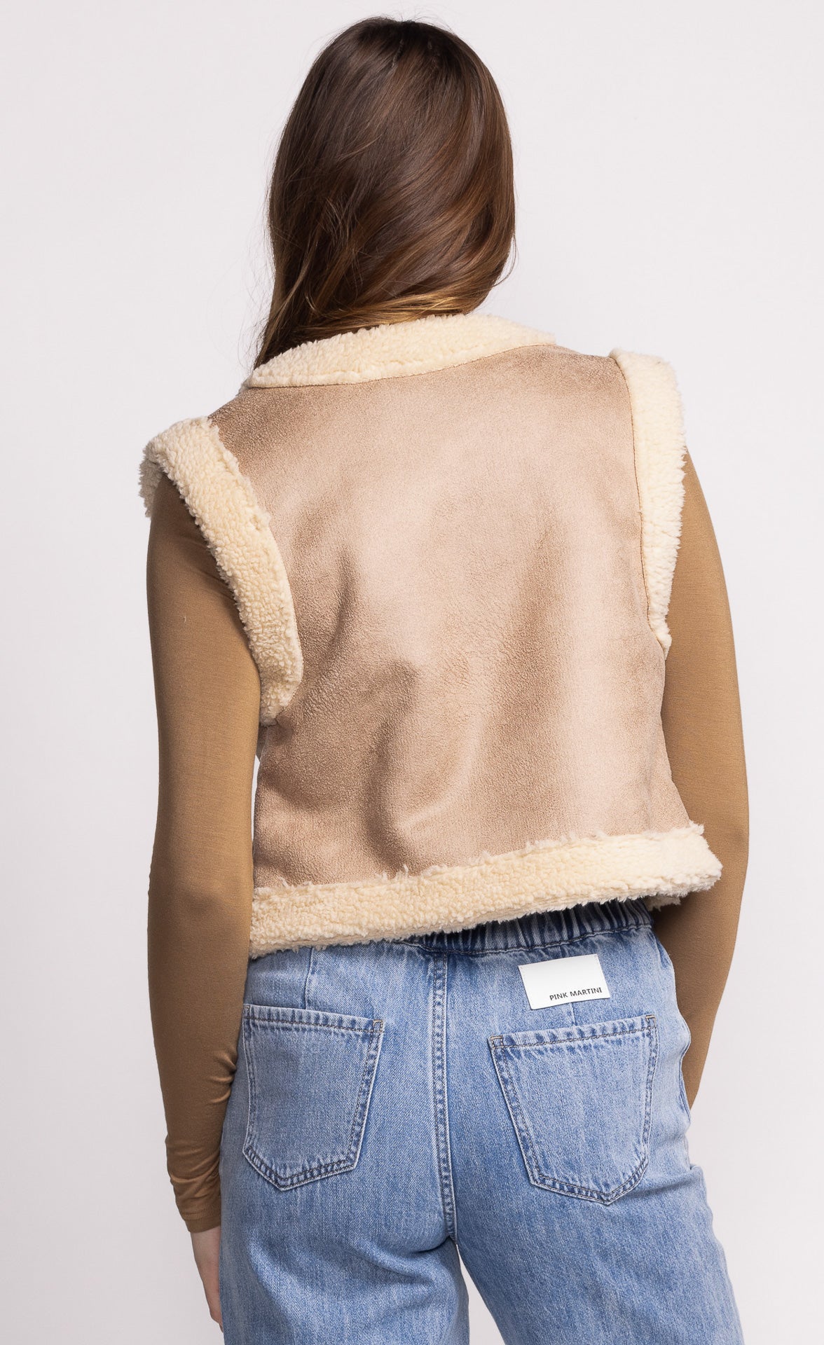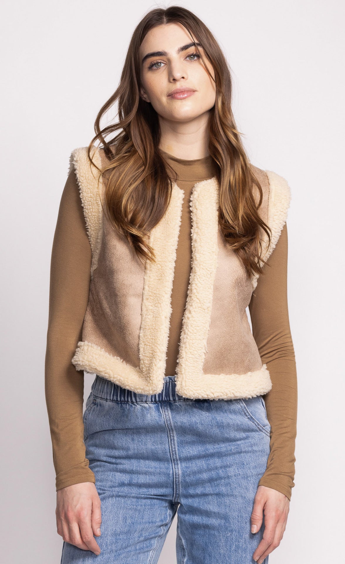 The Phoebe Vest features a unique mixed fabric design, making it the perfect cute layer for fall. Pair it with a long-sleeve tee and jeans for a cozy, stylish look!