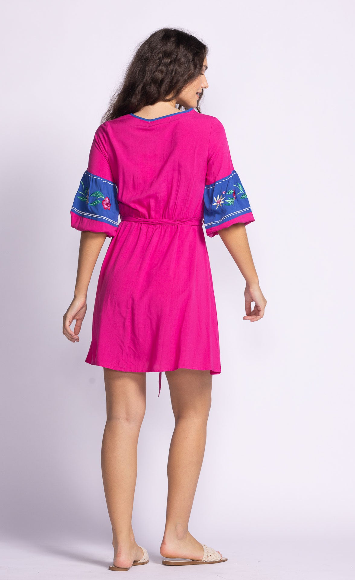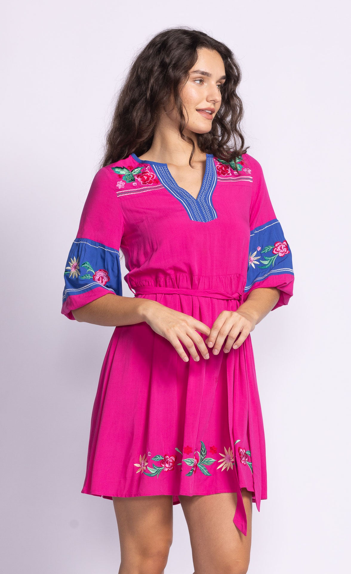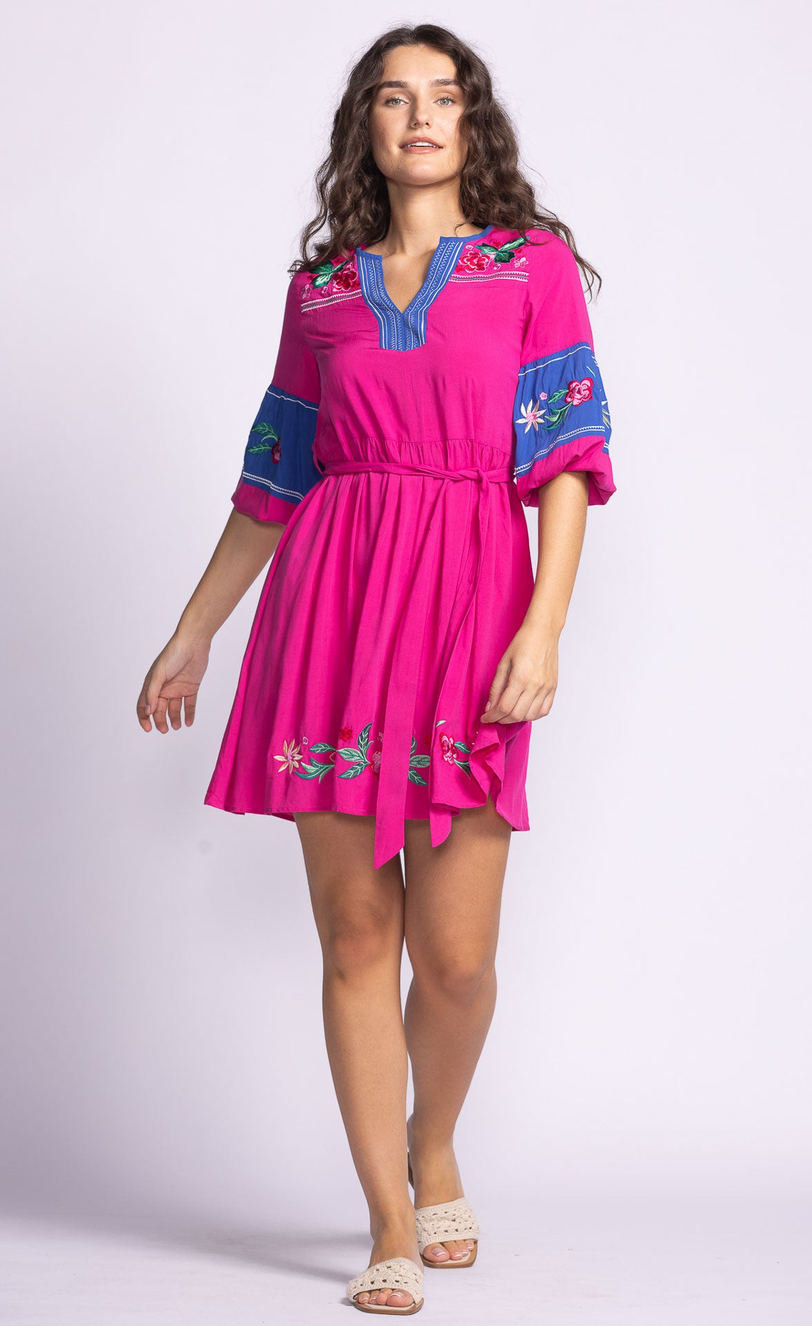 The Denise Dress features cinched cuffs for stretch, a self-tie belt detail, and stunning embroidery accents. Its flowy, relaxed fit makes it perfect for any occasion—pair with sandals for a laid-back look or dress it up with heels for a more elevated style.