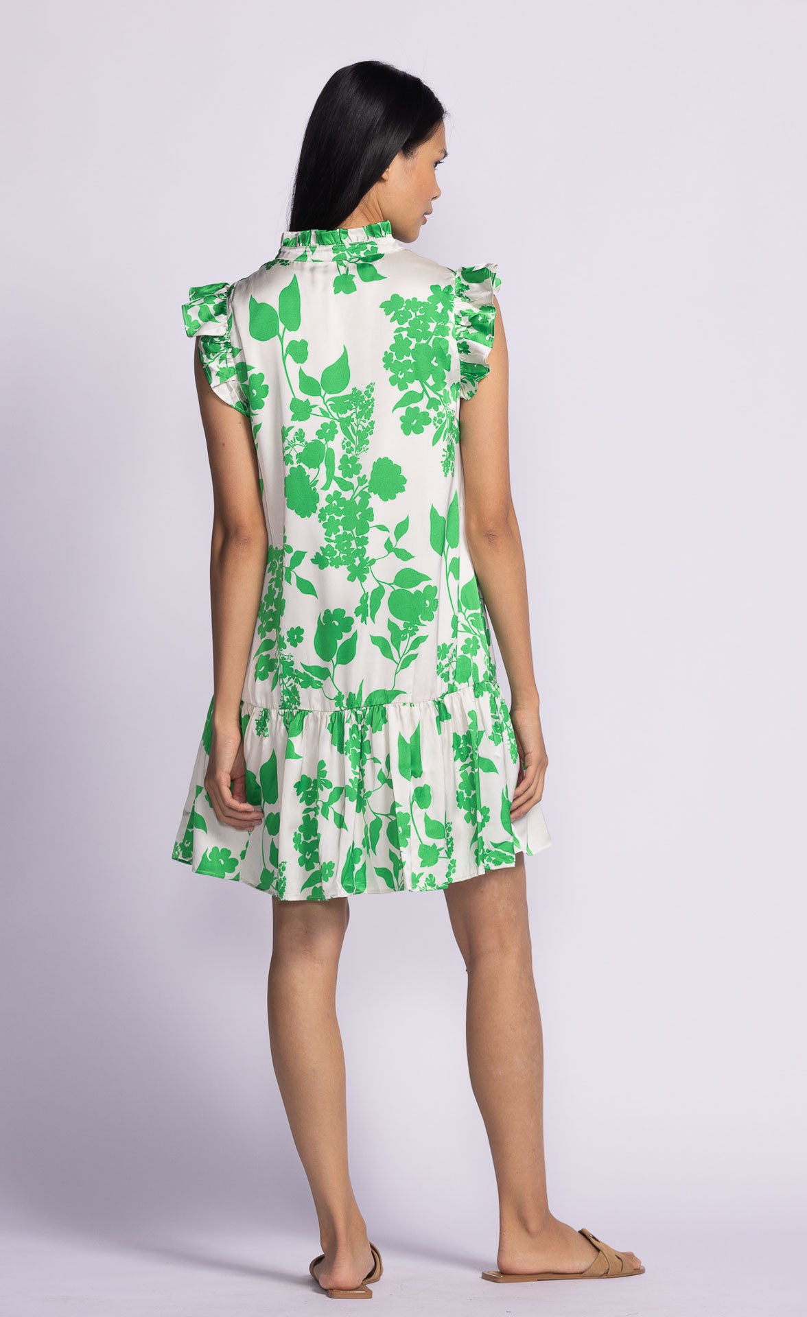 The Dina Dress features ruffled neck and sleeves, a drop waist, and a flowy, printed design with a relaxed fit. For a laid-back, stylish look, pair it with sneakers or sandals for easy, everyday wear.