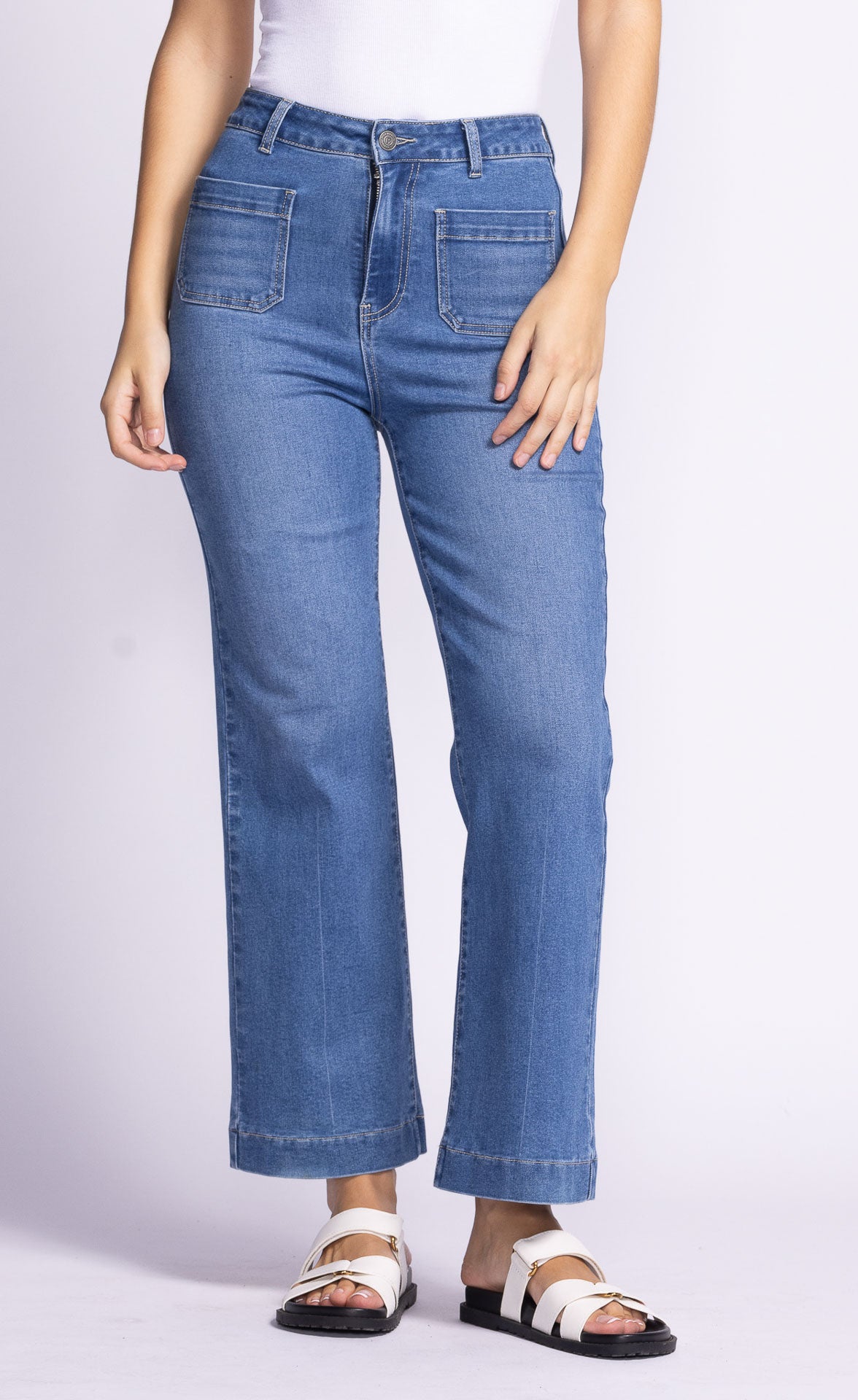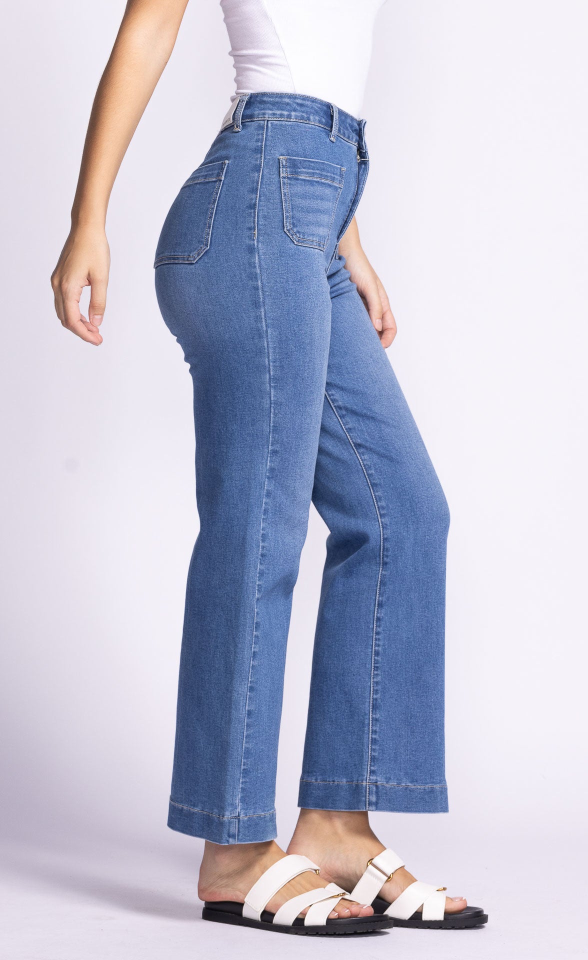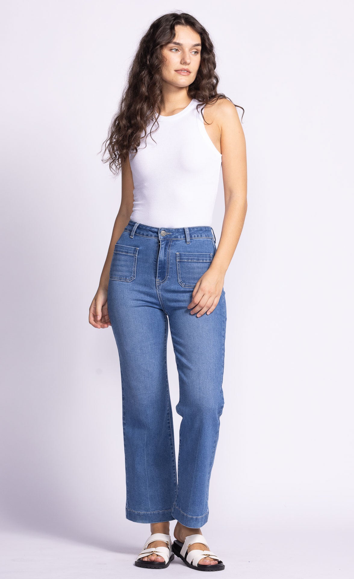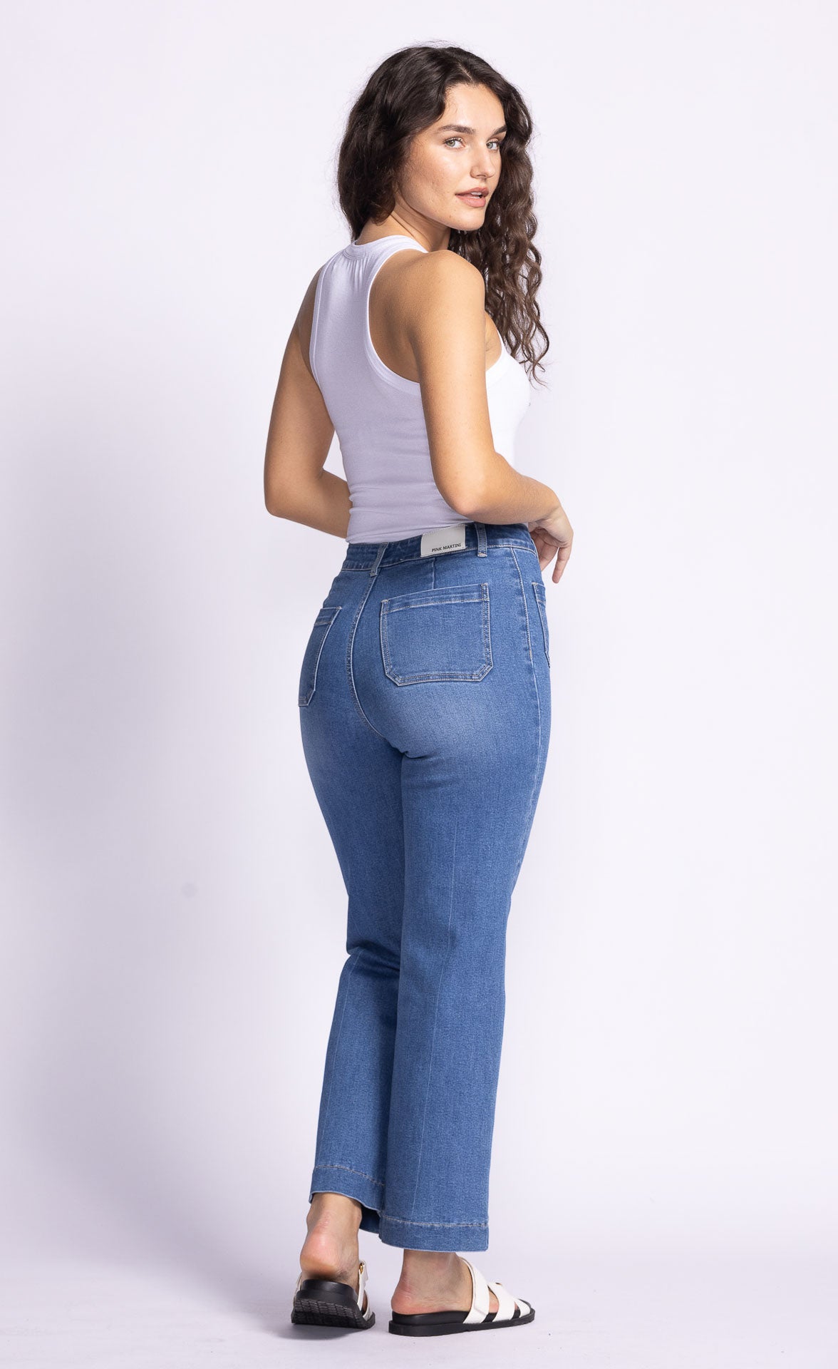 The Tiffany Denim is a straight-fit jeans with a classic zipper fly and stylish front pocket detail. Pair with a fitted top and layer with a blazer or jacket for a polished look.